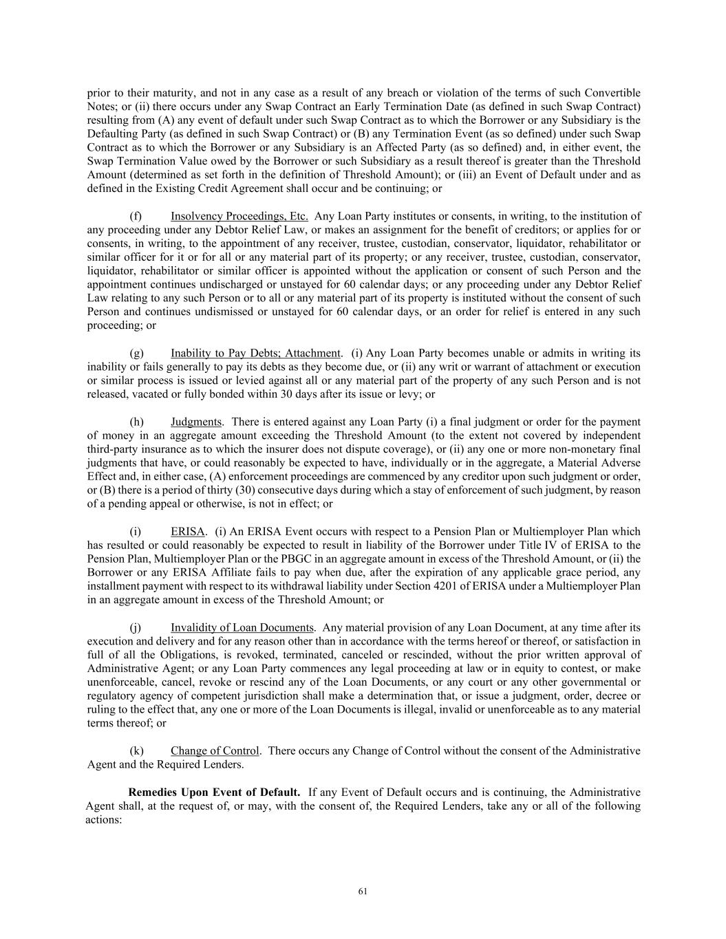 61 prior to their maturity, and not in any case as a result of any breach or violation of the terms of such Convertible Notes; or (ii) there occurs under any Swap Contract an Early Termination Date (as defined in such Swap Contract) resulting from (A) any event of default under such Swap Contract as to which the Borrower or any Subsidiary is the Defaulting Party (as defined in such Swap Contract) or (B) any Termination Event (as so defined) under such Swap Contract as to which the Borrower or any Subsidiary is an Affected Party (as so defined) and, in either event, the Swap Termination Value owed by the Borrower or such Subsidiary as a result thereof is greater than the Threshold Amount (determined as set forth in the definition of Threshold Amount); or (iii) an Event of Default under and as defined in the Existing Credit Agreement shall occur and be continuing; or (f) Insolvency Proceedings, Etc. Any Loan Party institutes or consents, in writing, to the institution of any proceeding under any Debtor Relief Law, or makes an assignment for the benefit of creditors; or applies for or consents, in writing, to the appointment of any receiver, trustee, custodian, conservator, liquidator, rehabilitator or similar officer for it or for all or any material part of its property; or any receiver, trustee, custodian, conservator, liquidator, rehabilitator or similar officer is appointed without the application or consent of such Person and the appointment continues undischarged or unstayed for 60 calendar days; or any proceeding under any Debtor Relief Law relating to any such Person or to all or any material part of its property is instituted without the consent of such Person and continues undismissed or unstayed for 60 calendar days, or an order for relief is entered in any such proceeding; or (g) Inability to Pay Debts; Attachment. (i) Any Loan Party becomes unable or admits in writing its inability or fails generally to pay its debts as they become due, or (ii) any writ or warrant of attachment or execution or similar process is issued or levied against all or any material part of the property of any such Person and is not released, vacated or fully bonded within 30 days after its issue or levy; or (h) Judgments. There is entered against any Loan Party (i) a final judgment or order for the payment of money in an aggregate amount exceeding the Threshold Amount (to the extent not covered by independent third-party insurance as to which the insurer does not dispute coverage), or (ii) any one or more non-monetary final judgments that have, or could reasonably be expected to have, individually or in the aggregate, a Material Adverse Effect and, in either case, (A) enforcement proceedings are commenced by any creditor upon such judgment or order, or (B) there is a period of thirty (30) consecutive days during which a stay of enforcement of such judgment, by reason of a pending appeal or otherwise, is not in effect; or (i) ERISA. (i) An ERISA Event occurs with respect to a Pension Plan or Multiemployer Plan which has resulted or could reasonably be expected to result in liability of the Borrower under Title IV of ERISA to the Pension Plan, Multiemployer Plan or the PBGC in an aggregate amount in excess of the Threshold Amount, or (ii) the Borrower or any ERISA Affiliate fails to pay when due, after the expiration of any applicable grace period, any installment payment with respect to its withdrawal liability under Section 4201 of ERISA under a Multiemployer Plan in an aggregate amount in excess of the Threshold Amount; or (j) Invalidity of Loan Documents. Any material provision of any Loan Document, at any time after its execution and delivery and for any reason other than in accordance with the terms hereof or thereof, or satisfaction in full of all the Obligations, is revoked, terminated, canceled or rescinded, without the prior written approval of Administrative Agent; or any Loan Party commences any legal proceeding at law or in equity to contest, or make unenforceable, cancel, revoke or rescind any of the Loan Documents, or any court or any other governmental or regulatory agency of competent jurisdiction shall make a determination that, or issue a judgment, order, decree or ruling to the effect that, any one or more of the Loan Documents is illegal, invalid or unenforceable as to any material terms thereof; or (k) Change of Control. There occurs any Change of Control without the consent of the Administrative Agent and the Required Lenders. Remedies Upon Event of Default. If any Event of Default occurs and is continuing, the Administrative Agent shall, at the request of, or may, with the consent of, the Required Lenders, take any or all of the following actions: