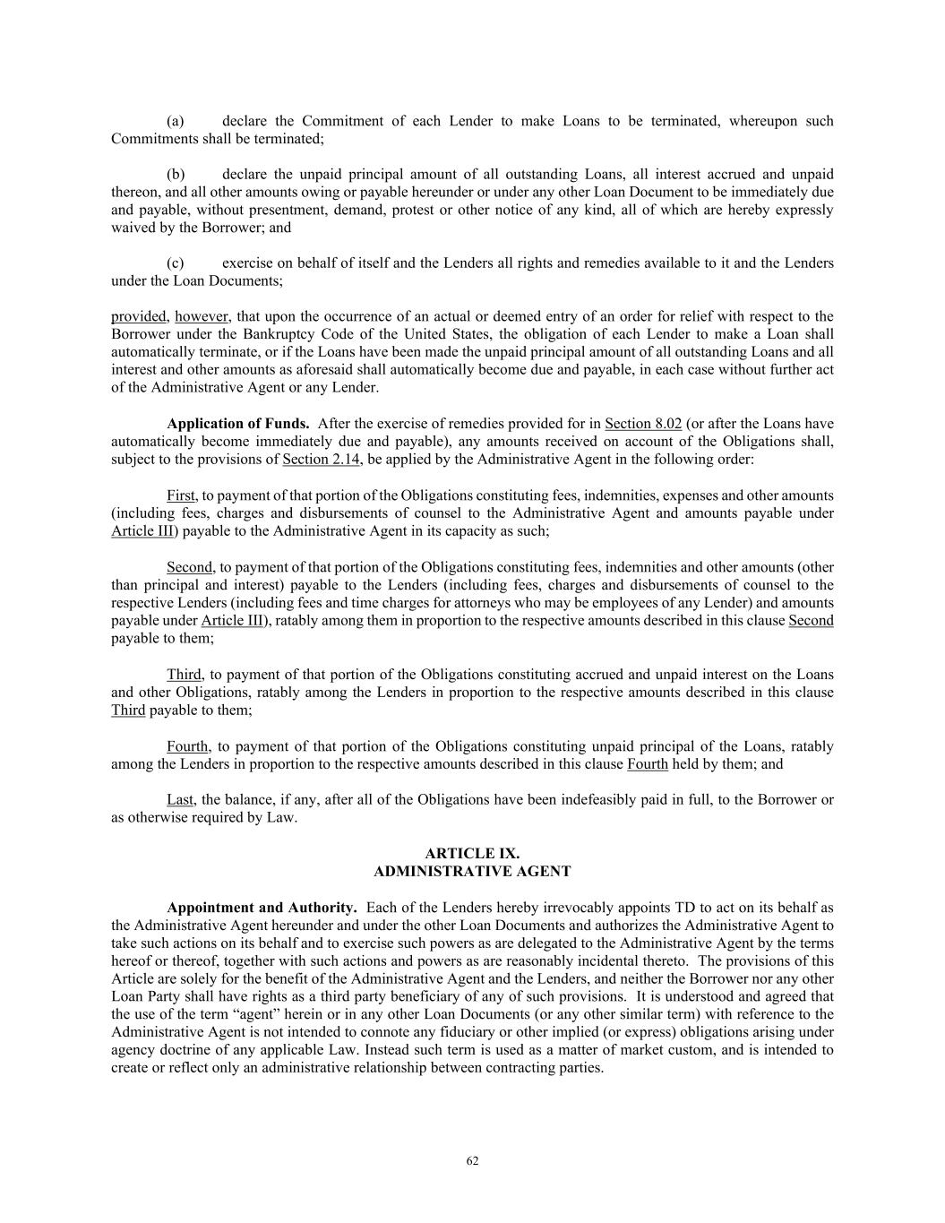 62 (a) declare the Commitment of each Lender to make Loans to be terminated, whereupon such Commitments shall be terminated; (b) declare the unpaid principal amount of all outstanding Loans, all interest accrued and unpaid thereon, and all other amounts owing or payable hereunder or under any other Loan Document to be immediately due and payable, without presentment, demand, protest or other notice of any kind, all of which are hereby expressly waived by the Borrower; and (c) exercise on behalf of itself and the Lenders all rights and remedies available to it and the Lenders under the Loan Documents; provided, however, that upon the occurrence of an actual or deemed entry of an order for relief with respect to the Borrower under the Bankruptcy Code of the United States, the obligation of each Lender to make a Loan shall automatically terminate, or if the Loans have been made the unpaid principal amount of all outstanding Loans and all interest and other amounts as aforesaid shall automatically become due and payable, in each case without further act of the Administrative Agent or any Lender. Application of Funds. After the exercise of remedies provided for in Section 8.02 (or after the Loans have automatically become immediately due and payable), any amounts received on account of the Obligations shall, subject to the provisions of Section 2.14, be applied by the Administrative Agent in the following order: First, to payment of that portion of the Obligations constituting fees, indemnities, expenses and other amounts (including fees, charges and disbursements of counsel to the Administrative Agent and amounts payable under Article III) payable to the Administrative Agent in its capacity as such; Second, to payment of that portion of the Obligations constituting fees, indemnities and other amounts (other than principal and interest) payable to the Lenders (including fees, charges and disbursements of counsel to the respective Lenders (including fees and time charges for attorneys who may be employees of any Lender) and amounts payable under Article III), ratably among them in proportion to the respective amounts described in this clause Second payable to them; Third, to payment of that portion of the Obligations constituting accrued and unpaid interest on the Loans and other Obligations, ratably among the Lenders in proportion to the respective amounts described in this clause Third payable to them; Fourth, to payment of that portion of the Obligations constituting unpaid principal of the Loans, ratably among the Lenders in proportion to the respective amounts described in this clause Fourth held by them; and Last, the balance, if any, after all of the Obligations have been indefeasibly paid in full, to the Borrower or as otherwise required by Law. ARTICLE IX. ADMINISTRATIVE AGENT Appointment and Authority. Each of the Lenders hereby irrevocably appoints TD to act on its behalf as the Administrative Agent hereunder and under the other Loan Documents and authorizes the Administrative Agent to take such actions on its behalf and to exercise such powers as are delegated to the Administrative Agent by the terms hereof or thereof, together with such actions and powers as are reasonably incidental thereto. The provisions of this Article are solely for the benefit of the Administrative Agent and the Lenders, and neither the Borrower nor any other Loan Party shall have rights as a third party beneficiary of any of such provisions. It is understood and agreed that the use of the term “agent” herein or in any other Loan Documents (or any other similar term) with reference to the Administrative Agent is not intended to connote any fiduciary or other implied (or express) obligations arising under agency doctrine of any applicable Law. Instead such term is used as a matter of market custom, and is intended to create or reflect only an administrative relationship between contracting parties.