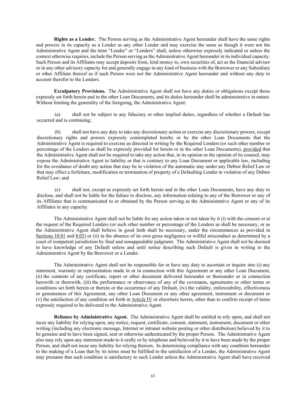 63 Rights as a Lender. The Person serving as the Administrative Agent hereunder shall have the same rights and powers in its capacity as a Lender as any other Lender and may exercise the same as though it were not the Administrative Agent and the term “Lender” or “Lenders” shall, unless otherwise expressly indicated or unless the context otherwise requires, include the Person serving as the Administrative Agent hereunder in its individual capacity. Such Person and its Affiliates may accept deposits from, lend money to, own securities of, act as the financial advisor or in any other advisory capacity for and generally engage in any kind of business with the Borrower or any Subsidiary or other Affiliate thereof as if such Person were not the Administrative Agent hereunder and without any duty to account therefor to the Lenders. Exculpatory Provisions. The Administrative Agent shall not have any duties or obligations except those expressly set forth herein and in the other Loan Documents, and its duties hereunder shall be administrative in nature. Without limiting the generality of the foregoing, the Administrative Agent: (a) shall not be subject to any fiduciary or other implied duties, regardless of whether a Default has occurred and is continuing; (b) shall not have any duty to take any discretionary action or exercise any discretionary powers, except discretionary rights and powers expressly contemplated hereby or by the other Loan Documents that the Administrative Agent is required to exercise as directed in writing by the Required Lenders (or such other number or percentage of the Lenders as shall be expressly provided for herein or in the other Loan Documents), provided that the Administrative Agent shall not be required to take any action that, in its opinion or the opinion of its counsel, may expose the Administrative Agent to liability or that is contrary to any Loan Document or applicable law, including for the avoidance of doubt any action that may be in violation of the automatic stay under any Debtor Relief Law or that may effect a forfeiture, modification or termination of property of a Defaulting Lender in violation of any Debtor Relief Law; and (c) shall not, except as expressly set forth herein and in the other Loan Documents, have any duty to disclose, and shall not be liable for the failure to disclose, any information relating to any of the Borrower or any of its Affiliates that is communicated to or obtained by the Person serving as the Administrative Agent or any of its Affiliates in any capacity. The Administrative Agent shall not be liable for any action taken or not taken by it (i) with the consent or at the request of the Required Lenders (or such other number or percentage of the Lenders as shall be necessary, or as the Administrative Agent shall believe in good faith shall be necessary, under the circumstances as provided in Sections 10.01 and 8.02) or (ii) in the absence of its own gross negligence or willful misconduct as determined by a court of competent jurisdiction by final and nonappealable judgment. The Administrative Agent shall not be deemed to have knowledge of any Default unless and until notice describing such Default is given in writing to the Administrative Agent by the Borrower or a Lender. The Administrative Agent shall not be responsible for or have any duty to ascertain or inquire into (i) any statement, warranty or representation made in or in connection with this Agreement or any other Loan Document, (ii) the contents of any certificate, report or other document delivered hereunder or thereunder or in connection herewith or therewith, (iii) the performance or observance of any of the covenants, agreements or other terms or conditions set forth herein or therein or the occurrence of any Default, (iv) the validity, enforceability, effectiveness or genuineness of this Agreement, any other Loan Document or any other agreement, instrument or document or (v) the satisfaction of any condition set forth in Article IV or elsewhere herein, other than to confirm receipt of items expressly required to be delivered to the Administrative Agent. Reliance by Administrative Agent. The Administrative Agent shall be entitled to rely upon, and shall not incur any liability for relying upon, any notice, request, certificate, consent, statement, instrument, document or other writing (including any electronic message, Internet or intranet website posting or other distribution) believed by it to be genuine and to have been signed, sent or otherwise authenticated by the proper Person. The Administrative Agent also may rely upon any statement made to it orally or by telephone and believed by it to have been made by the proper Person, and shall not incur any liability for relying thereon. In determining compliance with any condition hereunder to the making of a Loan that by its terms must be fulfilled to the satisfaction of a Lender, the Administrative Agent may presume that such condition is satisfactory to such Lender unless the Administrative Agent shall have received