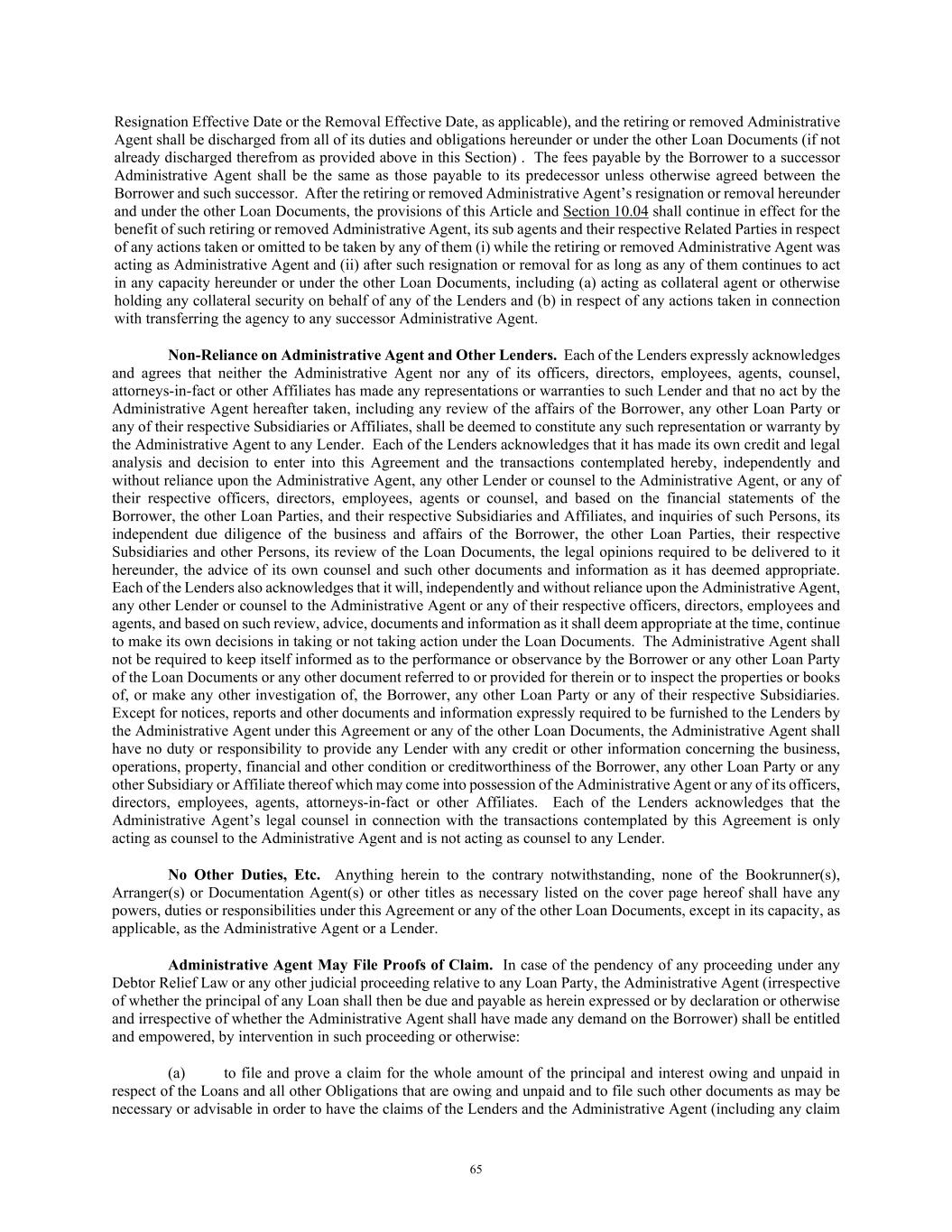 65 Resignation Effective Date or the Removal Effective Date, as applicable), and the retiring or removed Administrative Agent shall be discharged from all of its duties and obligations hereunder or under the other Loan Documents (if not already discharged therefrom as provided above in this Section) . The fees payable by the Borrower to a successor Administrative Agent shall be the same as those payable to its predecessor unless otherwise agreed between the Borrower and such successor. After the retiring or removed Administrative Agent’s resignation or removal hereunder and under the other Loan Documents, the provisions of this Article and Section 10.04 shall continue in effect for the benefit of such retiring or removed Administrative Agent, its sub agents and their respective Related Parties in respect of any actions taken or omitted to be taken by any of them (i) while the retiring or removed Administrative Agent was acting as Administrative Agent and (ii) after such resignation or removal for as long as any of them continues to act in any capacity hereunder or under the other Loan Documents, including (a) acting as collateral agent or otherwise holding any collateral security on behalf of any of the Lenders and (b) in respect of any actions taken in connection with transferring the agency to any successor Administrative Agent. Non-Reliance on Administrative Agent and Other Lenders. Each of the Lenders expressly acknowledges and agrees that neither the Administrative Agent nor any of its officers, directors, employees, agents, counsel, attorneys-in-fact or other Affiliates has made any representations or warranties to such Lender and that no act by the Administrative Agent hereafter taken, including any review of the affairs of the Borrower, any other Loan Party or any of their respective Subsidiaries or Affiliates, shall be deemed to constitute any such representation or warranty by the Administrative Agent to any Lender. Each of the Lenders acknowledges that it has made its own credit and legal analysis and decision to enter into this Agreement and the transactions contemplated hereby, independently and without reliance upon the Administrative Agent, any other Lender or counsel to the Administrative Agent, or any of their respective officers, directors, employees, agents or counsel, and based on the financial statements of the Borrower, the other Loan Parties, and their respective Subsidiaries and Affiliates, and inquiries of such Persons, its independent due diligence of the business and affairs of the Borrower, the other Loan Parties, their respective Subsidiaries and other Persons, its review of the Loan Documents, the legal opinions required to be delivered to it hereunder, the advice of its own counsel and such other documents and information as it has deemed appropriate. Each of the Lenders also acknowledges that it will, independently and without reliance upon the Administrative Agent, any other Lender or counsel to the Administrative Agent or any of their respective officers, directors, employees and agents, and based on such review, advice, documents and information as it shall deem appropriate at the time, continue to make its own decisions in taking or not taking action under the Loan Documents. The Administrative Agent shall not be required to keep itself informed as to the performance or observance by the Borrower or any other Loan Party of the Loan Documents or any other document referred to or provided for therein or to inspect the properties or books of, or make any other investigation of, the Borrower, any other Loan Party or any of their respective Subsidiaries. Except for notices, reports and other documents and information expressly required to be furnished to the Lenders by the Administrative Agent under this Agreement or any of the other Loan Documents, the Administrative Agent shall have no duty or responsibility to provide any Lender with any credit or other information concerning the business, operations, property, financial and other condition or creditworthiness of the Borrower, any other Loan Party or any other Subsidiary or Affiliate thereof which may come into possession of the Administrative Agent or any of its officers, directors, employees, agents, attorneys-in-fact or other Affiliates. Each of the Lenders acknowledges that the Administrative Agent’s legal counsel in connection with the transactions contemplated by this Agreement is only acting as counsel to the Administrative Agent and is not acting as counsel to any Lender. No Other Duties, Etc. Anything herein to the contrary notwithstanding, none of the Bookrunner(s), Arranger(s) or Documentation Agent(s) or other titles as necessary listed on the cover page hereof shall have any powers, duties or responsibilities under this Agreement or any of the other Loan Documents, except in its capacity, as applicable, as the Administrative Agent or a Lender. Administrative Agent May File Proofs of Claim. In case of the pendency of any proceeding under any Debtor Relief Law or any other judicial proceeding relative to any Loan Party, the Administrative Agent (irrespective of whether the principal of any Loan shall then be due and payable as herein expressed or by declaration or otherwise and irrespective of whether the Administrative Agent shall have made any demand on the Borrower) shall be entitled and empowered, by intervention in such proceeding or otherwise: (a) to file and prove a claim for the whole amount of the principal and interest owing and unpaid in respect of the Loans and all other Obligations that are owing and unpaid and to file such other documents as may be necessary or advisable in order to have the claims of the Lenders and the Administrative Agent (including any claim