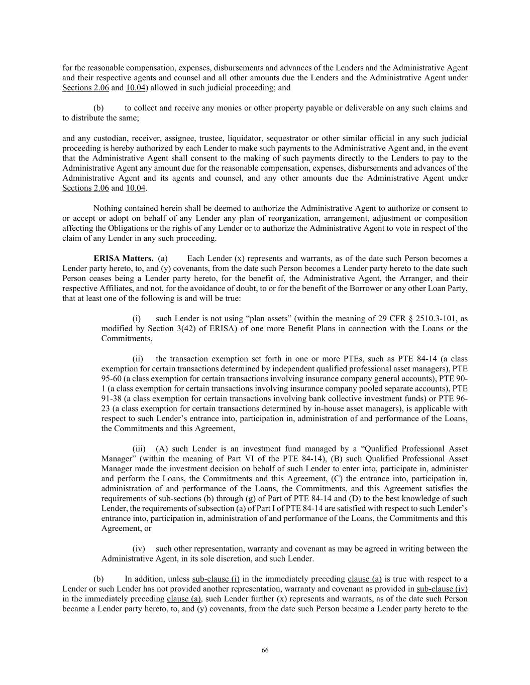 66 for the reasonable compensation, expenses, disbursements and advances of the Lenders and the Administrative Agent and their respective agents and counsel and all other amounts due the Lenders and the Administrative Agent under Sections 2.06 and 10.04) allowed in such judicial proceeding; and (b) to collect and receive any monies or other property payable or deliverable on any such claims and to distribute the same; and any custodian, receiver, assignee, trustee, liquidator, sequestrator or other similar official in any such judicial proceeding is hereby authorized by each Lender to make such payments to the Administrative Agent and, in the event that the Administrative Agent shall consent to the making of such payments directly to the Lenders to pay to the Administrative Agent any amount due for the reasonable compensation, expenses, disbursements and advances of the Administrative Agent and its agents and counsel, and any other amounts due the Administrative Agent under Sections 2.06 and 10.04. Nothing contained herein shall be deemed to authorize the Administrative Agent to authorize or consent to or accept or adopt on behalf of any Lender any plan of reorganization, arrangement, adjustment or composition affecting the Obligations or the rights of any Lender or to authorize the Administrative Agent to vote in respect of the claim of any Lender in any such proceeding. ERISA Matters. (a) Each Lender (x) represents and warrants, as of the date such Person becomes a Lender party hereto, to, and (y) covenants, from the date such Person becomes a Lender party hereto to the date such Person ceases being a Lender party hereto, for the benefit of, the Administrative Agent, the Arranger, and their respective Affiliates, and not, for the avoidance of doubt, to or for the benefit of the Borrower or any other Loan Party, that at least one of the following is and will be true: (i) such Lender is not using “plan assets” (within the meaning of 29 CFR § 2510.3-101, as modified by Section 3(42) of ERISA) of one more Benefit Plans in connection with the Loans or the Commitments, (ii) the transaction exemption set forth in one or more PTEs, such as PTE 84-14 (a class exemption for certain transactions determined by independent qualified professional asset managers), PTE 95-60 (a class exemption for certain transactions involving insurance company general accounts), PTE 90- 1 (a class exemption for certain transactions involving insurance company pooled separate accounts), PTE 91-38 (a class exemption for certain transactions involving bank collective investment funds) or PTE 96- 23 (a class exemption for certain transactions determined by in-house asset managers), is applicable with respect to such Lender’s entrance into, participation in, administration of and performance of the Loans, the Commitments and this Agreement, (iii) (A) such Lender is an investment fund managed by a “Qualified Professional Asset Manager” (within the meaning of Part VI of the PTE 84-14), (B) such Qualified Professional Asset Manager made the investment decision on behalf of such Lender to enter into, participate in, administer and perform the Loans, the Commitments and this Agreement, (C) the entrance into, participation in, administration of and performance of the Loans, the Commitments, and this Agreement satisfies the requirements of sub-sections (b) through (g) of Part of PTE 84-14 and (D) to the best knowledge of such Lender, the requirements of subsection (a) of Part I of PTE 84-14 are satisfied with respect to such Lender’s entrance into, participation in, administration of and performance of the Loans, the Commitments and this Agreement, or (iv) such other representation, warranty and covenant as may be agreed in writing between the Administrative Agent, in its sole discretion, and such Lender. (b) In addition, unless sub-clause (i) in the immediately preceding clause (a) is true with respect to a Lender or such Lender has not provided another representation, warranty and covenant as provided in sub-clause (iv) in the immediately preceding clause (a), such Lender further (x) represents and warrants, as of the date such Person became a Lender party hereto, to, and (y) covenants, from the date such Person became a Lender party hereto to the