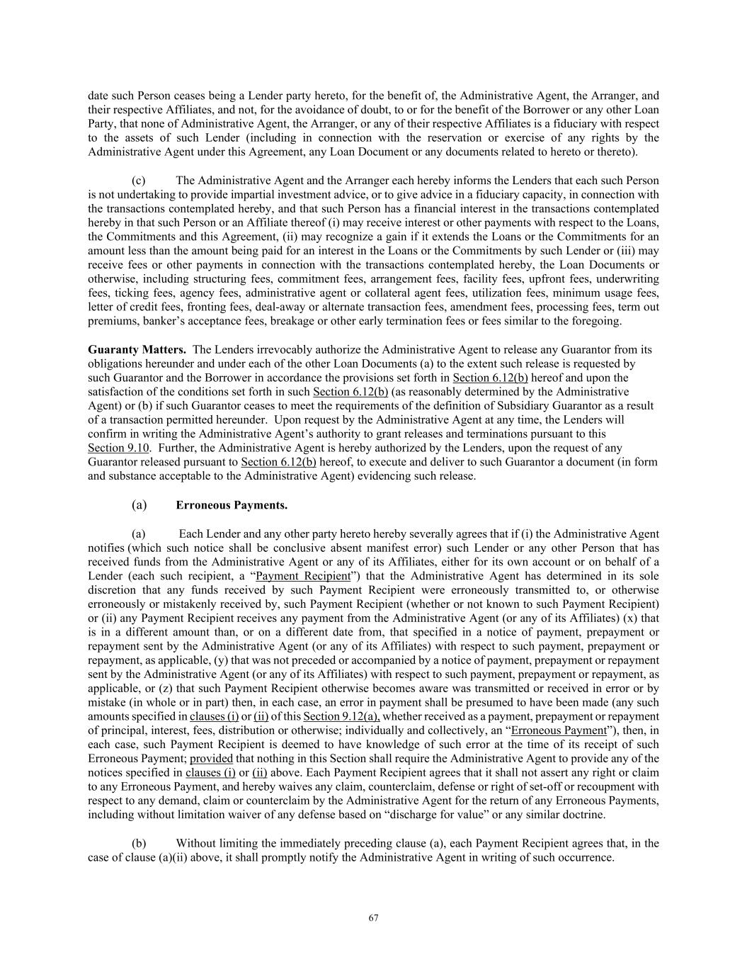 67 date such Person ceases being a Lender party hereto, for the benefit of, the Administrative Agent, the Arranger, and their respective Affiliates, and not, for the avoidance of doubt, to or for the benefit of the Borrower or any other Loan Party, that none of Administrative Agent, the Arranger, or any of their respective Affiliates is a fiduciary with respect to the assets of such Lender (including in connection with the reservation or exercise of any rights by the Administrative Agent under this Agreement, any Loan Document or any documents related to hereto or thereto). (c) The Administrative Agent and the Arranger each hereby informs the Lenders that each such Person is not undertaking to provide impartial investment advice, or to give advice in a fiduciary capacity, in connection with the transactions contemplated hereby, and that such Person has a financial interest in the transactions contemplated hereby in that such Person or an Affiliate thereof (i) may receive interest or other payments with respect to the Loans, the Commitments and this Agreement, (ii) may recognize a gain if it extends the Loans or the Commitments for an amount less than the amount being paid for an interest in the Loans or the Commitments by such Lender or (iii) may receive fees or other payments in connection with the transactions contemplated hereby, the Loan Documents or otherwise, including structuring fees, commitment fees, arrangement fees, facility fees, upfront fees, underwriting fees, ticking fees, agency fees, administrative agent or collateral agent fees, utilization fees, minimum usage fees, letter of credit fees, fronting fees, deal-away or alternate transaction fees, amendment fees, processing fees, term out premiums, banker’s acceptance fees, breakage or other early termination fees or fees similar to the foregoing. Guaranty Matters. The Lenders irrevocably authorize the Administrative Agent to release any Guarantor from its obligations hereunder and under each of the other Loan Documents (a) to the extent such release is requested by such Guarantor and the Borrower in accordance the provisions set forth in Section 6.12(b) hereof and upon the satisfaction of the conditions set forth in such Section 6.12(b) (as reasonably determined by the Administrative Agent) or (b) if such Guarantor ceases to meet the requirements of the definition of Subsidiary Guarantor as a result of a transaction permitted hereunder. Upon request by the Administrative Agent at any time, the Lenders will confirm in writing the Administrative Agent’s authority to grant releases and terminations pursuant to this Section 9.10. Further, the Administrative Agent is hereby authorized by the Lenders, upon the request of any Guarantor released pursuant to Section 6.12(b) hereof, to execute and deliver to such Guarantor a document (in form and substance acceptable to the Administrative Agent) evidencing such release. (a) Erroneous Payments. (a) Each Lender and any other party hereto hereby severally agrees that if (i) the Administrative Agent notifies (which such notice shall be conclusive absent manifest error) such Lender or any other Person that has received funds from the Administrative Agent or any of its Affiliates, either for its own account or on behalf of a Lender (each such recipient, a “Payment Recipient”) that the Administrative Agent has determined in its sole discretion that any funds received by such Payment Recipient were erroneously transmitted to, or otherwise erroneously or mistakenly received by, such Payment Recipient (whether or not known to such Payment Recipient) or (ii) any Payment Recipient receives any payment from the Administrative Agent (or any of its Affiliates) (x) that is in a different amount than, or on a different date from, that specified in a notice of payment, prepayment or repayment sent by the Administrative Agent (or any of its Affiliates) with respect to such payment, prepayment or repayment, as applicable, (y) that was not preceded or accompanied by a notice of payment, prepayment or repayment sent by the Administrative Agent (or any of its Affiliates) with respect to such payment, prepayment or repayment, as applicable, or (z) that such Payment Recipient otherwise becomes aware was transmitted or received in error or by mistake (in whole or in part) then, in each case, an error in payment shall be presumed to have been made (any such amounts specified in clauses (i) or (ii) of this Section 9.12(a), whether received as a payment, prepayment or repayment of principal, interest, fees, distribution or otherwise; individually and collectively, an “Erroneous Payment”), then, in each case, such Payment Recipient is deemed to have knowledge of such error at the time of its receipt of such Erroneous Payment; provided that nothing in this Section shall require the Administrative Agent to provide any of the notices specified in clauses (i) or (ii) above. Each Payment Recipient agrees that it shall not assert any right or claim to any Erroneous Payment, and hereby waives any claim, counterclaim, defense or right of set-off or recoupment with respect to any demand, claim or counterclaim by the Administrative Agent for the return of any Erroneous Payments, including without limitation waiver of any defense based on “discharge for value” or any similar doctrine. (b) Without limiting the immediately preceding clause (a), each Payment Recipient agrees that, in the case of clause (a)(ii) above, it shall promptly notify the Administrative Agent in writing of such occurrence.