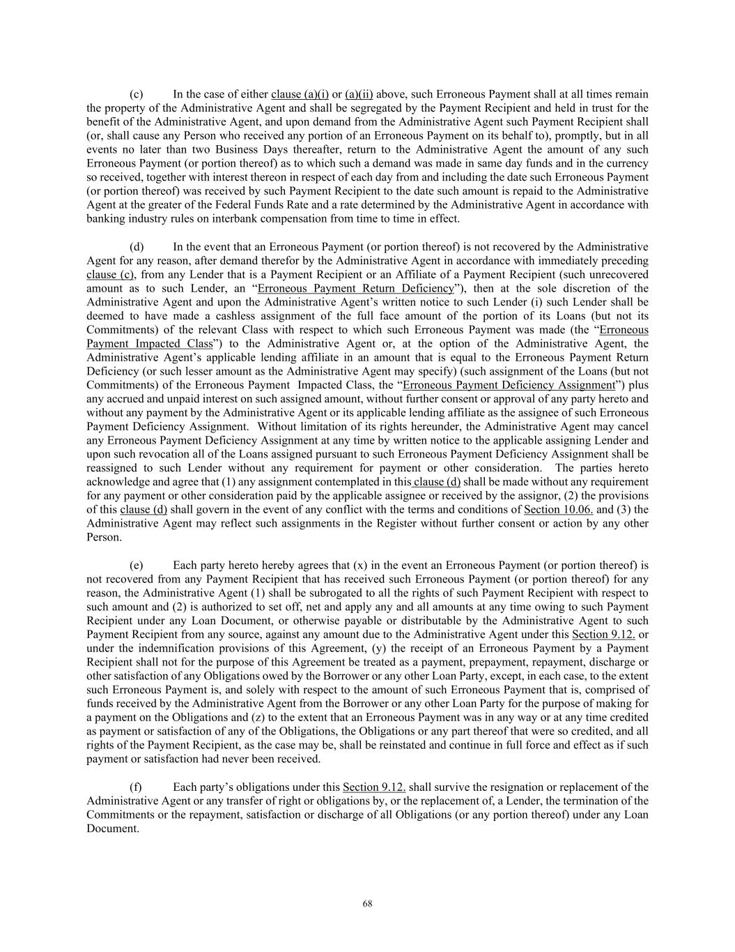 68 (c) In the case of either clause (a)(i) or (a)(ii) above, such Erroneous Payment shall at all times remain the property of the Administrative Agent and shall be segregated by the Payment Recipient and held in trust for the benefit of the Administrative Agent, and upon demand from the Administrative Agent such Payment Recipient shall (or, shall cause any Person who received any portion of an Erroneous Payment on its behalf to), promptly, but in all events no later than two Business Days thereafter, return to the Administrative Agent the amount of any such Erroneous Payment (or portion thereof) as to which such a demand was made in same day funds and in the currency so received, together with interest thereon in respect of each day from and including the date such Erroneous Payment (or portion thereof) was received by such Payment Recipient to the date such amount is repaid to the Administrative Agent at the greater of the Federal Funds Rate and a rate determined by the Administrative Agent in accordance with banking industry rules on interbank compensation from time to time in effect. (d) In the event that an Erroneous Payment (or portion thereof) is not recovered by the Administrative Agent for any reason, after demand therefor by the Administrative Agent in accordance with immediately preceding clause (c), from any Lender that is a Payment Recipient or an Affiliate of a Payment Recipient (such unrecovered amount as to such Lender, an “Erroneous Payment Return Deficiency”), then at the sole discretion of the Administrative Agent and upon the Administrative Agent’s written notice to such Lender (i) such Lender shall be deemed to have made a cashless assignment of the full face amount of the portion of its Loans (but not its Commitments) of the relevant Class with respect to which such Erroneous Payment was made (the “Erroneous Payment Impacted Class”) to the Administrative Agent or, at the option of the Administrative Agent, the Administrative Agent’s applicable lending affiliate in an amount that is equal to the Erroneous Payment Return Deficiency (or such lesser amount as the Administrative Agent may specify) (such assignment of the Loans (but not Commitments) of the Erroneous Payment Impacted Class, the “Erroneous Payment Deficiency Assignment”) plus any accrued and unpaid interest on such assigned amount, without further consent or approval of any party hereto and without any payment by the Administrative Agent or its applicable lending affiliate as the assignee of such Erroneous Payment Deficiency Assignment. Without limitation of its rights hereunder, the Administrative Agent may cancel any Erroneous Payment Deficiency Assignment at any time by written notice to the applicable assigning Lender and upon such revocation all of the Loans assigned pursuant to such Erroneous Payment Deficiency Assignment shall be reassigned to such Lender without any requirement for payment or other consideration. The parties hereto acknowledge and agree that (1) any assignment contemplated in this clause (d) shall be made without any requirement for any payment or other consideration paid by the applicable assignee or received by the assignor, (2) the provisions of this clause (d) shall govern in the event of any conflict with the terms and conditions of Section 10.06. and (3) the Administrative Agent may reflect such assignments in the Register without further consent or action by any other Person. (e) Each party hereto hereby agrees that (x) in the event an Erroneous Payment (or portion thereof) is not recovered from any Payment Recipient that has received such Erroneous Payment (or portion thereof) for any reason, the Administrative Agent (1) shall be subrogated to all the rights of such Payment Recipient with respect to such amount and (2) is authorized to set off, net and apply any and all amounts at any time owing to such Payment Recipient under any Loan Document, or otherwise payable or distributable by the Administrative Agent to such Payment Recipient from any source, against any amount due to the Administrative Agent under this Section 9.12. or under the indemnification provisions of this Agreement, (y) the receipt of an Erroneous Payment by a Payment Recipient shall not for the purpose of this Agreement be treated as a payment, prepayment, repayment, discharge or other satisfaction of any Obligations owed by the Borrower or any other Loan Party, except, in each case, to the extent such Erroneous Payment is, and solely with respect to the amount of such Erroneous Payment that is, comprised of funds received by the Administrative Agent from the Borrower or any other Loan Party for the purpose of making for a payment on the Obligations and (z) to the extent that an Erroneous Payment was in any way or at any time credited as payment or satisfaction of any of the Obligations, the Obligations or any part thereof that were so credited, and all rights of the Payment Recipient, as the case may be, shall be reinstated and continue in full force and effect as if such payment or satisfaction had never been received. (f) Each party’s obligations under this Section 9.12. shall survive the resignation or replacement of the Administrative Agent or any transfer of right or obligations by, or the replacement of, a Lender, the termination of the Commitments or the repayment, satisfaction or discharge of all Obligations (or any portion thereof) under any Loan Document.