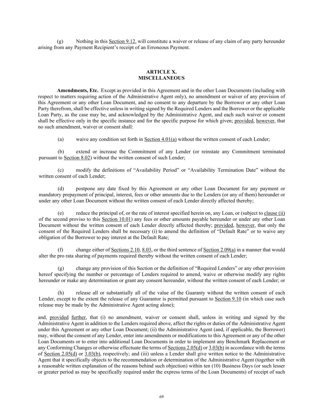 69 (g) Nothing in this Section 9.12. will constitute a waiver or release of any claim of any party hereunder arising from any Payment Recipient’s receipt of an Erroneous Payment. ARTICLE X. MISCELLANEOUS Amendments, Etc. Except as provided in this Agreement and in the other Loan Documents (including with respect to matters requiring action of the Administrative Agent only), no amendment or waiver of any provision of this Agreement or any other Loan Document, and no consent to any departure by the Borrower or any other Loan Party therefrom, shall be effective unless in writing signed by the Required Lenders and the Borrower or the applicable Loan Party, as the case may be, and acknowledged by the Administrative Agent, and each such waiver or consent shall be effective only in the specific instance and for the specific purpose for which given; provided, however, that no such amendment, waiver or consent shall: (a) waive any condition set forth in Section 4.01(a) without the written consent of each Lender; (b) extend or increase the Commitment of any Lender (or reinstate any Commitment terminated pursuant to Section 8.02) without the written consent of such Lender; (c) modify the definitions of “Availability Period” or “Availability Termination Date” without the written consent of each Lender; (d) postpone any date fixed by this Agreement or any other Loan Document for any payment or mandatory prepayment of principal, interest, fees or other amounts due to the Lenders (or any of them) hereunder or under any other Loan Document without the written consent of each Lender directly affected thereby; (e) reduce the principal of, or the rate of interest specified herein on, any Loan, or (subject to clause (ii) of the second proviso to this Section 10.01) any fees or other amounts payable hereunder or under any other Loan Document without the written consent of each Lender directly affected thereby; provided, however, that only the consent of the Required Lenders shall be necessary (i) to amend the definition of “Default Rate” or to waive any obligation of the Borrower to pay interest at the Default Rate; (f) change either of Sections 2.10, 8.03, or the third sentence of Section 2.09(a) in a manner that would alter the pro rata sharing of payments required thereby without the written consent of each Lender; (g) change any provision of this Section or the definition of “Required Lenders” or any other provision hereof specifying the number or percentage of Lenders required to amend, waive or otherwise modify any rights hereunder or make any determination or grant any consent hereunder, without the written consent of each Lender; or (h) release all or substantially all of the value of the Guaranty without the written consent of each Lender, except to the extent the release of any Guarantor is permitted pursuant to Section 9.10 (in which case such release may be made by the Administrative Agent acting alone); and, provided further, that (i) no amendment, waiver or consent shall, unless in writing and signed by the Administrative Agent in addition to the Lenders required above, affect the rights or duties of the Administrative Agent under this Agreement or any other Loan Document; (ii) the Administrative Agent (and, if applicable, the Borrower) may, without the consent of any Lender, enter into amendments or modifications to this Agreement or any of the other Loan Documents or to enter into additional Loan Documents in order to implement any Benchmark Replacement or any Conforming Changes or otherwise effectuate the terms of Sections 2.05(d) or 3.03(b) in accordance with the terms of Section 2.05(d) or 3.03(b), respectively; and (iii) unless a Lender shall give written notice to the Administrative Agent that it specifically objects to the recommendation or determination of the Administrative Agent (together with a reasonable written explanation of the reasons behind such objection) within ten (10) Business Days (or such lesser or greater period as may be specifically required under the express terms of the Loan Documents) of receipt of such