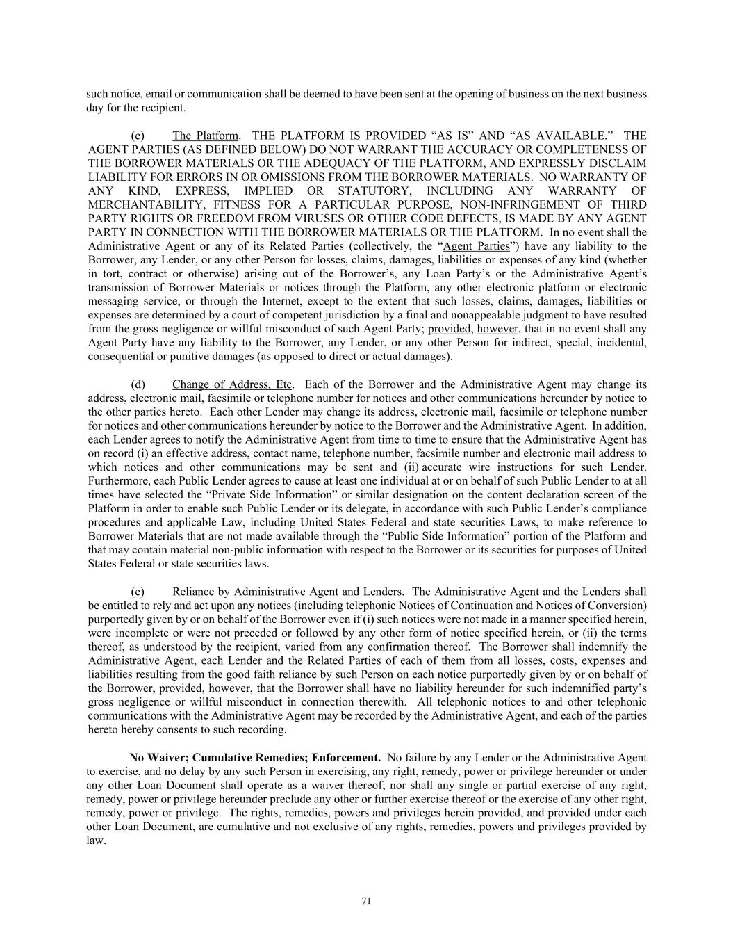 71 such notice, email or communication shall be deemed to have been sent at the opening of business on the next business day for the recipient. (c) The Platform. THE PLATFORM IS PROVIDED “AS IS” AND “AS AVAILABLE.” THE AGENT PARTIES (AS DEFINED BELOW) DO NOT WARRANT THE ACCURACY OR COMPLETENESS OF THE BORROWER MATERIALS OR THE ADEQUACY OF THE PLATFORM, AND EXPRESSLY DISCLAIM LIABILITY FOR ERRORS IN OR OMISSIONS FROM THE BORROWER MATERIALS. NO WARRANTY OF ANY KIND, EXPRESS, IMPLIED OR STATUTORY, INCLUDING ANY WARRANTY OF MERCHANTABILITY, FITNESS FOR A PARTICULAR PURPOSE, NON-INFRINGEMENT OF THIRD PARTY RIGHTS OR FREEDOM FROM VIRUSES OR OTHER CODE DEFECTS, IS MADE BY ANY AGENT PARTY IN CONNECTION WITH THE BORROWER MATERIALS OR THE PLATFORM. In no event shall the Administrative Agent or any of its Related Parties (collectively, the “Agent Parties”) have any liability to the Borrower, any Lender, or any other Person for losses, claims, damages, liabilities or expenses of any kind (whether in tort, contract or otherwise) arising out of the Borrower’s, any Loan Party’s or the Administrative Agent’s transmission of Borrower Materials or notices through the Platform, any other electronic platform or electronic messaging service, or through the Internet, except to the extent that such losses, claims, damages, liabilities or expenses are determined by a court of competent jurisdiction by a final and nonappealable judgment to have resulted from the gross negligence or willful misconduct of such Agent Party; provided, however, that in no event shall any Agent Party have any liability to the Borrower, any Lender, or any other Person for indirect, special, incidental, consequential or punitive damages (as opposed to direct or actual damages). (d) Change of Address, Etc. Each of the Borrower and the Administrative Agent may change its address, electronic mail, facsimile or telephone number for notices and other communications hereunder by notice to the other parties hereto. Each other Lender may change its address, electronic mail, facsimile or telephone number for notices and other communications hereunder by notice to the Borrower and the Administrative Agent. In addition, each Lender agrees to notify the Administrative Agent from time to time to ensure that the Administrative Agent has on record (i) an effective address, contact name, telephone number, facsimile number and electronic mail address to which notices and other communications may be sent and (ii) accurate wire instructions for such Lender. Furthermore, each Public Lender agrees to cause at least one individual at or on behalf of such Public Lender to at all times have selected the “Private Side Information” or similar designation on the content declaration screen of the Platform in order to enable such Public Lender or its delegate, in accordance with such Public Lender’s compliance procedures and applicable Law, including United States Federal and state securities Laws, to make reference to Borrower Materials that are not made available through the “Public Side Information” portion of the Platform and that may contain material non-public information with respect to the Borrower or its securities for purposes of United States Federal or state securities laws. (e) Reliance by Administrative Agent and Lenders. The Administrative Agent and the Lenders shall be entitled to rely and act upon any notices (including telephonic Notices of Continuation and Notices of Conversion) purportedly given by or on behalf of the Borrower even if (i) such notices were not made in a manner specified herein, were incomplete or were not preceded or followed by any other form of notice specified herein, or (ii) the terms thereof, as understood by the recipient, varied from any confirmation thereof. The Borrower shall indemnify the Administrative Agent, each Lender and the Related Parties of each of them from all losses, costs, expenses and liabilities resulting from the good faith reliance by such Person on each notice purportedly given by or on behalf of the Borrower, provided, however, that the Borrower shall have no liability hereunder for such indemnified party’s gross negligence or willful misconduct in connection therewith. All telephonic notices to and other telephonic communications with the Administrative Agent may be recorded by the Administrative Agent, and each of the parties hereto hereby consents to such recording. No Waiver; Cumulative Remedies; Enforcement. No failure by any Lender or the Administrative Agent to exercise, and no delay by any such Person in exercising, any right, remedy, power or privilege hereunder or under any other Loan Document shall operate as a waiver thereof; nor shall any single or partial exercise of any right, remedy, power or privilege hereunder preclude any other or further exercise thereof or the exercise of any other right, remedy, power or privilege. The rights, remedies, powers and privileges herein provided, and provided under each other Loan Document, are cumulative and not exclusive of any rights, remedies, powers and privileges provided by law.