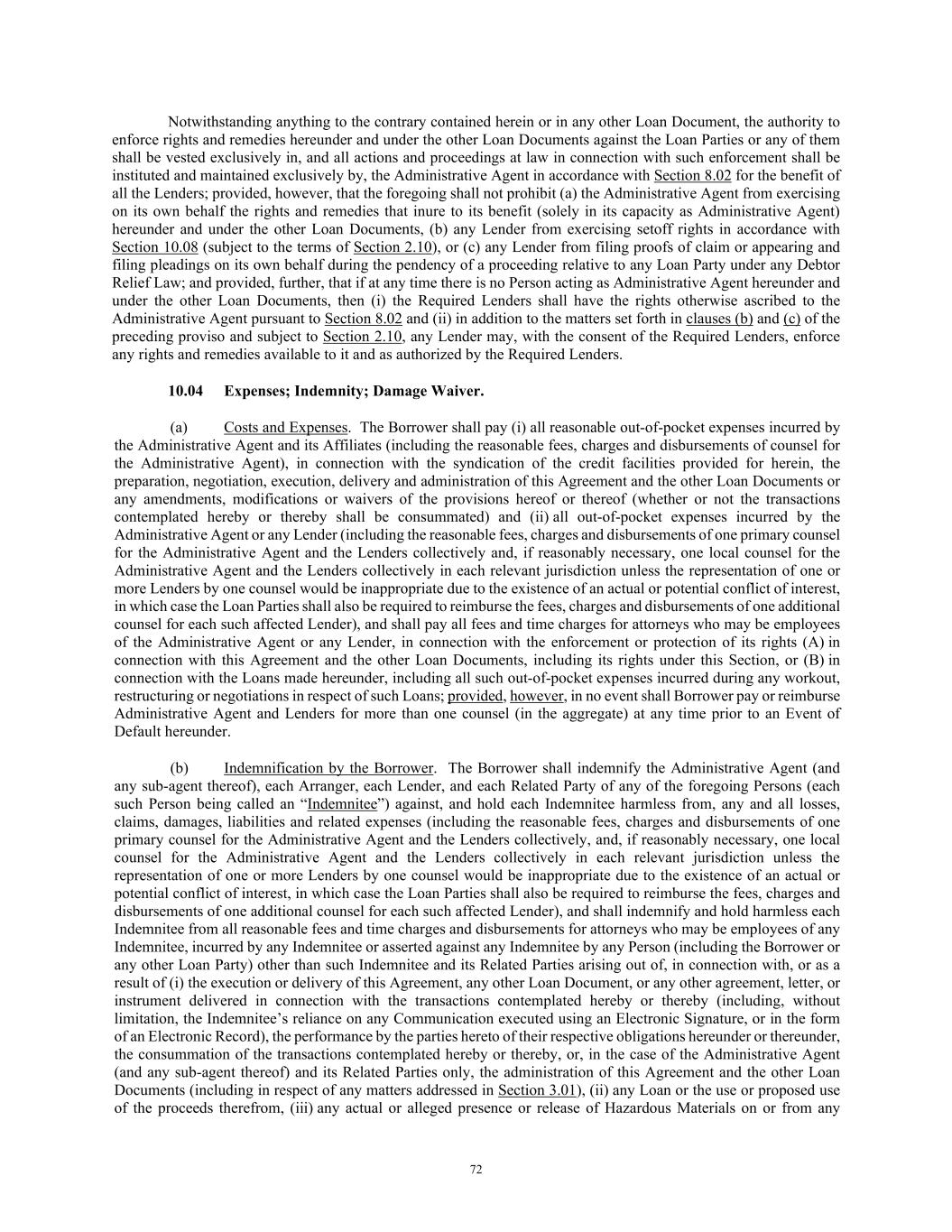 72 Notwithstanding anything to the contrary contained herein or in any other Loan Document, the authority to enforce rights and remedies hereunder and under the other Loan Documents against the Loan Parties or any of them shall be vested exclusively in, and all actions and proceedings at law in connection with such enforcement shall be instituted and maintained exclusively by, the Administrative Agent in accordance with Section 8.02 for the benefit of all the Lenders; provided, however, that the foregoing shall not prohibit (a) the Administrative Agent from exercising on its own behalf the rights and remedies that inure to its benefit (solely in its capacity as Administrative Agent) hereunder and under the other Loan Documents, (b) any Lender from exercising setoff rights in accordance with Section 10.08 (subject to the terms of Section 2.10), or (c) any Lender from filing proofs of claim or appearing and filing pleadings on its own behalf during the pendency of a proceeding relative to any Loan Party under any Debtor Relief Law; and provided, further, that if at any time there is no Person acting as Administrative Agent hereunder and under the other Loan Documents, then (i) the Required Lenders shall have the rights otherwise ascribed to the Administrative Agent pursuant to Section 8.02 and (ii) in addition to the matters set forth in clauses (b) and (c) of the preceding proviso and subject to Section 2.10, any Lender may, with the consent of the Required Lenders, enforce any rights and remedies available to it and as authorized by the Required Lenders. 10.04 Expenses; Indemnity; Damage Waiver. (a) Costs and Expenses. The Borrower shall pay (i) all reasonable out-of-pocket expenses incurred by the Administrative Agent and its Affiliates (including the reasonable fees, charges and disbursements of counsel for the Administrative Agent), in connection with the syndication of the credit facilities provided for herein, the preparation, negotiation, execution, delivery and administration of this Agreement and the other Loan Documents or any amendments, modifications or waivers of the provisions hereof or thereof (whether or not the transactions contemplated hereby or thereby shall be consummated) and (ii) all out-of-pocket expenses incurred by the Administrative Agent or any Lender (including the reasonable fees, charges and disbursements of one primary counsel for the Administrative Agent and the Lenders collectively and, if reasonably necessary, one local counsel for the Administrative Agent and the Lenders collectively in each relevant jurisdiction unless the representation of one or more Lenders by one counsel would be inappropriate due to the existence of an actual or potential conflict of interest, in which case the Loan Parties shall also be required to reimburse the fees, charges and disbursements of one additional counsel for each such affected Lender), and shall pay all fees and time charges for attorneys who may be employees of the Administrative Agent or any Lender, in connection with the enforcement or protection of its rights (A) in connection with this Agreement and the other Loan Documents, including its rights under this Section, or (B) in connection with the Loans made hereunder, including all such out-of-pocket expenses incurred during any workout, restructuring or negotiations in respect of such Loans; provided, however, in no event shall Borrower pay or reimburse Administrative Agent and Lenders for more than one counsel (in the aggregate) at any time prior to an Event of Default hereunder. (b) Indemnification by the Borrower. The Borrower shall indemnify the Administrative Agent (and any sub-agent thereof), each Arranger, each Lender, and each Related Party of any of the foregoing Persons (each such Person being called an “Indemnitee”) against, and hold each Indemnitee harmless from, any and all losses, claims, damages, liabilities and related expenses (including the reasonable fees, charges and disbursements of one primary counsel for the Administrative Agent and the Lenders collectively, and, if reasonably necessary, one local counsel for the Administrative Agent and the Lenders collectively in each relevant jurisdiction unless the representation of one or more Lenders by one counsel would be inappropriate due to the existence of an actual or potential conflict of interest, in which case the Loan Parties shall also be required to reimburse the fees, charges and disbursements of one additional counsel for each such affected Lender), and shall indemnify and hold harmless each Indemnitee from all reasonable fees and time charges and disbursements for attorneys who may be employees of any Indemnitee, incurred by any Indemnitee or asserted against any Indemnitee by any Person (including the Borrower or any other Loan Party) other than such Indemnitee and its Related Parties arising out of, in connection with, or as a result of (i) the execution or delivery of this Agreement, any other Loan Document, or any other agreement, letter, or instrument delivered in connection with the transactions contemplated hereby or thereby (including, without limitation, the Indemnitee’s reliance on any Communication executed using an Electronic Signature, or in the form of an Electronic Record), the performance by the parties hereto of their respective obligations hereunder or thereunder, the consummation of the transactions contemplated hereby or thereby, or, in the case of the Administrative Agent (and any sub-agent thereof) and its Related Parties only, the administration of this Agreement and the other Loan Documents (including in respect of any matters addressed in Section 3.01), (ii) any Loan or the use or proposed use of the proceeds therefrom, (iii) any actual or alleged presence or release of Hazardous Materials on or from any
