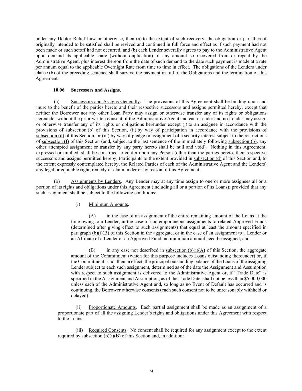 74 under any Debtor Relief Law or otherwise, then (a) to the extent of such recovery, the obligation or part thereof originally intended to be satisfied shall be revived and continued in full force and effect as if such payment had not been made or such setoff had not occurred, and (b) each Lender severally agrees to pay to the Administrative Agent upon demand its applicable share (without duplication) of any amount so recovered from or repaid by the Administrative Agent, plus interest thereon from the date of such demand to the date such payment is made at a rate per annum equal to the applicable Overnight Rate from time to time in effect. The obligations of the Lenders under clause (b) of the preceding sentence shall survive the payment in full of the Obligations and the termination of this Agreement. 10.06 Successors and Assigns. (a) Successors and Assigns Generally. The provisions of this Agreement shall be binding upon and inure to the benefit of the parties hereto and their respective successors and assigns permitted hereby, except that neither the Borrower nor any other Loan Party may assign or otherwise transfer any of its rights or obligations hereunder without the prior written consent of the Administrative Agent and each Lender and no Lender may assign or otherwise transfer any of its rights or obligations hereunder except (i) to an assignee in accordance with the provisions of subsection (b) of this Section, (ii) by way of participation in accordance with the provisions of subsection (d) of this Section, or (iii) by way of pledge or assignment of a security interest subject to the restrictions of subsection (f) of this Section (and, subject to the last sentence of the immediately following subsection (b), any other attempted assignment or transfer by any party hereto shall be null and void). Nothing in this Agreement, expressed or implied, shall be construed to confer upon any Person (other than the parties hereto, their respective successors and assigns permitted hereby, Participants to the extent provided in subsection (d) of this Section and, to the extent expressly contemplated hereby, the Related Parties of each of the Administrative Agent and the Lenders) any legal or equitable right, remedy or claim under or by reason of this Agreement. (b) Assignments by Lenders. Any Lender may at any time assign to one or more assignees all or a portion of its rights and obligations under this Agreement (including all or a portion of its Loans); provided that any such assignment shall be subject to the following conditions: (i) Minimum Amounts. (A) in the case of an assignment of the entire remaining amount of the Loans at the time owing to a Lender, in the case of contemporaneous assignments to related Approved Funds (determined after giving effect to such assignments) that equal at least the amount specified in paragraph (b)(i)(B) of this Section in the aggregate, or in the case of an assignment to a Lender or an Affiliate of a Lender or an Approved Fund, no minimum amount need be assigned; and (B) in any case not described in subsection (b)(i)(A) of this Section, the aggregate amount of the Commitment (which for this purpose includes Loans outstanding thereunder) or, if the Commitment is not then in effect, the principal outstanding balance of the Loans of the assigning Lender subject to each such assignment, determined as of the date the Assignment and Assumption with respect to such assignment is delivered to the Administrative Agent or, if “Trade Date” is specified in the Assignment and Assumption, as of the Trade Date, shall not be less than $5,000,000 unless each of the Administrative Agent and, so long as no Event of Default has occurred and is continuing, the Borrower otherwise consents (each such consent not to be unreasonably withheld or delayed). (ii) Proportionate Amounts. Each partial assignment shall be made as an assignment of a proportionate part of all the assigning Lender’s rights and obligations under this Agreement with respect to the Loans. (iii) Required Consents. No consent shall be required for any assignment except to the extent required by subsection (b)(i)(B) of this Section and, in addition: