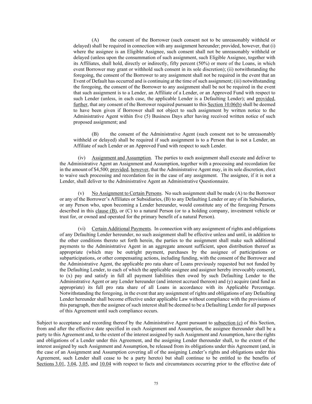 75 (A) the consent of the Borrower (such consent not to be unreasonably withheld or delayed) shall be required in connection with any assignment hereunder; provided, however, that (i) where the assignee is an Eligible Assignee, such consent shall not be unreasonably withheld or delayed (unless upon the consummation of such assignment, such Eligible Assignee, together with its Affiliates, shall hold, directly or indirectly, fifty percent (50%) or more of the Loans, in which event Borrower may grant or withhold such consent in its sole discretion); (ii) notwithstanding the foregoing, the consent of the Borrower to any assignment shall not be required in the event that an Event of Default has occurred and is continuing at the time of such assignment; (iii) notwithstanding the foregoing, the consent of the Borrower to any assignment shall be not be required in the event that such assignment is to a Lender, an Affiliate of a Lender, or an Approved Fund with respect to such Lender (unless, in each case, the applicable Lender is a Defaulting Lender); and provided, further, that any consent of the Borrower required pursuant to this Section 10.06(b) shall be deemed to have been given if Borrower shall not object to such assignment by written notice to the Administrative Agent within five (5) Business Days after having received written notice of such proposed assignment; and (B) the consent of the Administrative Agent (such consent not to be unreasonably withheld or delayed) shall be required if such assignment is to a Person that is not a Lender, an Affiliate of such Lender or an Approved Fund with respect to such Lender. (iv) Assignment and Assumption. The parties to each assignment shall execute and deliver to the Administrative Agent an Assignment and Assumption, together with a processing and recordation fee in the amount of $4,500; provided, however, that the Administrative Agent may, in its sole discretion, elect to waive such processing and recordation fee in the case of any assignment. The assignee, if it is not a Lender, shall deliver to the Administrative Agent an Administrative Questionnaire. (v) No Assignment to Certain Persons. No such assignment shall be made (A) to the Borrower or any of the Borrower’s Affiliates or Subsidiaries, (B) to any Defaulting Lender or any of its Subsidiaries, or any Person who, upon becoming a Lender hereunder, would constitute any of the foregoing Persons described in this clause (B), or (C) to a natural Person (or to a holding company, investment vehicle or trust for, or owned and operated for the primary benefit of a natural Person). (vi) Certain Additional Payments. In connection with any assignment of rights and obligations of any Defaulting Lender hereunder, no such assignment shall be effective unless and until, in addition to the other conditions thereto set forth herein, the parties to the assignment shall make such additional payments to the Administrative Agent in an aggregate amount sufficient, upon distribution thereof as appropriate (which may be outright payment, purchases by the assignee of participations or subparticipations, or other compensating actions, including funding, with the consent of the Borrower and the Administrative Agent, the applicable pro rata share of Loans previously requested but not funded by the Defaulting Lender, to each of which the applicable assignee and assignor hereby irrevocably consent), to (x) pay and satisfy in full all payment liabilities then owed by such Defaulting Lender to the Administrative Agent or any Lender hereunder (and interest accrued thereon) and (y) acquire (and fund as appropriate) its full pro rata share of all Loans in accordance with its Applicable Percentage. Notwithstanding the foregoing, in the event that any assignment of rights and obligations of any Defaulting Lender hereunder shall become effective under applicable Law without compliance with the provisions of this paragraph, then the assignee of such interest shall be deemed to be a Defaulting Lender for all purposes of this Agreement until such compliance occurs. Subject to acceptance and recording thereof by the Administrative Agent pursuant to subsection (c) of this Section, from and after the effective date specified in each Assignment and Assumption, the assignee thereunder shall be a party to this Agreement and, to the extent of the interest assigned by such Assignment and Assumption, have the rights and obligations of a Lender under this Agreement, and the assigning Lender thereunder shall, to the extent of the interest assigned by such Assignment and Assumption, be released from its obligations under this Agreement (and, in the case of an Assignment and Assumption covering all of the assigning Lender’s rights and obligations under this Agreement, such Lender shall cease to be a party hereto) but shall continue to be entitled to the benefits of Sections 3.01, 3.04, 3.05, and 10.04 with respect to facts and circumstances occurring prior to the effective date of