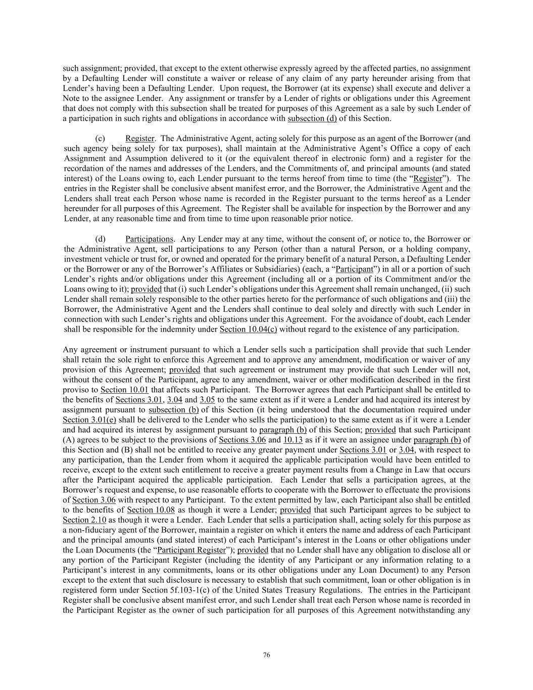 76 such assignment; provided, that except to the extent otherwise expressly agreed by the affected parties, no assignment by a Defaulting Lender will constitute a waiver or release of any claim of any party hereunder arising from that Lender’s having been a Defaulting Lender. Upon request, the Borrower (at its expense) shall execute and deliver a Note to the assignee Lender. Any assignment or transfer by a Lender of rights or obligations under this Agreement that does not comply with this subsection shall be treated for purposes of this Agreement as a sale by such Lender of a participation in such rights and obligations in accordance with subsection (d) of this Section. (c) Register. The Administrative Agent, acting solely for this purpose as an agent of the Borrower (and such agency being solely for tax purposes), shall maintain at the Administrative Agent’s Office a copy of each Assignment and Assumption delivered to it (or the equivalent thereof in electronic form) and a register for the recordation of the names and addresses of the Lenders, and the Commitments of, and principal amounts (and stated interest) of the Loans owing to, each Lender pursuant to the terms hereof from time to time (the “Register”). The entries in the Register shall be conclusive absent manifest error, and the Borrower, the Administrative Agent and the Lenders shall treat each Person whose name is recorded in the Register pursuant to the terms hereof as a Lender hereunder for all purposes of this Agreement. The Register shall be available for inspection by the Borrower and any Lender, at any reasonable time and from time to time upon reasonable prior notice. (d) Participations. Any Lender may at any time, without the consent of, or notice to, the Borrower or the Administrative Agent, sell participations to any Person (other than a natural Person, or a holding company, investment vehicle or trust for, or owned and operated for the primary benefit of a natural Person, a Defaulting Lender or the Borrower or any of the Borrower’s Affiliates or Subsidiaries) (each, a “Participant”) in all or a portion of such Lender’s rights and/or obligations under this Agreement (including all or a portion of its Commitment and/or the Loans owing to it); provided that (i) such Lender’s obligations under this Agreement shall remain unchanged, (ii) such Lender shall remain solely responsible to the other parties hereto for the performance of such obligations and (iii) the Borrower, the Administrative Agent and the Lenders shall continue to deal solely and directly with such Lender in connection with such Lender’s rights and obligations under this Agreement. For the avoidance of doubt, each Lender shall be responsible for the indemnity under Section 10.04(c) without regard to the existence of any participation. Any agreement or instrument pursuant to which a Lender sells such a participation shall provide that such Lender shall retain the sole right to enforce this Agreement and to approve any amendment, modification or waiver of any provision of this Agreement; provided that such agreement or instrument may provide that such Lender will not, without the consent of the Participant, agree to any amendment, waiver or other modification described in the first proviso to Section 10.01 that affects such Participant. The Borrower agrees that each Participant shall be entitled to the benefits of Sections 3.01, 3.04 and 3.05 to the same extent as if it were a Lender and had acquired its interest by assignment pursuant to subsection (b) of this Section (it being understood that the documentation required under Section 3.01(e) shall be delivered to the Lender who sells the participation) to the same extent as if it were a Lender and had acquired its interest by assignment pursuant to paragraph (b) of this Section; provided that such Participant (A) agrees to be subject to the provisions of Sections 3.06 and 10.13 as if it were an assignee under paragraph (b) of this Section and (B) shall not be entitled to receive any greater payment under Sections 3.01 or 3.04, with respect to any participation, than the Lender from whom it acquired the applicable participation would have been entitled to receive, except to the extent such entitlement to receive a greater payment results from a Change in Law that occurs after the Participant acquired the applicable participation. Each Lender that sells a participation agrees, at the Borrower’s request and expense, to use reasonable efforts to cooperate with the Borrower to effectuate the provisions of Section 3.06 with respect to any Participant. To the extent permitted by law, each Participant also shall be entitled to the benefits of Section 10.08 as though it were a Lender; provided that such Participant agrees to be subject to Section 2.10 as though it were a Lender. Each Lender that sells a participation shall, acting solely for this purpose as a non-fiduciary agent of the Borrower, maintain a register on which it enters the name and address of each Participant and the principal amounts (and stated interest) of each Participant’s interest in the Loans or other obligations under the Loan Documents (the “Participant Register”); provided that no Lender shall have any obligation to disclose all or any portion of the Participant Register (including the identity of any Participant or any information relating to a Participant’s interest in any commitments, loans or its other obligations under any Loan Document) to any Person except to the extent that such disclosure is necessary to establish that such commitment, loan or other obligation is in registered form under Section 5f.103-1(c) of the United States Treasury Regulations. The entries in the Participant Register shall be conclusive absent manifest error, and such Lender shall treat each Person whose name is recorded in the Participant Register as the owner of such participation for all purposes of this Agreement notwithstanding