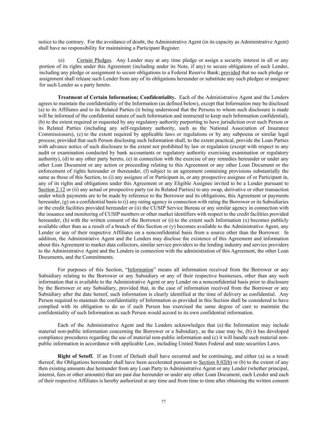 77 notice to the contrary. For the avoidance of doubt, the Administrative Agent (in its capacity as Administrative Agent) shall have no responsibility for maintaining a Participant Register. (e) Certain Pledges. Any Lender may at any time pledge or assign a security interest in all or any portion of its rights under this Agreement (including under its Note, if any) to secure obligations of such Lender, including any pledge or assignment to secure obligations to a Federal Reserve Bank; provided that no such pledge or assignment shall release such Lender from any of its obligations hereunder or substitute any such pledgee or assignee for such Lender as a party hereto. Treatment of Certain Information; Confidentiality. Each of the Administrative Agent and the Lenders agrees to maintain the confidentiality of the Information (as defined below), except that Information may be disclosed (a) to its Affiliates and to its Related Parties (it being understood that the Persons to whom such disclosure is made will be informed of the confidential nature of such Information and instructed to keep such Information confidential), (b) to the extent required or requested by any regulatory authority purporting to have jurisdiction over such Person or its Related Parties (including any self-regulatory authority, such as the National Association of Insurance Commissioners), (c) to the extent required by applicable laws or regulations or by any subpoena or similar legal process; provided that such Person disclosing such Information shall, to the extent practical, provide the Loan Parties with advance notice of such disclosure to the extent not prohibited by law or regulation (except with respect to any audit or examination conducted by bank accountants or regulatory authority exercising examination or regulatory authority), (d) to any other party hereto, (e) in connection with the exercise of any remedies hereunder or under any other Loan Document or any action or proceeding relating to this Agreement or any other Loan Document or the enforcement of rights hereunder or thereunder, (f) subject to an agreement containing provisions substantially the same as those of this Section, to (i) any assignee of or Participant in, or any prospective assignee of or Participant in, any of its rights and obligations under this Agreement or any Eligible Assignee invited to be a Lender pursuant to Section 2.12 or (ii) any actual or prospective party (or its Related Parties) to any swap, derivative or other transaction under which payments are to be made by reference to the Borrower and its obligations, this Agreement or payments hereunder, (g) on a confidential basis to (i) any rating agency in connection with rating the Borrower or its Subsidiaries or the credit facilities provided hereunder or (ii) the CUSIP Service Bureau or any similar agency in connection with the issuance and monitoring of CUSIP numbers or other market identifiers with respect to the credit facilities provided hereunder, (h) with the written consent of the Borrower or (i) to the extent such Information (x) becomes publicly available other than as a result of a breach of this Section or (y) becomes available to the Administrative Agent, any Lender or any of their respective Affiliates on a nonconfidential basis from a source other than the Borrower. In addition, the Administrative Agent and the Lenders may disclose the existence of this Agreement and information about this Agreement to market data collectors, similar service providers to the lending industry and service providers to the Administrative Agent and the Lenders in connection with the administration of this Agreement, the other Loan Documents, and the Commitments. For purposes of this Section, “Information” means all information received from the Borrower or any Subsidiary relating to the Borrower or any Subsidiary or any of their respective businesses, other than any such information that is available to the Administrative Agent or any Lender on a nonconfidential basis prior to disclosure by the Borrower or any Subsidiary, provided that, in the case of information received from the Borrower or any Subsidiary after the date hereof, such information is clearly identified at the time of delivery as confidential. Any Person required to maintain the confidentiality of Information as provided in this Section shall be considered to have complied with its obligation to do so if such Person has exercised the same degree of care to maintain the confidentiality of such Information as such Person would accord to its own confidential information. Each of the Administrative Agent and the Lenders acknowledges that (a) the Information may include material non-public information concerning the Borrower or a Subsidiary, as the case may be, (b) it has developed compliance procedures regarding the use of material non-public information and (c) it will handle such material non- public information in accordance with applicable Law, including United States Federal and state securities Laws. Right of Setoff. If an Event of Default shall have occurred and be continuing, and either (a) as a result thereof, the Obligations hereunder shall have been accelerated pursuant to Section 8.02(b) or (b) to the extent of any then existing amounts due hereunder from any Loan Party to Administrative Agent or any Lender (whether principal, interest, fees or other amounts) that are past due hereunder or under any other Loan Document, each Lender and each of their respective Affiliates is hereby authorized at any time and from time to time after obtaining the written consent
