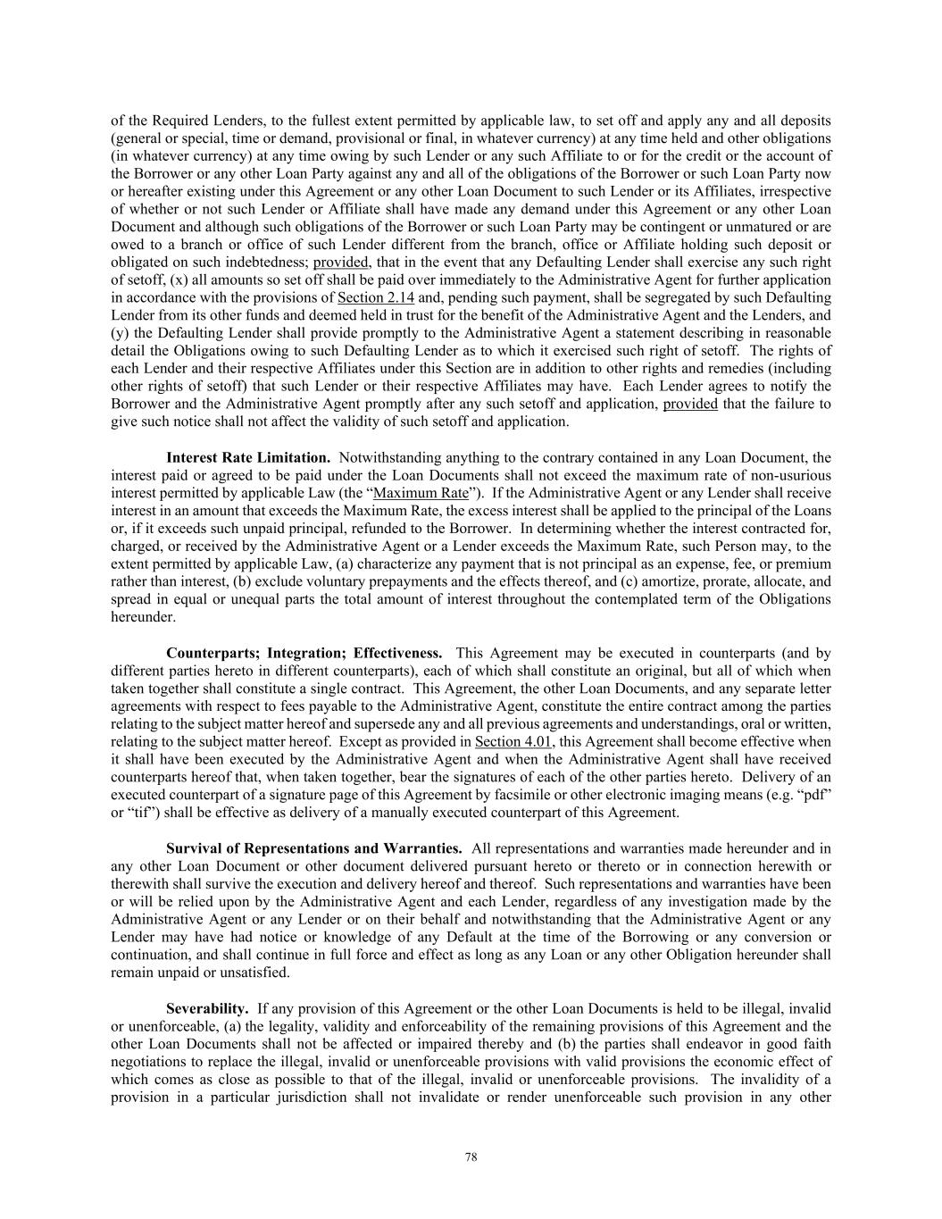 78 of the Required Lenders, to the fullest extent permitted by applicable law, to set off and apply any and all deposits (general or special, time or demand, provisional or final, in whatever currency) at any time held and other obligations (in whatever currency) at any time owing by such Lender or any such Affiliate to or for the credit or the account of the Borrower or any other Loan Party against any and all of the obligations of the Borrower or such Loan Party now or hereafter existing under this Agreement or any other Loan Document to such Lender or its Affiliates, irrespective of whether or not such Lender or Affiliate shall have made any demand under this Agreement or any other Loan Document and although such obligations of the Borrower or such Loan Party may be contingent or unmatured or are owed to a branch or office of such Lender different from the branch, office or Affiliate holding such deposit or obligated on such indebtedness; provided, that in the event that any Defaulting Lender shall exercise any such right of setoff, (x) all amounts so set off shall be paid over immediately to the Administrative Agent for further application in accordance with the provisions of Section 2.14 and, pending such payment, shall be segregated by such Defaulting Lender from its other funds and deemed held in trust for the benefit of the Administrative Agent and the Lenders, and (y) the Defaulting Lender shall provide promptly to the Administrative Agent a statement describing in reasonable detail the Obligations owing to such Defaulting Lender as to which it exercised such right of setoff. The rights of each Lender and their respective Affiliates under this Section are in addition to other rights and remedies (including other rights of setoff) that such Lender or their respective Affiliates may have. Each Lender agrees to notify the Borrower and the Administrative Agent promptly after any such setoff and application, provided that the failure to give such notice shall not affect the validity of such setoff and application. Interest Rate Limitation. Notwithstanding anything to the contrary contained in any Loan Document, the interest paid or agreed to be paid under the Loan Documents shall not exceed the maximum rate of non-usurious interest permitted by applicable Law (the “Maximum Rate”). If the Administrative Agent or any Lender shall receive interest in an amount that exceeds the Maximum Rate, the excess interest shall be applied to the principal of the Loans or, if it exceeds such unpaid principal, refunded to the Borrower. In determining whether the interest contracted for, charged, or received by the Administrative Agent or a Lender exceeds the Maximum Rate, such Person may, to the extent permitted by applicable Law, (a) characterize any payment that is not principal as an expense, fee, or premium rather than interest, (b) exclude voluntary prepayments and the effects thereof, and (c) amortize, prorate, allocate, and spread in equal or unequal parts the total amount of interest throughout the contemplated term of the Obligations hereunder. Counterparts; Integration; Effectiveness. This Agreement may be executed in counterparts (and by different parties hereto in different counterparts), each of which shall constitute an original, but all of which when taken together shall constitute a single contract. This Agreement, the other Loan Documents, and any separate letter agreements with respect to fees payable to the Administrative Agent, constitute the entire contract among the parties relating to the subject matter hereof and supersede any and all previous agreements and understandings, oral or written, relating to the subject matter hereof. Except as provided in Section 4.01, this Agreement shall become effective when it shall have been executed by the Administrative Agent and when the Administrative Agent shall have received counterparts hereof that, when taken together, bear the signatures of each of the other parties hereto. Delivery of an executed counterpart of a signature page of this Agreement by facsimile or other electronic imaging means (e.g. “pdf” or “tif”) shall be effective as delivery of a manually executed counterpart of this Agreement. Survival of Representations and Warranties. All representations and warranties made hereunder and in any other Loan Document or other document delivered pursuant hereto or thereto or in connection herewith or therewith shall survive the execution and delivery hereof and thereof. Such representations and warranties have been or will be relied upon by the Administrative Agent and each Lender, regardless of any investigation made by the Administrative Agent or any Lender or on their behalf and notwithstanding that the Administrative Agent or any Lender may have had notice or knowledge of any Default at the time of the Borrowing or any conversion or continuation, and shall continue in full force and effect as long as any Loan or any other Obligation hereunder shall remain unpaid or unsatisfied. Severability. If any provision of this Agreement or the other Loan Documents is held to be illegal, invalid or unenforceable, (a) the legality, validity and enforceability of the remaining provisions of this Agreement and the other Loan Documents shall not be affected or impaired thereby and (b) the parties shall endeavor in good faith negotiations to replace the illegal, invalid or unenforceable provisions with valid provisions the economic effect of which comes as close as possible to that of the illegal, invalid or unenforceable provisions. The invalidity of a provision in a particular jurisdiction shall not invalidate or render unenforceable such provision in any other