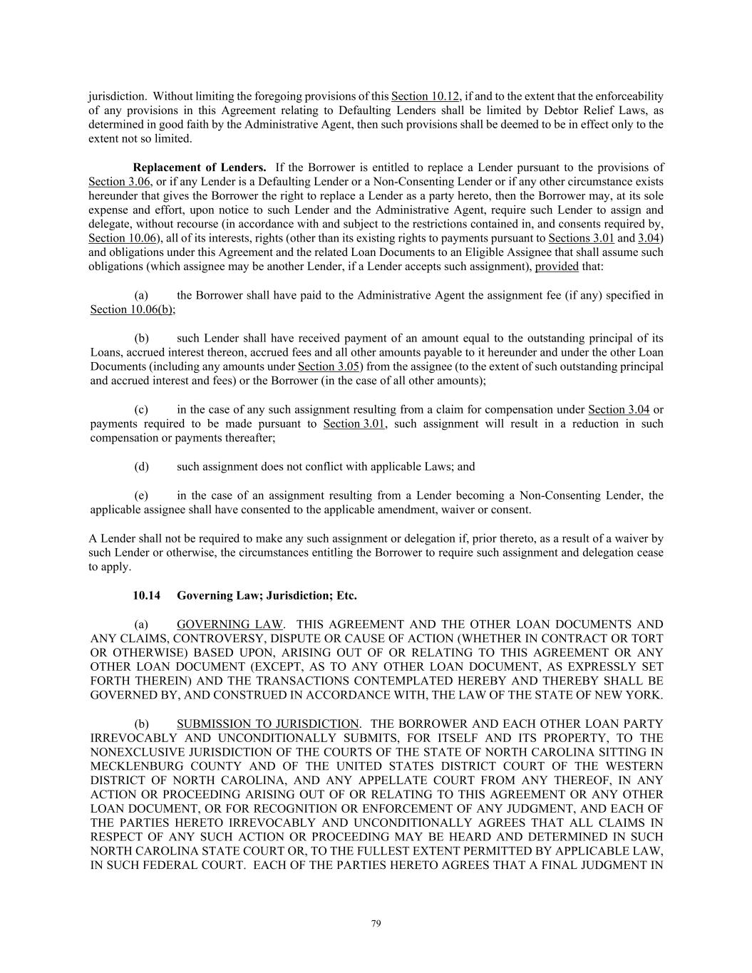79 jurisdiction. Without limiting the foregoing provisions of this Section 10.12, if and to the extent that the enforceability of any provisions in this Agreement relating to Defaulting Lenders shall be limited by Debtor Relief Laws, as determined in good faith by the Administrative Agent, then such provisions shall be deemed to be in effect only to the extent not so limited. Replacement of Lenders. If the Borrower is entitled to replace a Lender pursuant to the provisions of Section 3.06, or if any Lender is a Defaulting Lender or a Non-Consenting Lender or if any other circumstance exists hereunder that gives the Borrower the right to replace a Lender as a party hereto, then the Borrower may, at its sole expense and effort, upon notice to such Lender and the Administrative Agent, require such Lender to assign and delegate, without recourse (in accordance with and subject to the restrictions contained in, and consents required by, Section 10.06), all of its interests, rights (other than its existing rights to payments pursuant to Sections 3.01 and 3.04) and obligations under this Agreement and the related Loan Documents to an Eligible Assignee that shall assume such obligations (which assignee may be another Lender, if a Lender accepts such assignment), provided that: (a) the Borrower shall have paid to the Administrative Agent the assignment fee (if any) specified in Section 10.06(b); (b) such Lender shall have received payment of an amount equal to the outstanding principal of its Loans, accrued interest thereon, accrued fees and all other amounts payable to it hereunder and under the other Loan Documents (including any amounts under Section 3.05) from the assignee (to the extent of such outstanding principal and accrued interest and fees) or the Borrower (in the case of all other amounts); (c) in the case of any such assignment resulting from a claim for compensation under Section 3.04 or payments required to be made pursuant to Section 3.01, such assignment will result in a reduction in such compensation or payments thereafter; (d) such assignment does not conflict with applicable Laws; and (e) in the case of an assignment resulting from a Lender becoming a Non-Consenting Lender, the applicable assignee shall have consented to the applicable amendment, waiver or consent. A Lender shall not be required to make any such assignment or delegation if, prior thereto, as a result of a waiver by such Lender or otherwise, the circumstances entitling the Borrower to require such assignment and delegation cease to apply. 10.14 Governing Law; Jurisdiction; Etc. (a) GOVERNING LAW. THIS AGREEMENT AND THE OTHER LOAN DOCUMENTS AND ANY CLAIMS, CONTROVERSY, DISPUTE OR CAUSE OF ACTION (WHETHER IN CONTRACT OR TORT OR OTHERWISE) BASED UPON, ARISING OUT OF OR RELATING TO THIS AGREEMENT OR ANY OTHER LOAN DOCUMENT (EXCEPT, AS TO ANY OTHER LOAN DOCUMENT, AS EXPRESSLY SET FORTH THEREIN) AND THE TRANSACTIONS CONTEMPLATED HEREBY AND THEREBY SHALL BE GOVERNED BY, AND CONSTRUED IN ACCORDANCE WITH, THE LAW OF THE STATE OF NEW YORK. (b) SUBMISSION TO JURISDICTION. THE BORROWER AND EACH OTHER LOAN PARTY IRREVOCABLY AND UNCONDITIONALLY SUBMITS, FOR ITSELF AND ITS PROPERTY, TO THE NONEXCLUSIVE JURISDICTION OF THE COURTS OF THE STATE OF NORTH CAROLINA SITTING IN MECKLENBURG COUNTY AND OF THE UNITED STATES DISTRICT COURT OF THE WESTERN DISTRICT OF NORTH CAROLINA, AND ANY APPELLATE COURT FROM ANY THEREOF, IN ANY ACTION OR PROCEEDING ARISING OUT OF OR RELATING TO THIS AGREEMENT OR ANY OTHER LOAN DOCUMENT, OR FOR RECOGNITION OR ENFORCEMENT OF ANY JUDGMENT, AND EACH OF THE PARTIES HERETO IRREVOCABLY AND UNCONDITIONALLY AGREES THAT ALL CLAIMS IN RESPECT OF ANY SUCH ACTION OR PROCEEDING MAY BE HEARD AND DETERMINED IN SUCH NORTH CAROLINA STATE COURT OR, TO THE FULLEST EXTENT PERMITTED BY APPLICABLE LAW, IN SUCH FEDERAL COURT. EACH OF THE PARTIES HERETO AGREES THAT A FINAL JUDGMENT IN