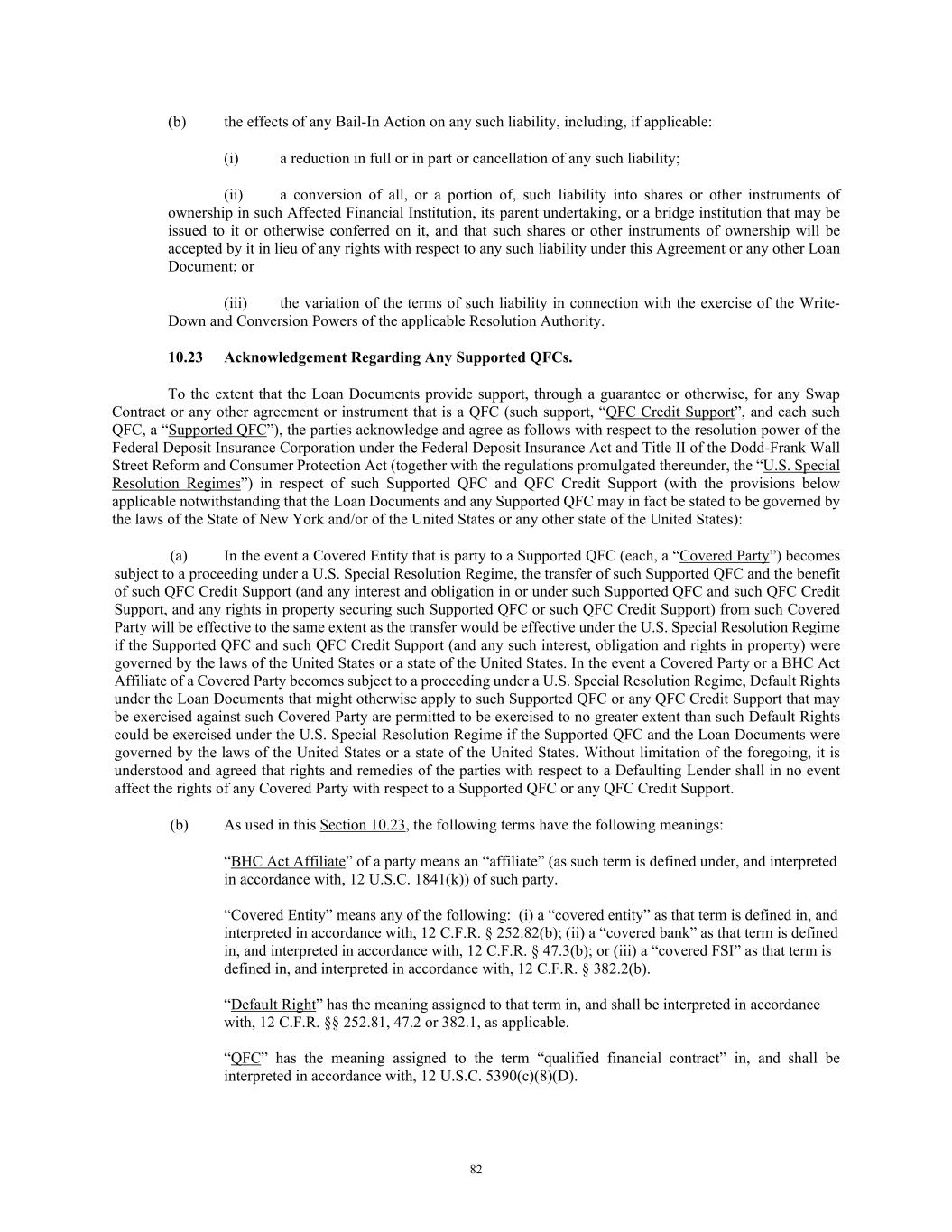 82 (b) the effects of any Bail-In Action on any such liability, including, if applicable: (i) a reduction in full or in part or cancellation of any such liability; (ii) a conversion of all, or a portion of, such liability into shares or other instruments of ownership in such Affected Financial Institution, its parent undertaking, or a bridge institution that may be issued to it or otherwise conferred on it, and that such shares or other instruments of ownership will be accepted by it in lieu of any rights with respect to any such liability under this Agreement or any other Loan Document; or (iii) the variation of the terms of such liability in connection with the exercise of the Write- Down and Conversion Powers of the applicable Resolution Authority. 10.23 Acknowledgement Regarding Any Supported QFCs. To the extent that the Loan Documents provide support, through a guarantee or otherwise, for any Swap Contract or any other agreement or instrument that is a QFC (such support, “QFC Credit Support”, and each such QFC, a “Supported QFC”), the parties acknowledge and agree as follows with respect to the resolution power of the Federal Deposit Insurance Corporation under the Federal Deposit Insurance Act and Title II of the Dodd-Frank Wall Street Reform and Consumer Protection Act (together with the regulations promulgated thereunder, the “U.S. Special Resolution Regimes”) in respect of such Supported QFC and QFC Credit Support (with the provisions below applicable notwithstanding that the Loan Documents and any Supported QFC may in fact be stated to be governed by the laws of the State of New York and/or of the United States or any other state of the United States): (a) In the event a Covered Entity that is party to a Supported QFC (each, a “Covered Party”) becomes subject to a proceeding under a U.S. Special Resolution Regime, the transfer of such Supported QFC and the benefit of such QFC Credit Support (and any interest and obligation in or under such Supported QFC and such QFC Credit Support, and any rights in property securing such Supported QFC or such QFC Credit Support) from such Covered Party will be effective to the same extent as the transfer would be effective under the U.S. Special Resolution Regime if the Supported QFC and such QFC Credit Support (and any such interest, obligation and rights in property) were governed by the laws of the United States or a state of the United States. In the event a Covered Party or a BHC Act Affiliate of a Covered Party becomes subject to a proceeding under a U.S. Special Resolution Regime, Default Rights under the Loan Documents that might otherwise apply to such Supported QFC or any QFC Credit Support that may be exercised against such Covered Party are permitted to be exercised to no greater extent than such Default Rights could be exercised under the U.S. Special Resolution Regime if the Supported QFC and the Loan Documents were governed by the laws of the United States or a state of the United States. Without limitation of the foregoing, it is understood and agreed that rights and remedies of the parties with respect to a Defaulting Lender shall in no event affect the rights of any Covered Party with respect to a Supported QFC or any QFC Credit Support. (b) As used in this Section 10.23, the following terms have the following meanings: “BHC Act Affiliate” of a party means an “affiliate” (as such term is defined under, and interpreted in accordance with, 12 U.S.C. 1841(k)) of such party. “Covered Entity” means any of the following: (i) a “covered entity” as that term is defined in, and interpreted in accordance with, 12 C.F.R. § 252.82(b); (ii) a “covered bank” as that term is defined in, and interpreted in accordance with, 12 C.F.R. § 47.3(b); or (iii) a “covered FSI” as that term is defined in, and interpreted in accordance with, 12 C.F.R. § 382.2(b). “Default Right” has the meaning assigned to that term in, and shall be interpreted in accordance with, 12 C.F.R. §§ 252.81, 47.2 or 382.1, as applicable. “QFC” has the meaning assigned to the term “qualified financial contract” in, and shall be interpreted in accordance with, 12 U.S.C. 5390(c)(8)(D).