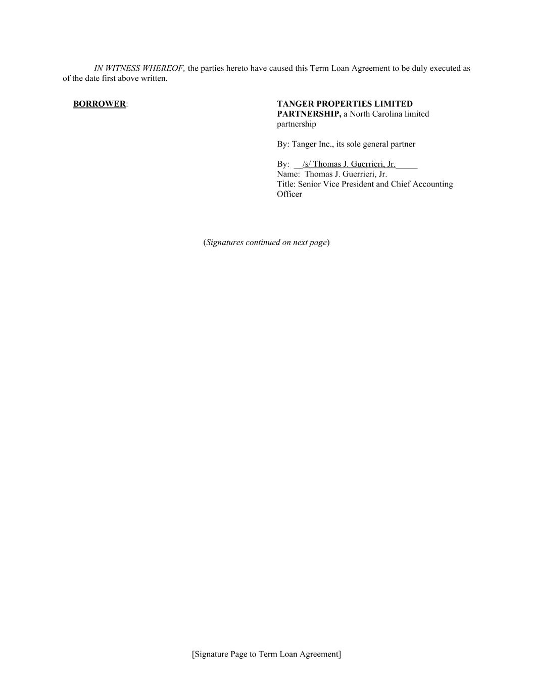 [Signature Page to Term Loan Agreement] IN WITNESS WHEREOF, the parties hereto have caused this Term Loan Agreement to be duly executed as of the date first above written. BORROWER: TANGER PROPERTIES LIMITED PARTNERSHIP, a North Carolina limited partnership By: Tanger Inc., its sole general partner By: __/s/ Thomas J. Guerrieri, Jr._____ Name: Thomas J. Guerrieri, Jr. Title: Senior Vice President and Chief Accounting Officer (Signatures continued on next page)
