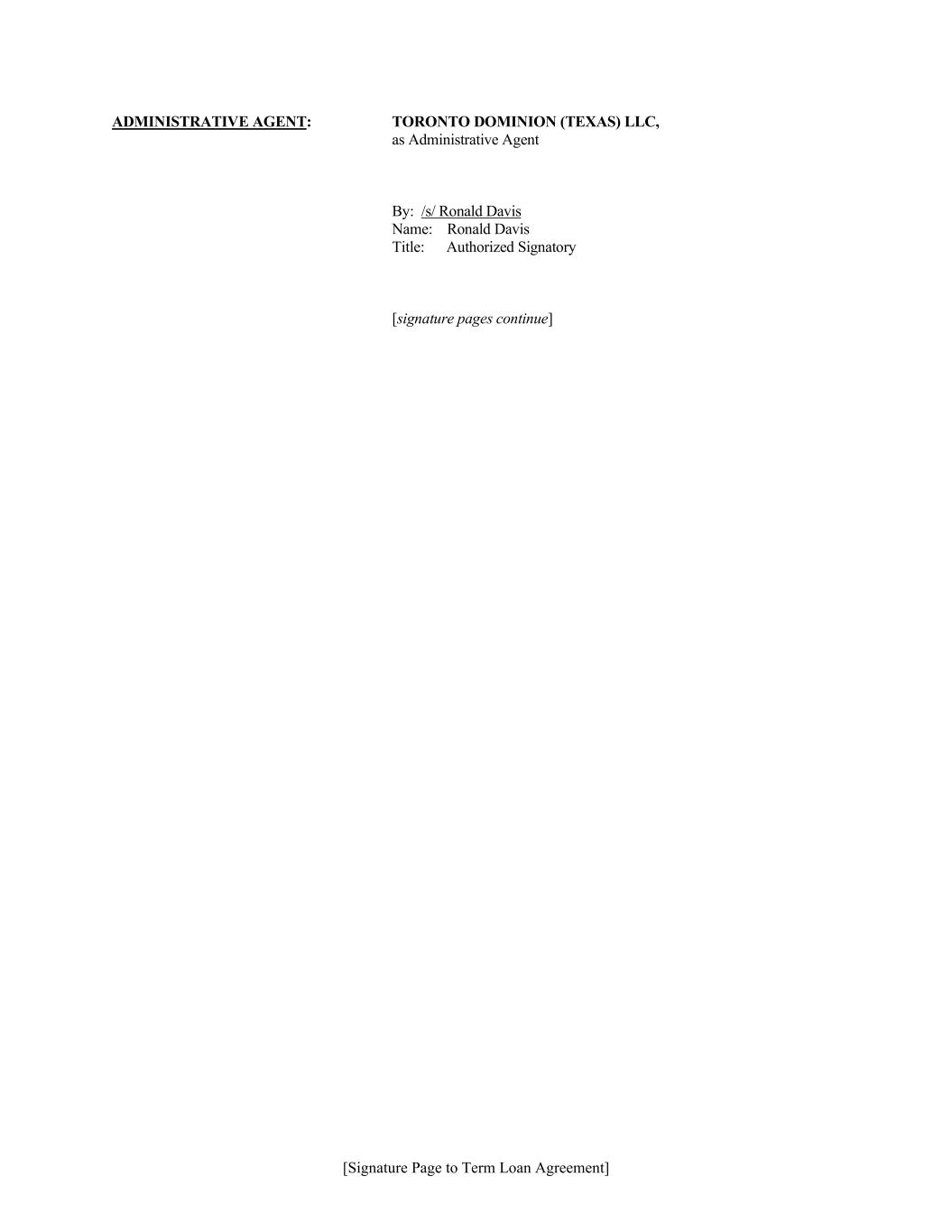 [Signature Page to Term Loan Agreement] ADMINISTRATIVE AGENT: TORONTO DOMINION (TEXAS) LLC, as Administrative Agent By: /s/ Ronald Davis Name: Ronald Davis Title: Authorized Signatory [signature pages continue]