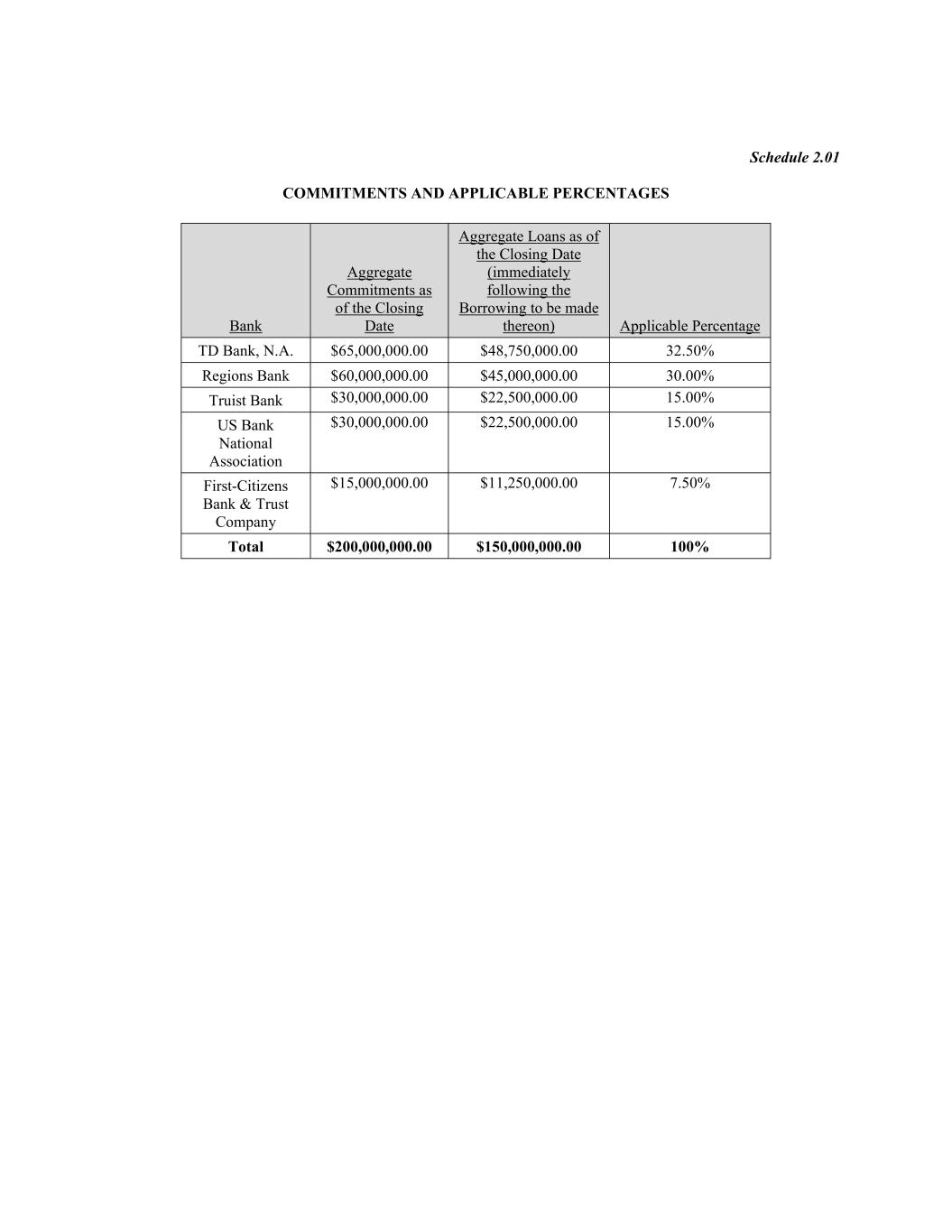 Schedule 2.01 COMMITMENTS AND APPLICABLE PERCENTAGES Bank Aggregate Commitments as of the Closing Date Aggregate Loans as of the Closing Date (immediately following the Borrowing to be made thereon) Applicable Percentage TD Bank, N.A. $65,000,000.00 $48,750,000.00 32.50% Regions Bank $60,000,000.00 $45,000,000.00 30.00% Truist Bank $30,000,000.00 $22,500,000.00 15.00% US Bank National Association $30,000,000.00 $22,500,000.00 15.00% First-Citizens Bank & Trust Company $15,000,000.00 $11,250,000.00 7.50% Total $200,000,000.00 $150,000,000.00 100%