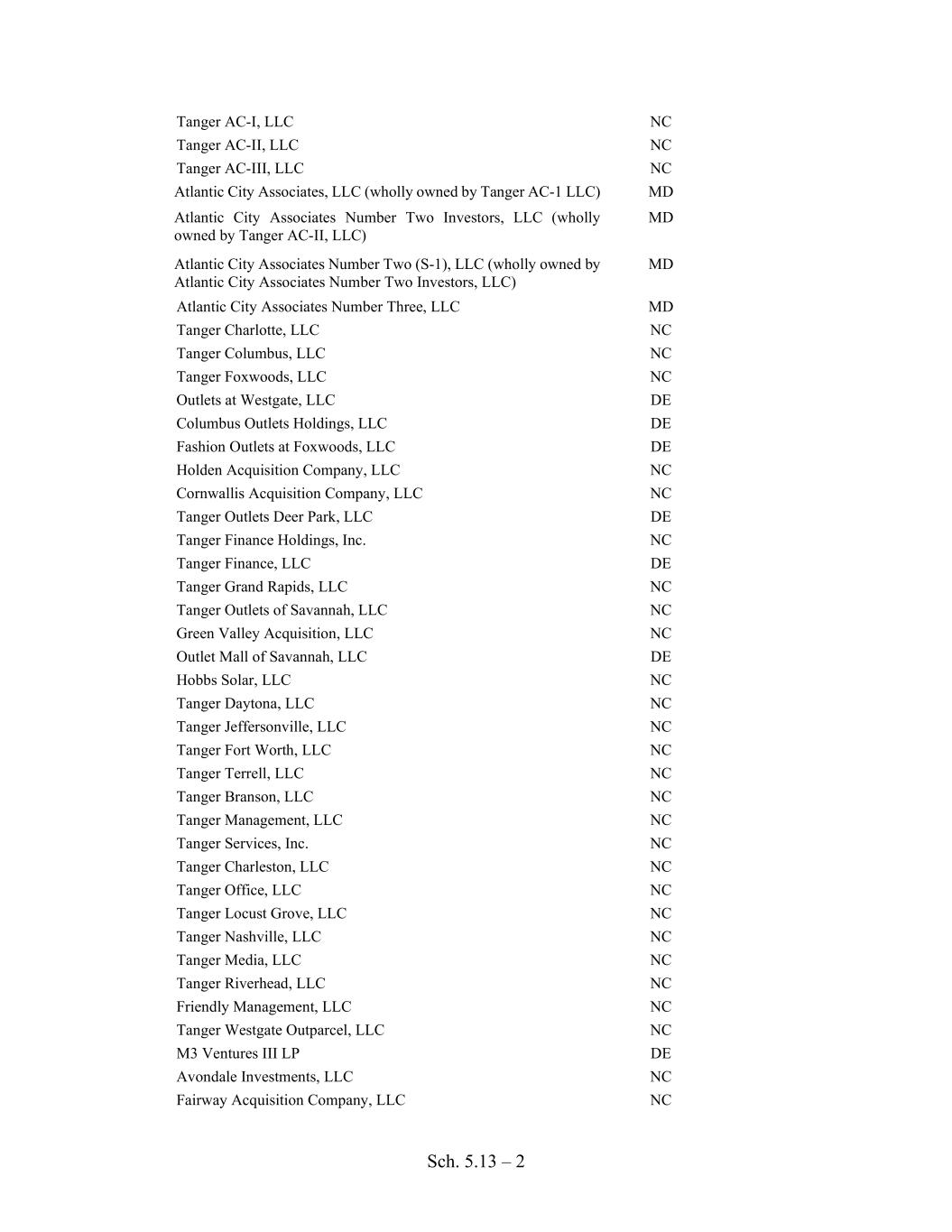 Sch. 5.13 – 2 Tanger AC-I, LLC NC Tanger AC-II, LLC NC Tanger AC-III, LLC NC Atlantic City Associates, LLC (wholly owned by Tanger AC-1 LLC) MD Atlantic City Associates Number Two Investors, LLC (wholly owned by Tanger AC-II, LLC) MD Atlantic City Associates Number Two (S-1), LLC (wholly owned by Atlantic City Associates Number Two Investors, LLC) MD Atlantic City Associates Number Three, LLC MD Tanger Charlotte, LLC NC Tanger Columbus, LLC NC Tanger Foxwoods, LLC NC Outlets at Westgate, LLC DE Columbus Outlets Holdings, LLC DE Fashion Outlets at Foxwoods, LLC DE Holden Acquisition Company, LLC NC Cornwallis Acquisition Company, LLC NC Tanger Outlets Deer Park, LLC DE Tanger Finance Holdings, Inc. NC Tanger Finance, LLC DE Tanger Grand Rapids, LLC NC Tanger Outlets of Savannah, LLC NC Green Valley Acquisition, LLC NC Outlet Mall of Savannah, LLC DE Hobbs Solar, LLC NC Tanger Daytona, LLC NC Tanger Jeffersonville, LLC NC Tanger Fort Worth, LLC NC Tanger Terrell, LLC NC Tanger Branson, LLC NC Tanger Management, LLC NC Tanger Services, Inc. NC Tanger Charleston, LLC NC Tanger Office, LLC NC Tanger Locust Grove, LLC NC Tanger Nashville, LLC NC Tanger Media, LLC NC Tanger Riverhead, LLC NC Friendly Management, LLC NC Tanger Westgate Outparcel, LLC NC M3 Ventures III LP DE Avondale Investments, LLC NC Fairway Acquisition Company, LLC NC