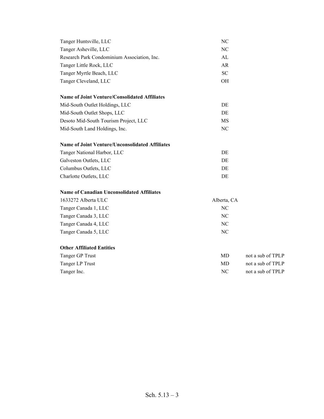 Sch. 5.13 – 3 Tanger Huntsville, LLC NC Tanger Asheville, LLC NC Research Park Condominium Association, Inc. AL Tanger Little Rock, LLC AR Tanger Myrtle Beach, LLC SC Tanger Cleveland, LLC OH Name of Joint Venture/Consolidated Affiliates Mid-South Outlet Holdings, LLC DE Mid-South Outlet Shops, LLC DE Desoto Mid-South Tourism Project, LLC MS Mid-South Land Holdings, Inc. NC Name of Joint Venture/Unconsolidated Affiliates Tanger National Harbor, LLC DE Galveston Outlets, LLC DE Columbus Outlets, LLC DE Charlotte Outlets, LLC DE Name of Canadian Unconsolidated Affiliates 1633272 Alberta ULC Alberta, CA Tanger Canada 1, LLC NC Tanger Canada 3, LLC NC Tanger Canada 4, LLC NC Tanger Canada 5, LLC NC Other Affiliated Entities Tanger GP Trust MD not a sub of TPLP Tanger LP Trust MD not a sub of TPLP Tanger Inc. NC not a sub of TPLP