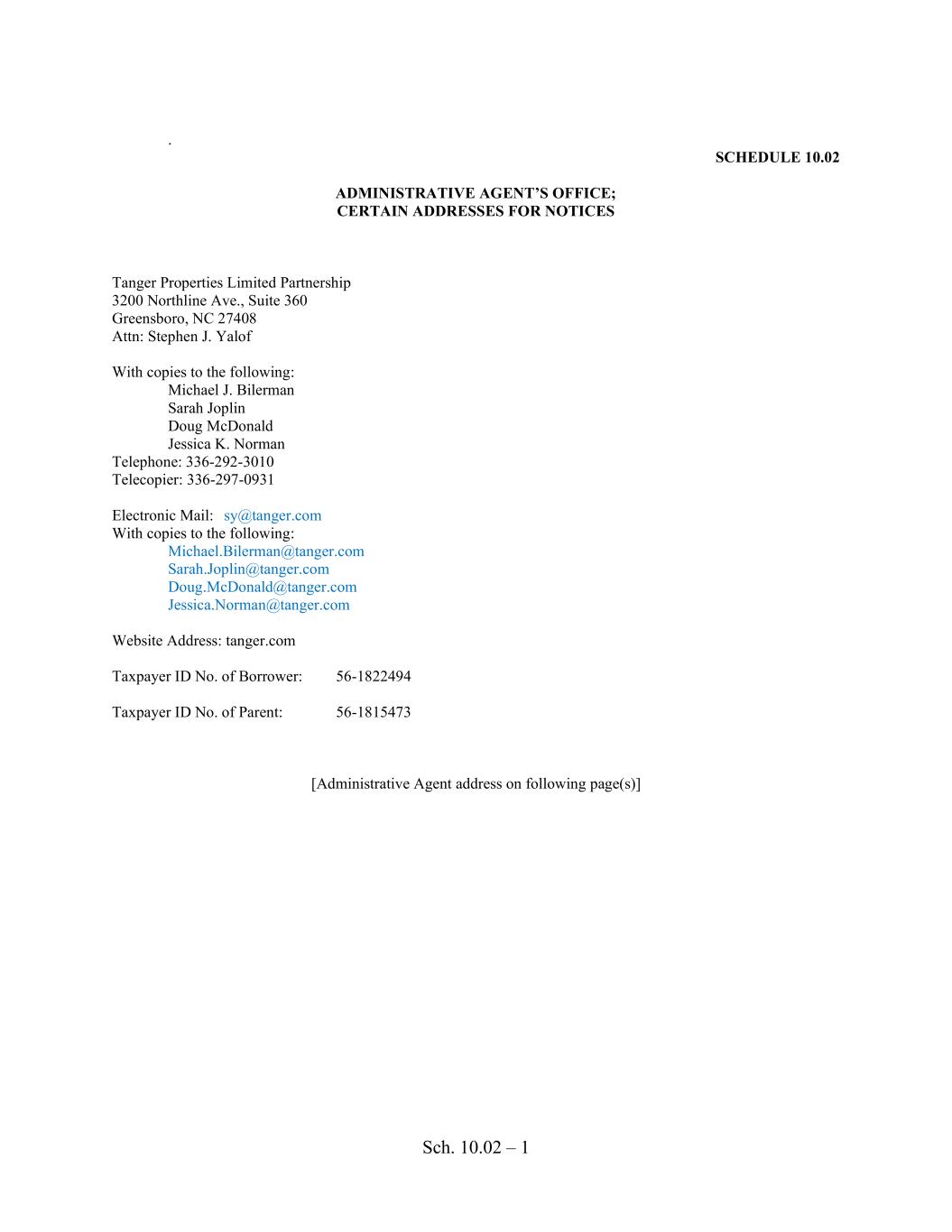 Sch. 10.02 – 1 . SCHEDULE 10.02 ADMINISTRATIVE AGENT’S OFFICE; CERTAIN ADDRESSES FOR NOTICES Tanger Properties Limited Partnership 3200 Northline Ave., Suite 360 Greensboro, NC 27408 Attn: Stephen J. Yalof With copies to the following: Michael J. Bilerman Sarah Joplin Doug McDonald Jessica K. Norman Telephone: 336-292-3010 Telecopier: 336-297-0931 Electronic Mail: sy@tanger.com With copies to the following: Michael.Bilerman@tanger.com Sarah.Joplin@tanger.com Doug.McDonald@tanger.com Jessica.Norman@tanger.com Website Address: tanger.com Taxpayer ID No. of Borrower: 56-1822494 Taxpayer ID No. of Parent: 56-1815473 [Administrative Agent address on following page(s)]
