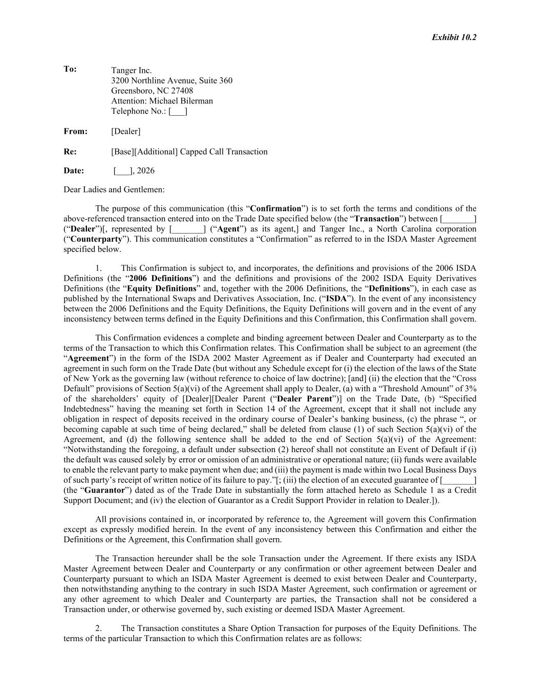 Exhibit 10.2 To: Tanger Inc. 3200 Northline Avenue, Suite 360 Greensboro, NC 27408 Attention: Michael Bilerman Telephone No.: [___] From: [Dealer] Re: [Base][Additional] Capped Call Transaction Date: [___], 2026 Dear Ladies and Gentlemen: The purpose of this communication (this “Confirmation”) is to set forth the terms and conditions of the above-referenced transaction entered into on the Trade Date specified below (the “Transaction”) between [_______] (“Dealer”)[, represented by [_______] (“Agent”) as its agent,] and Tanger Inc., a North Carolina corporation (“Counterparty”). This communication constitutes a “Confirmation” as referred to in the ISDA Master Agreement specified below. 1. This Confirmation is subject to, and incorporates, the definitions and provisions of the 2006 ISDA Definitions (the “2006 Definitions”) and the definitions and provisions of the 2002 ISDA Equity Derivatives Definitions (the “Equity Definitions” and, together with the 2006 Definitions, the “Definitions”), in each case as published by the International Swaps and Derivatives Association, Inc. (“ISDA”). In the event of any inconsistency between the 2006 Definitions and the Equity Definitions, the Equity Definitions will govern and in the event of any inconsistency between terms defined in the Equity Definitions and this Confirmation, this Confirmation shall govern. This Confirmation evidences a complete and binding agreement between Dealer and Counterparty as to the terms of the Transaction to which this Confirmation relates. This Confirmation shall be subject to an agreement (the “Agreement”) in the form of the ISDA 2002 Master Agreement as if Dealer and Counterparty had executed an agreement in such form on the Trade Date (but without any Schedule except for (i) the election of the laws of the State of New York as the governing law (without reference to choice of law doctrine); [and] (ii) the election that the “Cross Default” provisions of Section 5(a)(vi) of the Agreement shall apply to Dealer, (a) with a “Threshold Amount” of 3% of the shareholders’ equity of [Dealer][Dealer Parent (“Dealer Parent”)] on the Trade Date, (b) “Specified Indebtedness” having the meaning set forth in Section 14 of the Agreement, except that it shall not include any obligation in respect of deposits received in the ordinary course of Dealer’s banking business, (c) the phrase “, or becoming capable at such time of being declared,” shall be deleted from clause (1) of such Section 5(a)(vi) of the Agreement, and (d) the following sentence shall be added to the end of Section 5(a)(vi) of the Agreement: “Notwithstanding the foregoing, a default under subsection (2) hereof shall not constitute an Event of Default if (i) the default was caused solely by error or omission of an administrative or operational nature; (ii) funds were available to enable the relevant party to make payment when due; and (iii) the payment is made within two Local Business Days of such party’s receipt of written notice of its failure to pay.”[; (iii) the election of an executed guarantee of [_______] (the “Guarantor”) dated as of the Trade Date in substantially the form attached hereto as Schedule 1 as a Credit Support Document; and (iv) the election of Guarantor as a Credit Support Provider in relation to Dealer.]). All provisions contained in, or incorporated by reference to, the Agreement will govern this Confirmation except as expressly modified herein. In the event of any inconsistency between this Confirmation and either the Definitions or the Agreement, this Confirmation shall govern. The Transaction hereunder shall be the sole Transaction under the Agreement. If there exists any ISDA Master Agreement between Dealer and Counterparty or any confirmation or other agreement between Dealer and Counterparty pursuant to which an ISDA Master Agreement is deemed to exist between Dealer and Counterparty, then notwithstanding anything to the contrary in such ISDA Master Agreement, such confirmation or agreement or any other agreement to which Dealer and Counterparty are parties, the Transaction shall not be considered a Transaction under, or otherwise governed by, such existing or deemed ISDA Master Agreement. 2. The Transaction constitutes a Share Option Transaction for purposes of the Equity Definitions. The terms of the particular Transaction to which this Confirmation relates are as follows: