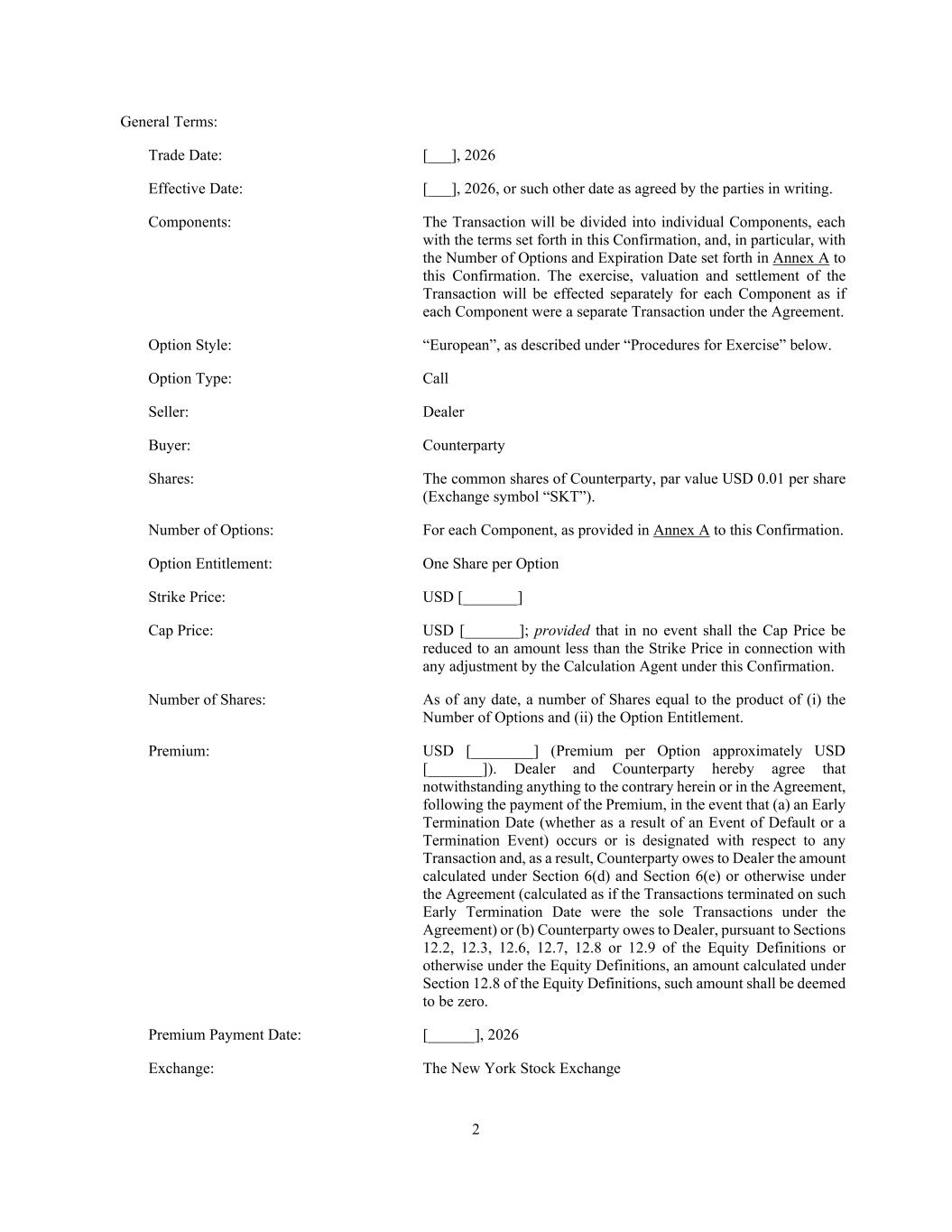 2 General Terms: Trade Date: [___], 2026 Effective Date: [___], 2026, or such other date as agreed by the parties in writing. Components: The Transaction will be divided into individual Components, each with the terms set forth in this Confirmation, and, in particular, with the Number of Options and Expiration Date set forth in Annex A to this Confirmation. The exercise, valuation and settlement of the Transaction will be effected separately for each Component as if each Component were a separate Transaction under the Agreement. Option Style: “European”, as described under “Procedures for Exercise” below. Option Type: Call Seller: Dealer Buyer: Counterparty Shares: The common shares of Counterparty, par value USD 0.01 per share (Exchange symbol “SKT”). Number of Options: For each Component, as provided in Annex A to this Confirmation. Option Entitlement: One Share per Option Strike Price: USD [_______] Cap Price: USD [_______]; provided that in no event shall the Cap Price be reduced to an amount less than the Strike Price in connection with any adjustment by the Calculation Agent under this Confirmation. Number of Shares: As of any date, a number of Shares equal to the product of (i) the Number of Options and (ii) the Option Entitlement. Premium: USD [________] (Premium per Option approximately USD [_______]). Dealer and Counterparty hereby agree that notwithstanding anything to the contrary herein or in the Agreement, following the payment of the Premium, in the event that (a) an Early Termination Date (whether as a result of an Event of Default or a Termination Event) occurs or is designated with respect to any Transaction and, as a result, Counterparty owes to Dealer the amount calculated under Section 6(d) and Section 6(e) or otherwise under the Agreement (calculated as if the Transactions terminated on such Early Termination Date were the sole Transactions under the Agreement) or (b) Counterparty owes to Dealer, pursuant to Sections 12.2, 12.3, 12.6, 12.7, 12.8 or 12.9 of the Equity Definitions or otherwise under the Equity Definitions, an amount calculated under Section 12.8 of the Equity Definitions, such amount shall be deemed to be zero. Premium Payment Date: [______], 2026 Exchange: The New York Stock Exchange