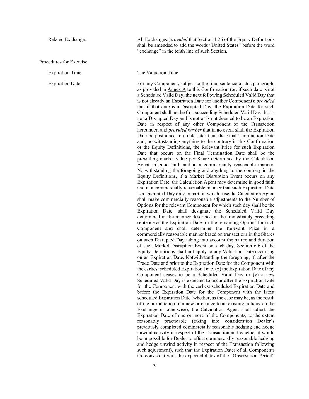 3 Related Exchange: All Exchanges; provided that Section 1.26 of the Equity Definitions shall be amended to add the words “United States” before the word “exchange” in the tenth line of such Section. Procedures for Exercise: Expiration Time: The Valuation Time Expiration Date: For any Component, subject to the final sentence of this paragraph, as provided in Annex A to this Confirmation (or, if such date is not a Scheduled Valid Day, the next following Scheduled Valid Day that is not already an Expiration Date for another Component); provided that if that date is a Disrupted Day, the Expiration Date for such Component shall be the first succeeding Scheduled Valid Day that is not a Disrupted Day and is not or is not deemed to be an Expiration Date in respect of any other Component of the Transaction hereunder; and provided further that in no event shall the Expiration Date be postponed to a date later than the Final Termination Date and, notwithstanding anything to the contrary in this Confirmation or the Equity Definitions, the Relevant Price for such Expiration Date that occurs on the Final Termination Date shall be the prevailing market value per Share determined by the Calculation Agent in good faith and in a commercially reasonable manner. Notwithstanding the foregoing and anything to the contrary in the Equity Definitions, if a Market Disruption Event occurs on any Expiration Date, the Calculation Agent may determine in good faith and in a commercially reasonable manner that such Expiration Date is a Disrupted Day only in part, in which case the Calculation Agent shall make commercially reasonable adjustments to the Number of Options for the relevant Component for which such day shall be the Expiration Date, shall designate the Scheduled Valid Day determined in the manner described in the immediately preceding sentence as the Expiration Date for the remaining Options for such Component and shall determine the Relevant Price in a commercially reasonable manner based on transactions in the Shares on such Disrupted Day taking into account the nature and duration of such Market Disruption Event on such day. Section 6.6 of the Equity Definitions shall not apply to any Valuation Date occurring on an Expiration Date. Notwithstanding the foregoing, if, after the Trade Date and prior to the Expiration Date for the Component with the earliest scheduled Expiration Date, (x) the Expiration Date of any Component ceases to be a Scheduled Valid Day or (y) a new Scheduled Valid Day is expected to occur after the Expiration Date for the Component with the earliest scheduled Expiration Date and before the Expiration Date for the Component with the latest scheduled Expiration Date (whether, as the case may be, as the result of the introduction of a new or change to an existing holiday on the Exchange or otherwise), the Calculation Agent shall adjust the Expiration Date of one or more of the Components, to the extent reasonably practicable (taking into consideration Dealer’s previously completed commercially reasonable hedging and hedge unwind activity in respect of the Transaction and whether it would be impossible for Dealer to effect commercially reasonable hedging and hedge unwind activity in respect of the Transaction following such adjustment), such that the Expiration Dates of all Components are consistent with the expected dates of the “Observation Period”