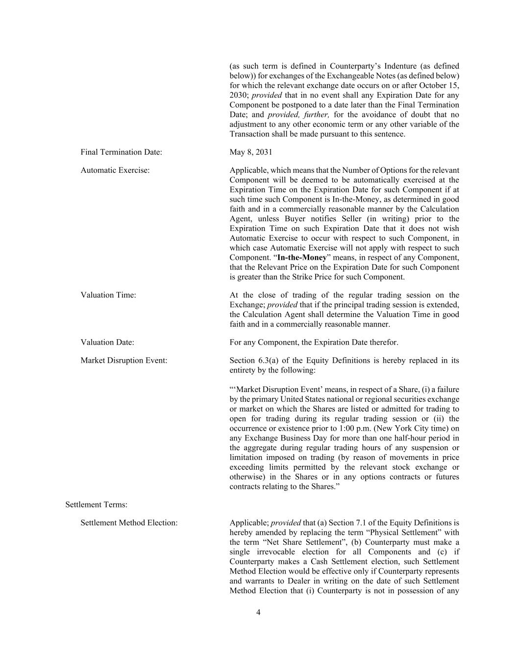 4 (as such term is defined in Counterparty’s Indenture (as defined below)) for exchanges of the Exchangeable Notes (as defined below) for which the relevant exchange date occurs on or after October 15, 2030; provided that in no event shall any Expiration Date for any Component be postponed to a date later than the Final Termination Date; and provided, further, for the avoidance of doubt that no adjustment to any other economic term or any other variable of the Transaction shall be made pursuant to this sentence. Final Termination Date: May 8, 2031 Automatic Exercise: Applicable, which means that the Number of Options for the relevant Component will be deemed to be automatically exercised at the Expiration Time on the Expiration Date for such Component if at such time such Component is In-the-Money, as determined in good faith and in a commercially reasonable manner by the Calculation Agent, unless Buyer notifies Seller (in writing) prior to the Expiration Time on such Expiration Date that it does not wish Automatic Exercise to occur with respect to such Component, in which case Automatic Exercise will not apply with respect to such Component. “In-the-Money” means, in respect of any Component, that the Relevant Price on the Expiration Date for such Component is greater than the Strike Price for such Component. Valuation Time: At the close of trading of the regular trading session on the Exchange; provided that if the principal trading session is extended, the Calculation Agent shall determine the Valuation Time in good faith and in a commercially reasonable manner. Valuation Date: For any Component, the Expiration Date therefor. Market Disruption Event: Section 6.3(a) of the Equity Definitions is hereby replaced in its entirety by the following: “‘Market Disruption Event’ means, in respect of a Share, (i) a failure by the primary United States national or regional securities exchange or market on which the Shares are listed or admitted for trading to open for trading during its regular trading session or (ii) the occurrence or existence prior to 1:00 p.m. (New York City time) on any Exchange Business Day for more than one half-hour period in the aggregate during regular trading hours of any suspension or limitation imposed on trading (by reason of movements in price exceeding limits permitted by the relevant stock exchange or otherwise) in the Shares or in any options contracts or futures contracts relating to the Shares.” Settlement Terms: Settlement Method Election: Applicable; provided that (a) Section 7.1 of the Equity Definitions is hereby amended by replacing the term “Physical Settlement” with the term “Net Share Settlement”, (b) Counterparty must make a single irrevocable election for all Components and (c) if Counterparty makes a Cash Settlement election, such Settlement Method Election would be effective only if Counterparty represents and warrants to Dealer in writing on the date of such Settlement Method Election that (i) Counterparty is not in possession of any