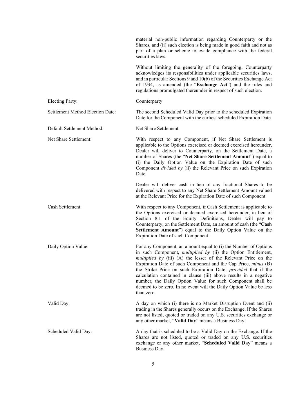 5 material non-public information regarding Counterparty or the Shares, and (ii) such election is being made in good faith and not as part of a plan or scheme to evade compliance with the federal securities laws. Without limiting the generality of the foregoing, Counterparty acknowledges its responsibilities under applicable securities laws, and in particular Sections 9 and 10(b) of the Securities Exchange Act of 1934, as amended (the “Exchange Act”) and the rules and regulations promulgated thereunder in respect of such election. Electing Party: Counterparty Settlement Method Election Date: The second Scheduled Valid Day prior to the scheduled Expiration Date for the Component with the earliest scheduled Expiration Date. Default Settlement Method: Net Share Settlement Net Share Settlement: With respect to any Component, if Net Share Settlement is applicable to the Options exercised or deemed exercised hereunder, Dealer will deliver to Counterparty, on the Settlement Date, a number of Shares (the “Net Share Settlement Amount”) equal to (i) the Daily Option Value on the Expiration Date of such Component divided by (ii) the Relevant Price on such Expiration Date. Dealer will deliver cash in lieu of any fractional Shares to be delivered with respect to any Net Share Settlement Amount valued at the Relevant Price for the Expiration Date of such Component. Cash Settlement: With respect to any Component, if Cash Settlement is applicable to the Options exercised or deemed exercised hereunder, in lieu of Section 8.1 of the Equity Definitions, Dealer will pay to Counterparty, on the Settlement Date, an amount of cash (the “Cash Settlement Amount”) equal to the Daily Option Value on the Expiration Date of such Component. Daily Option Value: For any Component, an amount equal to (i) the Number of Options in such Component, multiplied by (ii) the Option Entitlement, multiplied by (iii) (A) the lesser of the Relevant Price on the Expiration Date of such Component and the Cap Price, minus (B) the Strike Price on such Expiration Date; provided that if the calculation contained in clause (iii) above results in a negative number, the Daily Option Value for such Component shall be deemed to be zero. In no event will the Daily Option Value be less than zero. Valid Day: A day on which (i) there is no Market Disruption Event and (ii) trading in the Shares generally occurs on the Exchange. If the Shares are not listed, quoted or traded on any U.S. securities exchange or any other market, “Valid Day” means a Business Day. Scheduled Valid Day: A day that is scheduled to be a Valid Day on the Exchange. If the Shares are not listed, quoted or traded on any U.S. securities exchange or any other market, “Scheduled Valid Day” means a Business Day.