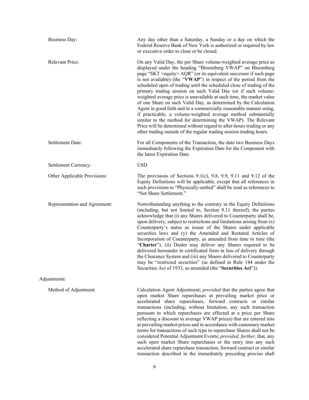 6 Business Day: Any day other than a Saturday, a Sunday or a day on which the Federal Reserve Bank of New York is authorized or required by law or executive order to close or be closed. Relevant Price: On any Valid Day, the per Share volume-weighted average price as displayed under the heading “Bloomberg VWAP” on Bloomberg page “SKT <equity> AQR” (or its equivalent successor if such page is not available) (the “VWAP”) in respect of the period from the scheduled open of trading until the scheduled close of trading of the primary trading session on such Valid Day (or if such volume- weighted average price is unavailable at such time, the market value of one Share on such Valid Day, as determined by the Calculation Agent in good faith and in a commercially reasonable manner using, if practicable, a volume-weighted average method substantially similar to the method for determining the VWAP). The Relevant Price will be determined without regard to after-hours trading or any other trading outside of the regular trading session trading hours. Settlement Date: For all Components of the Transaction, the date two Business Days immediately following the Expiration Date for the Component with the latest Expiration Date. Settlement Currency: USD Other Applicable Provisions: The provisions of Sections 9.1(c), 9.8, 9.9, 9.11 and 9.12 of the Equity Definitions will be applicable, except that all references in such provisions to “Physically-settled” shall be read as references to “Net Share Settlement.” Representation and Agreement: Notwithstanding anything to the contrary in the Equity Definitions (including, but not limited to, Section 9.11 thereof), the parties acknowledge that (i) any Shares delivered to Counterparty shall be, upon delivery, subject to restrictions and limitations arising from (x) Counterparty’s status as issuer of the Shares under applicable securities laws and (y) the Amended and Restated Articles of Incorporation of Counterparty, as amended from time to time (the “Charter”), (ii) Dealer may deliver any Shares required to be delivered hereunder in certificated form in lieu of delivery through the Clearance System and (iii) any Shares delivered to Counterparty may be “restricted securities” (as defined in Rule 144 under the Securities Act of 1933, as amended (the “Securities Act”)). Adjustments: Method of Adjustment: Calculation Agent Adjustment; provided that the parties agree that open market Share repurchases at prevailing market price or accelerated share repurchases, forward contracts or similar transactions (including, without limitation, any such transaction pursuant to which repurchases are effected at a price per Share reflecting a discount to average VWAP prices) that are entered into at prevailing market prices and in accordance with customary market terms for transactions of such type to repurchase Shares shall not be considered Potential Adjustment Events; provided, further, that, any such open market Share repurchases or the entry into any such accelerated share repurchase transaction, forward contract or similar transaction described in the immediately preceding proviso shall
