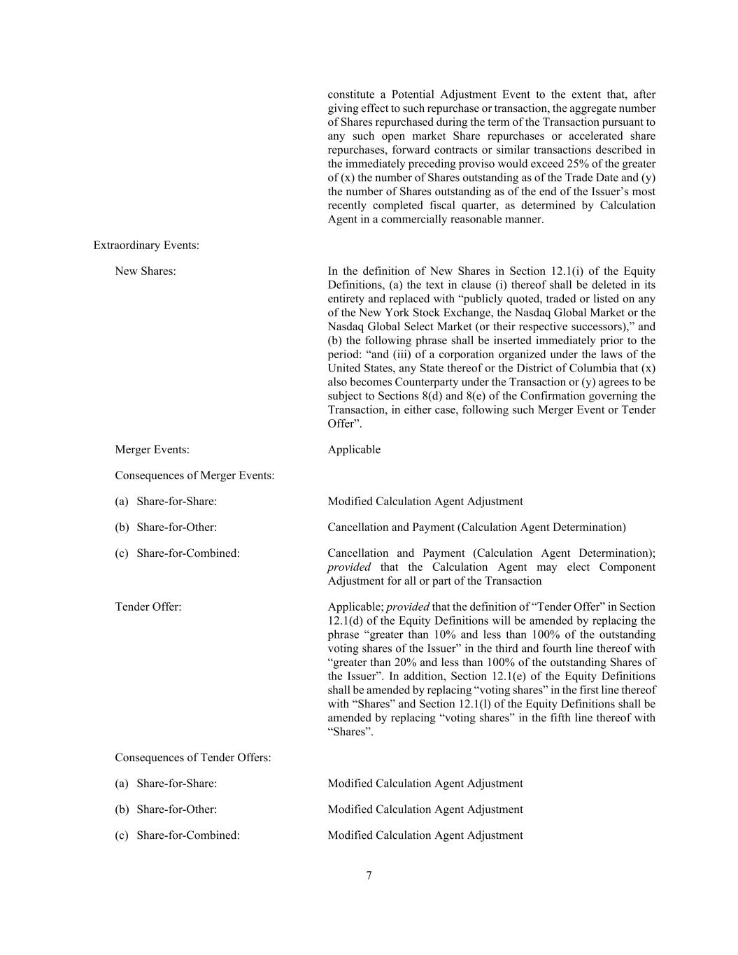 7 constitute a Potential Adjustment Event to the extent that, after giving effect to such repurchase or transaction, the aggregate number of Shares repurchased during the term of the Transaction pursuant to any such open market Share repurchases or accelerated share repurchases, forward contracts or similar transactions described in the immediately preceding proviso would exceed 25% of the greater of (x) the number of Shares outstanding as of the Trade Date and (y) the number of Shares outstanding as of the end of the Issuer’s most recently completed fiscal quarter, as determined by Calculation Agent in a commercially reasonable manner. Extraordinary Events: New Shares: In the definition of New Shares in Section 12.1(i) of the Equity Definitions, (a) the text in clause (i) thereof shall be deleted in its entirety and replaced with “publicly quoted, traded or listed on any of the New York Stock Exchange, the Nasdaq Global Market or the Nasdaq Global Select Market (or their respective successors),” and (b) the following phrase shall be inserted immediately prior to the period: “and (iii) of a corporation organized under the laws of the United States, any State thereof or the District of Columbia that (x) also becomes Counterparty under the Transaction or (y) agrees to be subject to Sections 8(d) and 8(e) of the Confirmation governing the Transaction, in either case, following such Merger Event or Tender Offer”. Merger Events: Applicable Consequences of Merger Events: (a) Share-for-Share: Modified Calculation Agent Adjustment (b) Share-for-Other: Cancellation and Payment (Calculation Agent Determination) (c) Share-for-Combined: Cancellation and Payment (Calculation Agent Determination); provided that the Calculation Agent may elect Component Adjustment for all or part of the Transaction Tender Offer: Applicable; provided that the definition of “Tender Offer” in Section 12.1(d) of the Equity Definitions will be amended by replacing the phrase “greater than 10% and less than 100% of the outstanding voting shares of the Issuer” in the third and fourth line thereof with “greater than 20% and less than 100% of the outstanding Shares of the Issuer”. In addition, Section 12.1(e) of the Equity Definitions shall be amended by replacing “voting shares” in the first line thereof with “Shares” and Section 12.1(l) of the Equity Definitions shall be amended by replacing “voting shares” in the fifth line thereof with “Shares”. Consequences of Tender Offers: (a) Share-for-Share: Modified Calculation Agent Adjustment (b) Share-for-Other: Modified Calculation Agent Adjustment (c) Share-for-Combined: Modified Calculation Agent Adjustment