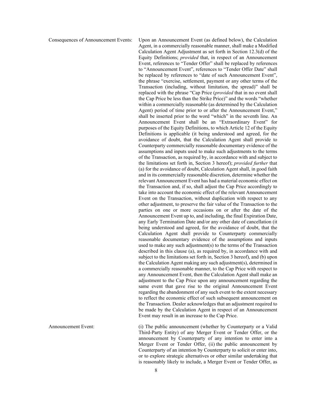 8 Consequences of Announcement Events: Upon an Announcement Event (as defined below), the Calculation Agent, in a commercially reasonable manner, shall make a Modified Calculation Agent Adjustment as set forth in Section 12.3(d) of the Equity Definitions; provided that, in respect of an Announcement Event, references to “Tender Offer” shall be replaced by references to “Announcement Event”, references to “Tender Offer Date” shall be replaced by references to “date of such Announcement Event”, the phrase “exercise, settlement, payment or any other terms of the Transaction (including, without limitation, the spread)” shall be replaced with the phrase “Cap Price (provided that in no event shall the Cap Price be less than the Strike Price)” and the words “whether within a commercially reasonable (as determined by the Calculation Agent) period of time prior to or after the Announcement Event,” shall be inserted prior to the word “which” in the seventh line. An Announcement Event shall be an “Extraordinary Event” for purposes of the Equity Definitions, to which Article 12 of the Equity Definitions is applicable (it being understood and agreed, for the avoidance of doubt, that the Calculation Agent shall provide to Counterparty commercially reasonable documentary evidence of the assumptions and inputs used to make such adjustments to the terms of the Transaction, as required by, in accordance with and subject to the limitations set forth in, Section 3 hereof); provided further that (a) for the avoidance of doubt, Calculation Agent shall, in good faith and in its commercially reasonable discretion, determine whether the relevant Announcement Event has had a material economic effect on the Transaction and, if so, shall adjust the Cap Price accordingly to take into account the economic effect of the relevant Announcement Event on the Transaction, without duplication with respect to any other adjustment, to preserve the fair value of the Transaction to the parties on one or more occasions on or after the date of the Announcement Event up to, and including, the final Expiration Date, any Early Termination Date and/or any other date of cancellation (it being understood and agreed, for the avoidance of doubt, that the Calculation Agent shall provide to Counterparty commercially reasonable documentary evidence of the assumptions and inputs used to make any such adjustment(s) to the terms of the Transaction described in this clause (a), as required by, in accordance with and subject to the limitations set forth in, Section 3 hereof), and (b) upon the Calculation Agent making any such adjustment(s), determined in a commercially reasonable manner, to the Cap Price with respect to any Announcement Event, then the Calculation Agent shall make an adjustment to the Cap Price upon any announcement regarding the same event that gave rise to the original Announcement Event regarding the abandonment of any such event to the extent necessary to reflect the economic effect of such subsequent announcement on the Transaction. Dealer acknowledges that an adjustment required to be made by the Calculation Agent in respect of an Announcement Event may result in an increase to the Cap Price. Announcement Event: (i) The public announcement (whether by Counterparty or a Valid Third-Party Entity) of any Merger Event or Tender Offer, or the announcement by Counterparty of any intention to enter into a Merger Event or Tender Offer, (ii) the public announcement by Counterparty of an intention by Counterparty to solicit or enter into, or to explore strategic alternatives or other similar undertaking that is reasonably likely to include, a Merger Event or Tender Offer, as
