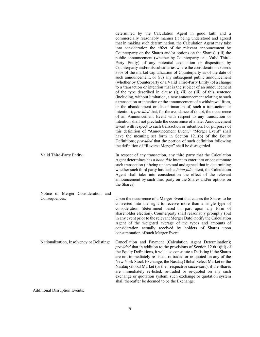9 determined by the Calculation Agent in good faith and a commercially reasonably manner (it being understood and agreed that in making such determination, the Calculation Agent may take into consideration the effect of the relevant announcement by Counterparty on the Shares and/or options on the Shares), (iii) the public announcement (whether by Counterparty or a Valid Third- Party Entity) of any potential acquisition or disposition by Counterparty and/or its subsidiaries where the consideration exceeds 33% of the market capitalization of Counterparty as of the date of such announcement, or (iv) any subsequent public announcement (whether by Counterparty or a Valid Third-Party Entity) of a change to a transaction or intention that is the subject of an announcement of the type described in clause (i), (ii) or (iii) of this sentence (including, without limitation, a new announcement relating to such a transaction or intention or the announcement of a withdrawal from, or the abandonment or discontinuation of, such a transaction or intention); provided that, for the avoidance of doubt, the occurrence of an Announcement Event with respect to any transaction or intention shall not preclude the occurrence of a later Announcement Event with respect to such transaction or intention. For purposes of this definition of “Announcement Event,” “Merger Event” shall have the meaning set forth in Section 12.1(b) of the Equity Definitions; provided that the portion of such definition following the definition of “Reverse Merger” shall be disregarded. Valid Third-Party Entity: In respect of any transaction, any third party that the Calculation Agent determines has a bona fide intent to enter into or consummate such transaction (it being understood and agreed that in determining whether such third party has such a bona fide intent, the Calculation Agent shall take into consideration the effect of the relevant announcement by such third party on the Shares and/or options on the Shares). Notice of Merger Consideration and Consequences: Upon the occurrence of a Merger Event that causes the Shares to be converted into the right to receive more than a single type of consideration (determined based in part upon any form of shareholder election), Counterparty shall reasonably promptly (but in any event prior to the relevant Merger Date) notify the Calculation Agent of the weighted average of the types and amounts of consideration actually received by holders of Shares upon consummation of such Merger Event. Nationalization, Insolvency or Delisting: Cancellation and Payment (Calculation Agent Determination); provided that in addition to the provisions of Section 12.6(a)(iii) of the Equity Definitions, it will also constitute a Delisting if the Shares are not immediately re-listed, re-traded or re-quoted on any of the New York Stock Exchange, the Nasdaq Global Select Market or the Nasdaq Global Market (or their respective successors); if the Shares are immediately re-listed, re-traded or re-quoted on any such exchange or quotation system, such exchange or quotation system shall thereafter be deemed to be the Exchange. Additional Disruption Events: