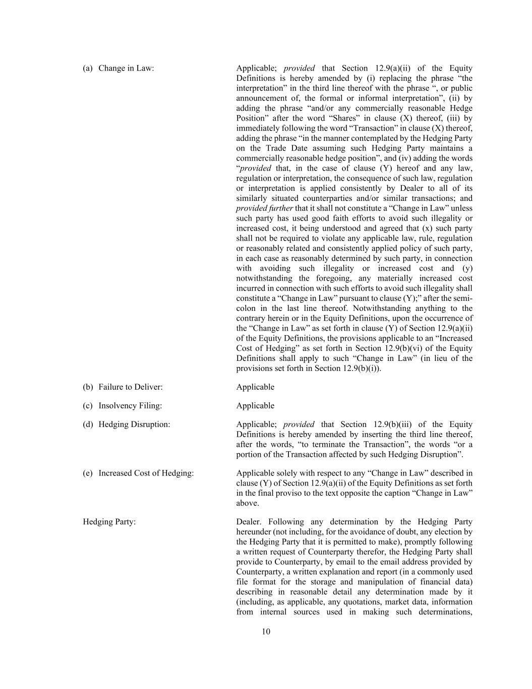 10 (a) Change in Law: Applicable; provided that Section 12.9(a)(ii) of the Equity Definitions is hereby amended by (i) replacing the phrase “the interpretation” in the third line thereof with the phrase “, or public announcement of, the formal or informal interpretation”, (ii) by adding the phrase “and/or any commercially reasonable Hedge Position” after the word “Shares” in clause (X) thereof, (iii) by immediately following the word “Transaction” in clause (X) thereof, adding the phrase “in the manner contemplated by the Hedging Party on the Trade Date assuming such Hedging Party maintains a commercially reasonable hedge position”, and (iv) adding the words “provided that, in the case of clause (Y) hereof and any law, regulation or interpretation, the consequence of such law, regulation or interpretation is applied consistently by Dealer to all of its similarly situated counterparties and/or similar transactions; and provided further that it shall not constitute a “Change in Law” unless such party has used good faith efforts to avoid such illegality or increased cost, it being understood and agreed that (x) such party shall not be required to violate any applicable law, rule, regulation or reasonably related and consistently applied policy of such party, in each case as reasonably determined by such party, in connection with avoiding such illegality or increased cost and (y) notwithstanding the foregoing, any materially increased cost incurred in connection with such efforts to avoid such illegality shall constitute a “Change in Law” pursuant to clause (Y);” after the semi- colon in the last line thereof. Notwithstanding anything to the contrary herein or in the Equity Definitions, upon the occurrence of the “Change in Law” as set forth in clause (Y) of Section 12.9(a)(ii) of the Equity Definitions, the provisions applicable to an “Increased Cost of Hedging” as set forth in Section 12.9(b)(vi) of the Equity Definitions shall apply to such “Change in Law” (in lieu of the provisions set forth in Section 12.9(b)(i)). (b) Failure to Deliver: Applicable (c) Insolvency Filing: Applicable (d) Hedging Disruption: Applicable; provided that Section 12.9(b)(iii) of the Equity Definitions is hereby amended by inserting the third line thereof, after the words, “to terminate the Transaction”, the words “or a portion of the Transaction affected by such Hedging Disruption”. (e) Increased Cost of Hedging: Applicable solely with respect to any “Change in Law” described in clause (Y) of Section 12.9(a)(ii) of the Equity Definitions as set forth in the final proviso to the text opposite the caption “Change in Law” above. Hedging Party: Dealer. Following any determination by the Hedging Party hereunder (not including, for the avoidance of doubt, any election by the Hedging Party that it is permitted to make), promptly following a written request of Counterparty therefor, the Hedging Party shall provide to Counterparty, by email to the email address provided by Counterparty, a written explanation and report (in a commonly used file format for the storage and manipulation of financial data) describing in reasonable detail any determination made by it (including, as applicable, any quotations, market data, information from internal sources used in making such determinations,