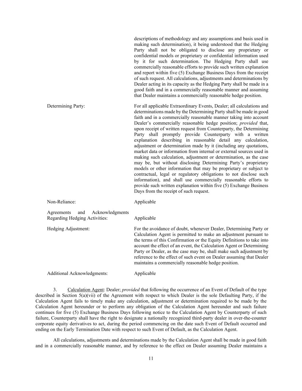 11 descriptions of methodology and any assumptions and basis used in making such determination), it being understood that the Hedging Party shall not be obligated to disclose any proprietary or confidential models or proprietary or confidential information used by it for such determination. The Hedging Party shall use commercially reasonable efforts to provide such written explanation and report within five (5) Exchange Business Days from the receipt of such request. All calculations, adjustments and determinations by Dealer acting in its capacity as the Hedging Party shall be made in a good faith and in a commercially reasonable manner and assuming that Dealer maintains a commercially reasonable hedge position. Determining Party: For all applicable Extraordinary Events, Dealer; all calculations and determinations made by the Determining Party shall be made in good faith and in a commercially reasonable manner taking into account Dealer’s commercially reasonable hedge position; provided that, upon receipt of written request from Counterparty, the Determining Party shall promptly provide Counterparty with a written explanation describing in reasonable detail any calculation, adjustment or determination made by it (including any quotations, market data or information from internal or external sources used in making such calculation, adjustment or determination, as the case may be, but without disclosing Determining Party’s proprietary models or other information that may be proprietary or subject to contractual, legal or regulatory obligations to not disclose such information), and shall use commercially reasonable efforts to provide such written explanation within five (5) Exchange Business Days from the receipt of such request. Non-Reliance: Applicable Agreements and Acknowledgments Regarding Hedging Activities: Applicable Hedging Adjustment: For the avoidance of doubt, whenever Dealer, Determining Party or Calculation Agent is permitted to make an adjustment pursuant to the terms of this Confirmation or the Equity Definitions to take into account the effect of an event, the Calculation Agent or Determining Party or Dealer, as the case may be, shall make such adjustment by reference to the effect of such event on Dealer assuming that Dealer maintains a commercially reasonable hedge position. Additional Acknowledgments: Applicable 3. Calculation Agent: Dealer; provided that following the occurrence of an Event of Default of the type described in Section 5(a)(vii) of the Agreement with respect to which Dealer is the sole Defaulting Party, if the Calculation Agent fails to timely make any calculation, adjustment or determination required to be made by the Calculation Agent hereunder or to perform any obligation of the Calculation Agent hereunder and such failure continues for five (5) Exchange Business Days following notice to the Calculation Agent by Counterparty of such failure, Counterparty shall have the right to designate a nationally recognized third-party dealer in over-the-counter corporate equity derivatives to act, during the period commencing on the date such Event of Default occurred and ending on the Early Termination Date with respect to such Event of Default, as the Calculation Agent. All calculations, adjustments and determinations made by the Calculation Agent shall be made in good faith and in a commercially reasonable manner, and by reference to the effect on Dealer assuming Dealer maintains a