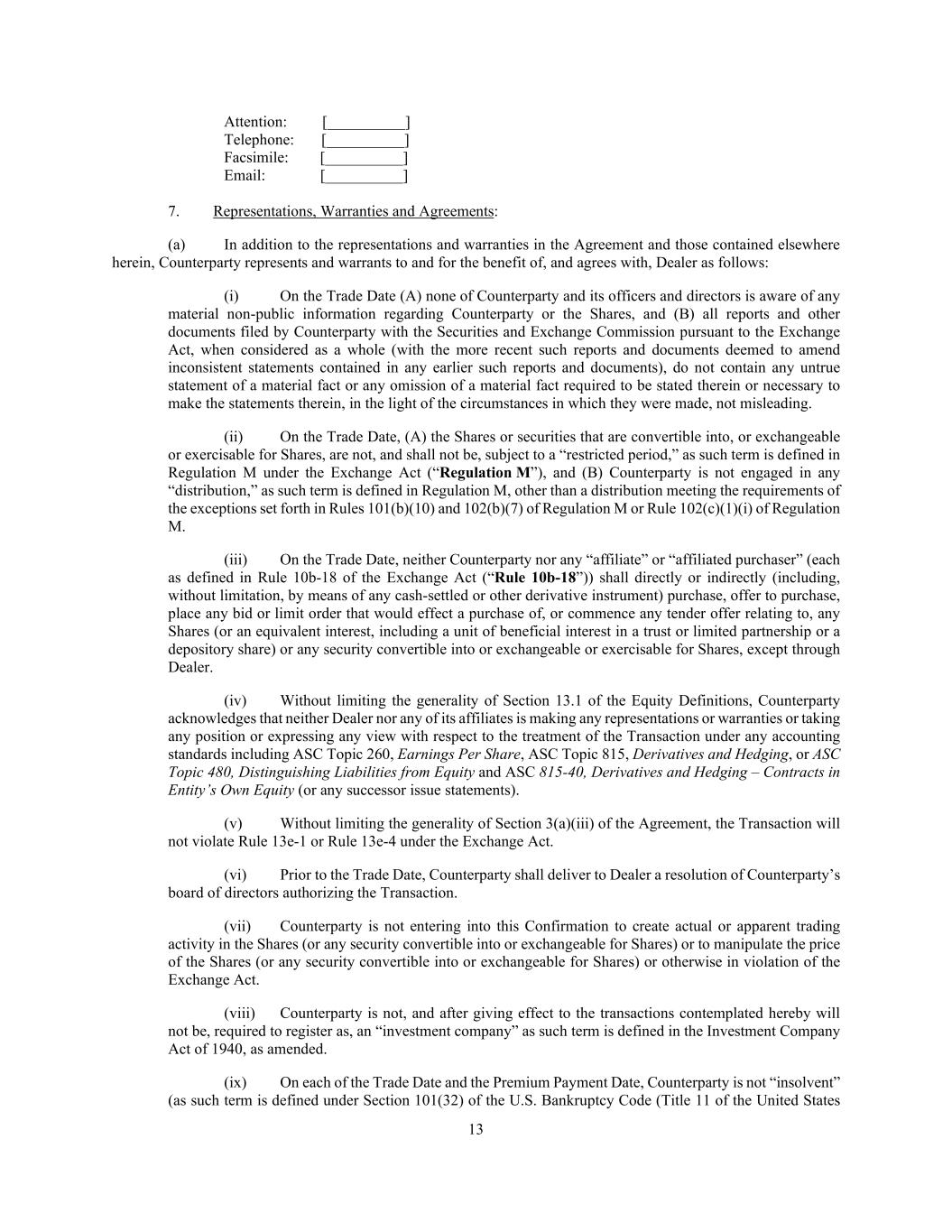 13 Attention: [__________] Telephone: [__________] Facsimile: [__________] Email: [__________] 7. Representations, Warranties and Agreements: (a) In addition to the representations and warranties in the Agreement and those contained elsewhere herein, Counterparty represents and warrants to and for the benefit of, and agrees with, Dealer as follows: (i) On the Trade Date (A) none of Counterparty and its officers and directors is aware of any material non-public information regarding Counterparty or the Shares, and (B) all reports and other documents filed by Counterparty with the Securities and Exchange Commission pursuant to the Exchange Act, when considered as a whole (with the more recent such reports and documents deemed to amend inconsistent statements contained in any earlier such reports and documents), do not contain any untrue statement of a material fact or any omission of a material fact required to be stated therein or necessary to make the statements therein, in the light of the circumstances in which they were made, not misleading. (ii) On the Trade Date, (A) the Shares or securities that are convertible into, or exchangeable or exercisable for Shares, are not, and shall not be, subject to a “restricted period,” as such term is defined in Regulation M under the Exchange Act (“Regulation M”), and (B) Counterparty is not engaged in any “distribution,” as such term is defined in Regulation M, other than a distribution meeting the requirements of the exceptions set forth in Rules 101(b)(10) and 102(b)(7) of Regulation M or Rule 102(c)(1)(i) of Regulation M. (iii) On the Trade Date, neither Counterparty nor any “affiliate” or “affiliated purchaser” (each as defined in Rule 10b-18 of the Exchange Act (“Rule 10b-18”)) shall directly or indirectly (including, without limitation, by means of any cash-settled or other derivative instrument) purchase, offer to purchase, place any bid or limit order that would effect a purchase of, or commence any tender offer relating to, any Shares (or an equivalent interest, including a unit of beneficial interest in a trust or limited partnership or a depository share) or any security convertible into or exchangeable or exercisable for Shares, except through Dealer. (iv) Without limiting the generality of Section 13.1 of the Equity Definitions, Counterparty acknowledges that neither Dealer nor any of its affiliates is making any representations or warranties or taking any position or expressing any view with respect to the treatment of the Transaction under any accounting standards including ASC Topic 260, Earnings Per Share, ASC Topic 815, Derivatives and Hedging, or ASC Topic 480, Distinguishing Liabilities from Equity and ASC 815-40, Derivatives and Hedging – Contracts in Entity’s Own Equity (or any successor issue statements). (v) Without limiting the generality of Section 3(a)(iii) of the Agreement, the Transaction will not violate Rule 13e-1 or Rule 13e-4 under the Exchange Act. (vi) Prior to the Trade Date, Counterparty shall deliver to Dealer a resolution of Counterparty’s board of directors authorizing the Transaction. (vii) Counterparty is not entering into this Confirmation to create actual or apparent trading activity in the Shares (or any security convertible into or exchangeable for Shares) or to manipulate the price of the Shares (or any security convertible into or exchangeable for Shares) or otherwise in violation of the Exchange Act. (viii) Counterparty is not, and after giving effect to the transactions contemplated hereby will not be, required to register as, an “investment company” as such term is defined in the Investment Company Act of 1940, as amended. (ix) On each of the Trade Date and the Premium Payment Date, Counterparty is not “insolvent” (as such term is defined under Section 101(32) of the U.S. Bankruptcy Code (Title 11 of the United States