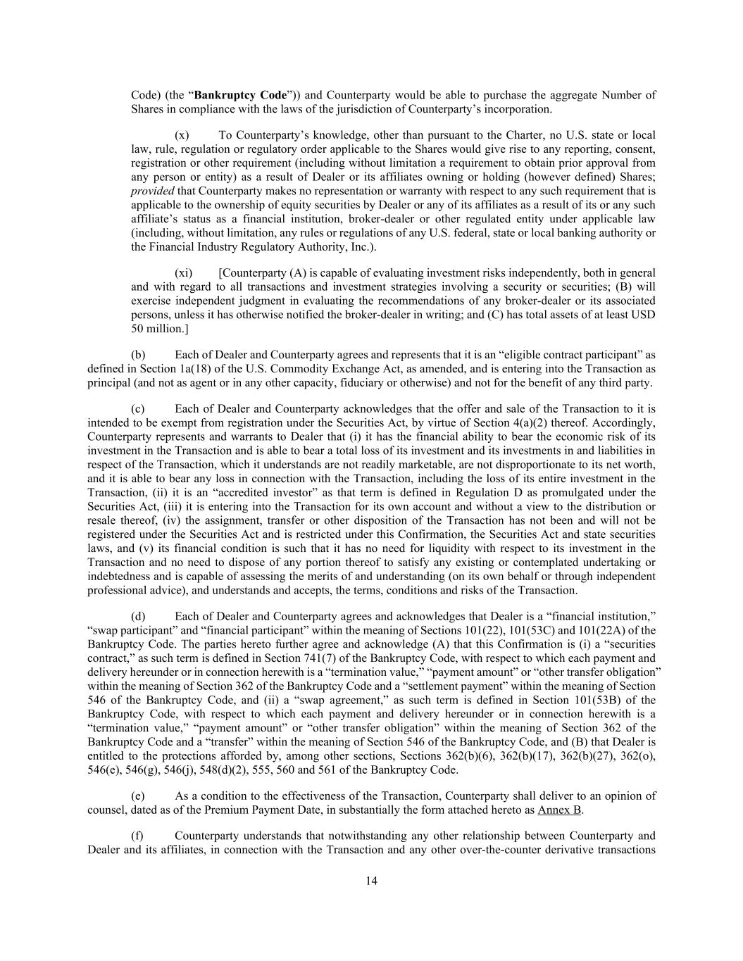 14 Code) (the “Bankruptcy Code”)) and Counterparty would be able to purchase the aggregate Number of Shares in compliance with the laws of the jurisdiction of Counterparty’s incorporation. (x) To Counterparty’s knowledge, other than pursuant to the Charter, no U.S. state or local law, rule, regulation or regulatory order applicable to the Shares would give rise to any reporting, consent, registration or other requirement (including without limitation a requirement to obtain prior approval from any person or entity) as a result of Dealer or its affiliates owning or holding (however defined) Shares; provided that Counterparty makes no representation or warranty with respect to any such requirement that is applicable to the ownership of equity securities by Dealer or any of its affiliates as a result of its or any such affiliate’s status as a financial institution, broker-dealer or other regulated entity under applicable law (including, without limitation, any rules or regulations of any U.S. federal, state or local banking authority or the Financial Industry Regulatory Authority, Inc.). (xi) [Counterparty (A) is capable of evaluating investment risks independently, both in general and with regard to all transactions and investment strategies involving a security or securities; (B) will exercise independent judgment in evaluating the recommendations of any broker-dealer or its associated persons, unless it has otherwise notified the broker-dealer in writing; and (C) has total assets of at least USD 50 million.] (b) Each of Dealer and Counterparty agrees and represents that it is an “eligible contract participant” as defined in Section 1a(18) of the U.S. Commodity Exchange Act, as amended, and is entering into the Transaction as principal (and not as agent or in any other capacity, fiduciary or otherwise) and not for the benefit of any third party. (c) Each of Dealer and Counterparty acknowledges that the offer and sale of the Transaction to it is intended to be exempt from registration under the Securities Act, by virtue of Section 4(a)(2) thereof. Accordingly, Counterparty represents and warrants to Dealer that (i) it has the financial ability to bear the economic risk of its investment in the Transaction and is able to bear a total loss of its investment and its investments in and liabilities in respect of the Transaction, which it understands are not readily marketable, are not disproportionate to its net worth, and it is able to bear any loss in connection with the Transaction, including the loss of its entire investment in the Transaction, (ii) it is an “accredited investor” as that term is defined in Regulation D as promulgated under the Securities Act, (iii) it is entering into the Transaction for its own account and without a view to the distribution or resale thereof, (iv) the assignment, transfer or other disposition of the Transaction has not been and will not be registered under the Securities Act and is restricted under this Confirmation, the Securities Act and state securities laws, and (v) its financial condition is such that it has no need for liquidity with respect to its investment in the Transaction and no need to dispose of any portion thereof to satisfy any existing or contemplated undertaking or indebtedness and is capable of assessing the merits of and understanding (on its own behalf or through independent professional advice), and understands and accepts, the terms, conditions and risks of the Transaction. (d) Each of Dealer and Counterparty agrees and acknowledges that Dealer is a “financial institution,” “swap participant” and “financial participant” within the meaning of Sections 101(22), 101(53C) and 101(22A) of the Bankruptcy Code. The parties hereto further agree and acknowledge (A) that this Confirmation is (i) a “securities contract,” as such term is defined in Section 741(7) of the Bankruptcy Code, with respect to which each payment and delivery hereunder or in connection herewith is a “termination value,” “payment amount” or “other transfer obligation” within the meaning of Section 362 of the Bankruptcy Code and a “settlement payment” within the meaning of Section 546 of the Bankruptcy Code, and (ii) a “swap agreement,” as such term is defined in Section 101(53B) of the Bankruptcy Code, with respect to which each payment and delivery hereunder or in connection herewith is a “termination value,” “payment amount” or “other transfer obligation” within the meaning of Section 362 of the Bankruptcy Code and a “transfer” within the meaning of Section 546 of the Bankruptcy Code, and (B) that Dealer is entitled to the protections afforded by, among other sections, Sections 362(b)(6), 362(b)(17), 362(b)(27), 362(o), 546(e), 546(g), 546(j), 548(d)(2), 555, 560 and 561 of the Bankruptcy Code. (e) As a condition to the effectiveness of the Transaction, Counterparty shall deliver to an opinion of counsel, dated as of the Premium Payment Date, in substantially the form attached hereto as Annex B. (f) Counterparty understands that notwithstanding any other relationship between Counterparty and Dealer and its affiliates, in connection with the Transaction and any other over-the-counter derivative transactions