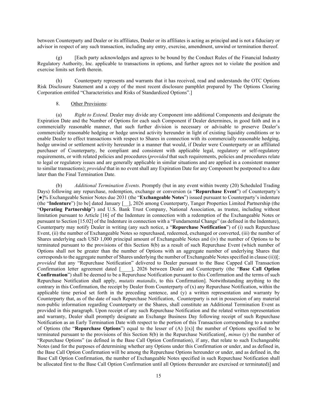 15 between Counterparty and Dealer or its affiliates, Dealer or its affiliates is acting as principal and is not a fiduciary or advisor in respect of any such transaction, including any entry, exercise, amendment, unwind or termination thereof. (g) [Each party acknowledges and agrees to be bound by the Conduct Rules of the Financial Industry Regulatory Authority, Inc. applicable to transactions in options, and further agrees not to violate the position and exercise limits set forth therein. (h) Counterparty represents and warrants that it has received, read and understands the OTC Options Risk Disclosure Statement and a copy of the most recent disclosure pamphlet prepared by The Options Clearing Corporation entitled “Characteristics and Risks of Standardized Options”.] 8. Other Provisions: (a) Right to Extend. Dealer may divide any Component into additional Components and designate the Expiration Date and the Number of Options for each such Component if Dealer determines, in good faith and in a commercially reasonable manner, that such further division is necessary or advisable to preserve Dealer’s commercially reasonable hedging or hedge unwind activity hereunder in light of existing liquidity conditions or to enable Dealer to effect transactions with respect to Shares in connection with its commercially reasonable hedging, hedge unwind or settlement activity hereunder in a manner that would, if Dealer were Counterparty or an affiliated purchaser of Counterparty, be compliant and consistent with applicable legal, regulatory or self-regulatory requirements, or with related policies and procedures (provided that such requirements, policies and procedures relate to legal or regulatory issues and are generally applicable in similar situations and are applied in a consistent manner to similar transactions); provided that in no event shall any Expiration Date for any Component be postponed to a date later than the Final Termination Date. (b) Additional Termination Events. Promptly (but in any event within twenty (20) Scheduled Trading Days) following any repurchase, redemption, exchange or conversion (a “Repurchase Event”) of Counterparty’s [●]% Exchangeable Senior Notes due 2031 (the “Exchangeable Notes”) issued pursuant to Counterparty’s indenture (the “Indenture”) [to be] dated January [__], 2026 among Counterparty, Tanger Properties Limited Partnership (the “Operating Partnership”) and U.S. Bank Trust Company, National Association, as trustee, including without limitation pursuant to Article [16] of the Indenture in connection with a redemption of the Exchangeable Notes or pursuant to Section [15.02] of the Indenture in connection with a “Fundamental Change” (as defined in the Indenture), Counterparty may notify Dealer in writing (any such notice, a “Repurchase Notification”) of (i) such Repurchase Event, (ii) the number of Exchangeable Notes so repurchased, redeemed, exchanged or converted, (iii) the number of Shares underlying each USD 1,000 principal amount of Exchangeable Notes and (iv) the number of Options to be terminated pursuant to the provisions of this Section 8(b) as a result of such Repurchase Event (which number of Options shall not be greater than the number of Options with an aggregate number of underlying Shares that corresponds to the aggregate number of Shares underlying the number of Exchangeable Notes specified in clause (ii))[; provided that any “Repurchase Notification” delivered to Dealer pursuant to the Base Capped Call Transaction Confirmation letter agreement dated [____], 2026 between Dealer and Counterparty (the “Base Call Option Confirmation”) shall be deemed to be a Repurchase Notification pursuant to this Confirmation and the terms of such Repurchase Notification shall apply, mutatis mutandis, to this Confirmation]. Notwithstanding anything to the contrary in this Confirmation, the receipt by Dealer from Counterparty of (x) any Repurchase Notification, within the applicable time period set forth in the preceding sentence, and (y) a written representation and warranty by Counterparty that, as of the date of such Repurchase Notification, Counterparty is not in possession of any material non-public information regarding Counterparty or the Shares, shall constitute an Additional Termination Event as provided in this paragraph. Upon receipt of any such Repurchase Notification and the related written representation and warranty, Dealer shall promptly designate an Exchange Business Day following receipt of such Repurchase Notification as an Early Termination Date with respect to the portion of this Transaction corresponding to a number of Options (the “Repurchase Options”) equal to the lesser of (A) [(x)] the number of Options specified to be terminated pursuant to the provisions of this Section 8(b) in the Repurchase Notification[, minus (y) the number of “Repurchase Options” (as defined in the Base Call Option Confirmation), if any, that relate to such Exchangeable Notes (and for the purposes of determining whether any Options under this Confirmation or under, and as defined in, the Base Call Option Confirmation will be among the Repurchase Options hereunder or under, and as defined in, the Base Call Option Confirmation, the number of Exchangeable Notes specified in such Repurchase Notification shall be allocated first to the Base Call Option Confirmation until all Options thereunder are exercised or terminated)] and