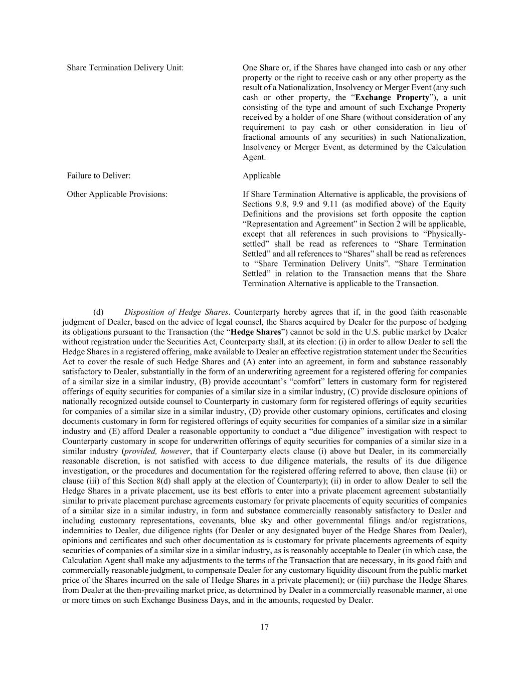 17 Share Termination Delivery Unit: One Share or, if the Shares have changed into cash or any other property or the right to receive cash or any other property as the result of a Nationalization, Insolvency or Merger Event (any such cash or other property, the “Exchange Property”), a unit consisting of the type and amount of such Exchange Property received by a holder of one Share (without consideration of any requirement to pay cash or other consideration in lieu of fractional amounts of any securities) in such Nationalization, Insolvency or Merger Event, as determined by the Calculation Agent. Failure to Deliver: Applicable Other Applicable Provisions: If Share Termination Alternative is applicable, the provisions of Sections 9.8, 9.9 and 9.11 (as modified above) of the Equity Definitions and the provisions set forth opposite the caption “Representation and Agreement” in Section 2 will be applicable, except that all references in such provisions to “Physically- settled” shall be read as references to “Share Termination Settled” and all references to “Shares” shall be read as references to “Share Termination Delivery Units”. “Share Termination Settled” in relation to the Transaction means that the Share Termination Alternative is applicable to the Transaction. (d) Disposition of Hedge Shares. Counterparty hereby agrees that if, in the good faith reasonable judgment of Dealer, based on the advice of legal counsel, the Shares acquired by Dealer for the purpose of hedging its obligations pursuant to the Transaction (the “Hedge Shares”) cannot be sold in the U.S. public market by Dealer without registration under the Securities Act, Counterparty shall, at its election: (i) in order to allow Dealer to sell the Hedge Shares in a registered offering, make available to Dealer an effective registration statement under the Securities Act to cover the resale of such Hedge Shares and (A) enter into an agreement, in form and substance reasonably satisfactory to Dealer, substantially in the form of an underwriting agreement for a registered offering for companies of a similar size in a similar industry, (B) provide accountant’s “comfort” letters in customary form for registered offerings of equity securities for companies of a similar size in a similar industry, (C) provide disclosure opinions of nationally recognized outside counsel to Counterparty in customary form for registered offerings of equity securities for companies of a similar size in a similar industry, (D) provide other customary opinions, certificates and closing documents customary in form for registered offerings of equity securities for companies of a similar size in a similar industry and (E) afford Dealer a reasonable opportunity to conduct a “due diligence” investigation with respect to Counterparty customary in scope for underwritten offerings of equity securities for companies of a similar size in a similar industry (provided, however, that if Counterparty elects clause (i) above but Dealer, in its commercially reasonable discretion, is not satisfied with access to due diligence materials, the results of its due diligence investigation, or the procedures and documentation for the registered offering referred to above, then clause (ii) or clause (iii) of this Section 8(d) shall apply at the election of Counterparty); (ii) in order to allow Dealer to sell the Hedge Shares in a private placement, use its best efforts to enter into a private placement agreement substantially similar to private placement purchase agreements customary for private placements of equity securities of companies of a similar size in a similar industry, in form and substance commercially reasonably satisfactory to Dealer and including customary representations, covenants, blue sky and other governmental filings and/or registrations, indemnities to Dealer, due diligence rights (for Dealer or any designated buyer of the Hedge Shares from Dealer), opinions and certificates and such other documentation as is customary for private placements agreements of equity securities of companies of a similar size in a similar industry, as is reasonably acceptable to Dealer (in which case, the Calculation Agent shall make any adjustments to the terms of the Transaction that are necessary, in its good faith and commercially reasonable judgment, to compensate Dealer for any customary liquidity discount from the public market price of the Shares incurred on the sale of Hedge Shares in a private placement); or (iii) purchase the Hedge Shares from Dealer at the then-prevailing market price, as determined by Dealer in a commercially reasonable manner, at one or more times on such Exchange Business Days, and in the amounts, requested by Dealer.