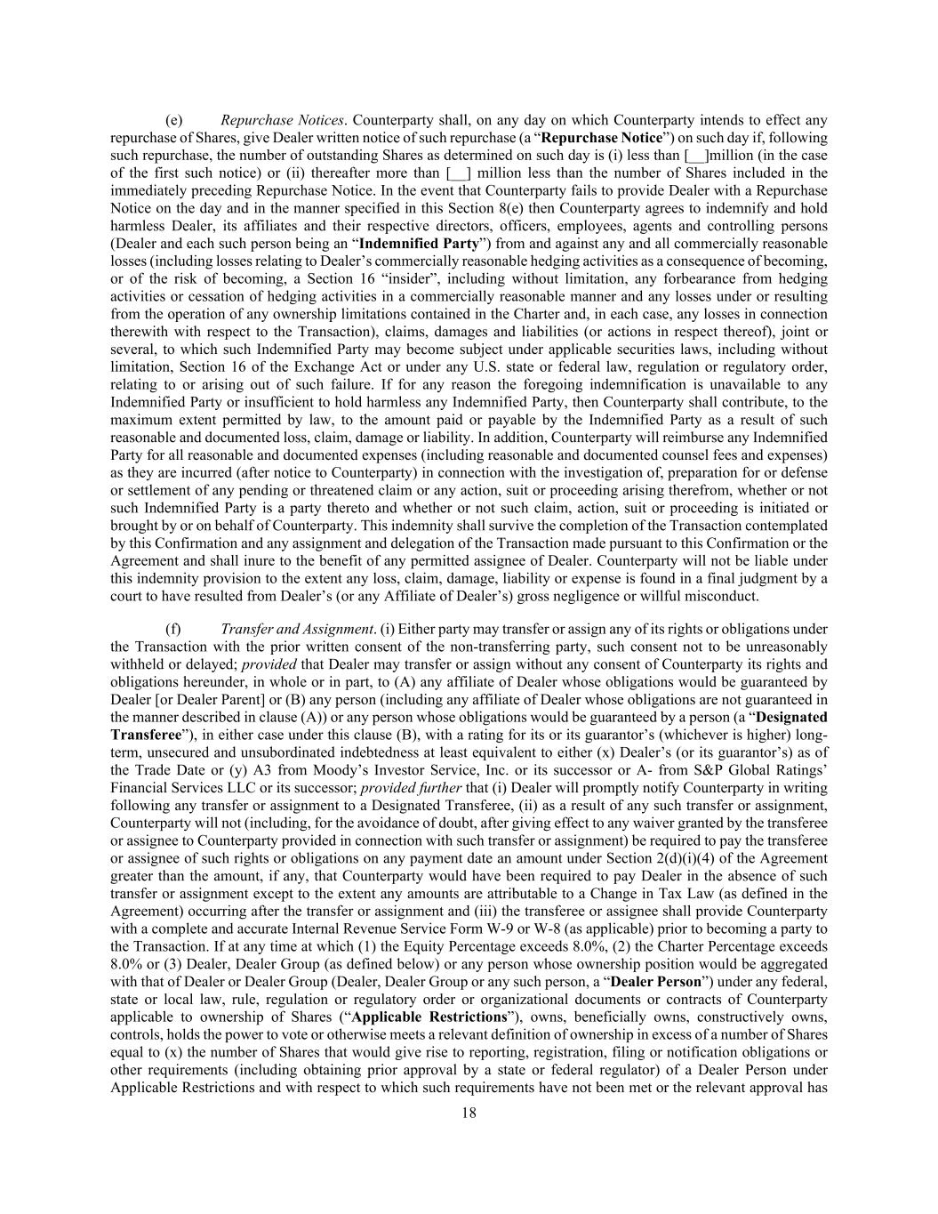 18 (e) Repurchase Notices. Counterparty shall, on any day on which Counterparty intends to effect any repurchase of Shares, give Dealer written notice of such repurchase (a “Repurchase Notice”) on such day if, following such repurchase, the number of outstanding Shares as determined on such day is (i) less than [__]million (in the case of the first such notice) or (ii) thereafter more than [__] million less than the number of Shares included in the immediately preceding Repurchase Notice. In the event that Counterparty fails to provide Dealer with a Repurchase Notice on the day and in the manner specified in this Section 8(e) then Counterparty agrees to indemnify and hold harmless Dealer, its affiliates and their respective directors, officers, employees, agents and controlling persons (Dealer and each such person being an “Indemnified Party”) from and against any and all commercially reasonable losses (including losses relating to Dealer’s commercially reasonable hedging activities as a consequence of becoming, or of the risk of becoming, a Section 16 “insider”, including without limitation, any forbearance from hedging activities or cessation of hedging activities in a commercially reasonable manner and any losses under or resulting from the operation of any ownership limitations contained in the Charter and, in each case, any losses in connection therewith with respect to the Transaction), claims, damages and liabilities (or actions in respect thereof), joint or several, to which such Indemnified Party may become subject under applicable securities laws, including without limitation, Section 16 of the Exchange Act or under any U.S. state or federal law, regulation or regulatory order, relating to or arising out of such failure. If for any reason the foregoing indemnification is unavailable to any Indemnified Party or insufficient to hold harmless any Indemnified Party, then Counterparty shall contribute, to the maximum extent permitted by law, to the amount paid or payable by the Indemnified Party as a result of such reasonable and documented loss, claim, damage or liability. In addition, Counterparty will reimburse any Indemnified Party for all reasonable and documented expenses (including reasonable and documented counsel fees and expenses) as they are incurred (after notice to Counterparty) in connection with the investigation of, preparation for or defense or settlement of any pending or threatened claim or any action, suit or proceeding arising therefrom, whether or not such Indemnified Party is a party thereto and whether or not such claim, action, suit or proceeding is initiated or brought by or on behalf of Counterparty. This indemnity shall survive the completion of the Transaction contemplated by this Confirmation and any assignment and delegation of the Transaction made pursuant to this Confirmation or the Agreement and shall inure to the benefit of any permitted assignee of Dealer. Counterparty will not be liable under this indemnity provision to the extent any loss, claim, damage, liability or expense is found in a final judgment by a court to have resulted from Dealer’s (or any Affiliate of Dealer’s) gross negligence or willful misconduct. (f) Transfer and Assignment. (i) Either party may transfer or assign any of its rights or obligations under the Transaction with the prior written consent of the non-transferring party, such consent not to be unreasonably withheld or delayed; provided that Dealer may transfer or assign without any consent of Counterparty its rights and obligations hereunder, in whole or in part, to (A) any affiliate of Dealer whose obligations would be guaranteed by Dealer [or Dealer Parent] or (B) any person (including any affiliate of Dealer whose obligations are not guaranteed in the manner described in clause (A)) or any person whose obligations would be guaranteed by a person (a “Designated Transferee”), in either case under this clause (B), with a rating for its or its guarantor’s (whichever is higher) long- term, unsecured and unsubordinated indebtedness at least equivalent to either (x) Dealer’s (or its guarantor’s) as of the Trade Date or (y) A3 from Moody’s Investor Service, Inc. or its successor or A- from S&P Global Ratings’ Financial Services LLC or its successor; provided further that (i) Dealer will promptly notify Counterparty in writing following any transfer or assignment to a Designated Transferee, (ii) as a result of any such transfer or assignment, Counterparty will not (including, for the avoidance of doubt, after giving effect to any waiver granted by the transferee or assignee to Counterparty provided in connection with such transfer or assignment) be required to pay the transferee or assignee of such rights or obligations on any payment date an amount under Section 2(d)(i)(4) of the Agreement greater than the amount, if any, that Counterparty would have been required to pay Dealer in the absence of such transfer or assignment except to the extent any amounts are attributable to a Change in Tax Law (as defined in the Agreement) occurring after the transfer or assignment and (iii) the transferee or assignee shall provide Counterparty with a complete and accurate Internal Revenue Service Form W-9 or W-8 (as applicable) prior to becoming a party to the Transaction. If at any time at which (1) the Equity Percentage exceeds 8.0%, (2) the Charter Percentage exceeds 8.0% or (3) Dealer, Dealer Group (as defined below) or any person whose ownership position would be aggregated with that of Dealer or Dealer Group (Dealer, Dealer Group or any such person, a “Dealer Person”) under any federal, state or local law, rule, regulation or regulatory order or organizational documents or contracts of Counterparty applicable to ownership of Shares (“Applicable Restrictions”), owns, beneficially owns, constructively owns, controls, holds the power to vote or otherwise meets a relevant definition of ownership in