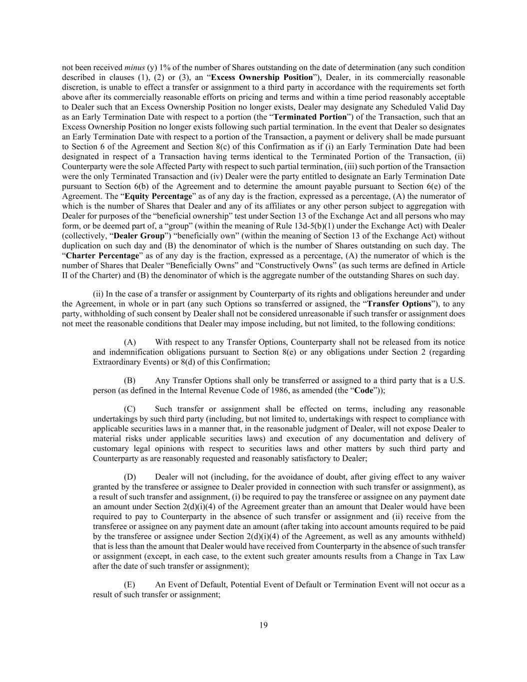 19 not been received minus (y) 1% of the number of Shares outstanding on the date of determination (any such condition described in clauses (1), (2) or (3), an “Excess Ownership Position”), Dealer, in its commercially reasonable discretion, is unable to effect a transfer or assignment to a third party in accordance with the requirements set forth above after its commercially reasonable efforts on pricing and terms and within a time period reasonably acceptable to Dealer such that an Excess Ownership Position no longer exists, Dealer may designate any Scheduled Valid Day as an Early Termination Date with respect to a portion (the “Terminated Portion”) of the Transaction, such that an Excess Ownership Position no longer exists following such partial termination. In the event that Dealer so designates an Early Termination Date with respect to a portion of the Transaction, a payment or delivery shall be made pursuant to Section 6 of the Agreement and Section 8(c) of this Confirmation as if (i) an Early Termination Date had been designated in respect of a Transaction having terms identical to the Terminated Portion of the Transaction, (ii) Counterparty were the sole Affected Party with respect to such partial termination, (iii) such portion of the Transaction were the only Terminated Transaction and (iv) Dealer were the party entitled to designate an Early Termination Date pursuant to Section 6(b) of the Agreement and to determine the amount payable pursuant to Section 6(e) of the Agreement. The “Equity Percentage” as of any day is the fraction, expressed as a percentage, (A) the numerator of which is the number of Shares that Dealer and any of its affiliates or any other person subject to aggregation with Dealer for purposes of the “beneficial ownership” test under Section 13 of the Exchange Act and all persons who may form, or be deemed part of, a “group” (within the meaning of Rule 13d-5(b)(1) under the Exchange Act) with Dealer (collectively, “Dealer Group”) “beneficially own” (within the meaning of Section 13 of the Exchange Act) without duplication on such day and (B) the denominator of which is the number of Shares outstanding on such day. The “Charter Percentage” as of any day is the fraction, expressed as a percentage, (A) the numerator of which is the number of Shares that Dealer “Beneficially Owns” and “Constructively Owns” (as such terms are defined in Article II of the Charter) and (B) the denominator of which is the aggregate number of the outstanding Shares on such day. (ii) In the case of a transfer or assignment by Counterparty of its rights and obligations hereunder and under the Agreement, in whole or in part (any such Options so transferred or assigned, the “Transfer Options”), to any party, withholding of such consent by Dealer shall not be considered unreasonable if such transfer or assignment does not meet the reasonable conditions that Dealer may impose including, but not limited, to the following conditions: (A) With respect to any Transfer Options, Counterparty shall not be released from its notice and indemnification obligations pursuant to Section 8(e) or any obligations under Section 2 (regarding Extraordinary Events) or 8(d) of this Confirmation; (B) Any Transfer Options shall only be transferred or assigned to a third party that is a U.S. person (as defined in the Internal Revenue Code of 1986, as amended (the “Code”)); (C) Such transfer or assignment shall be effected on terms, including any reasonable undertakings by such third party (including, but not limited to, undertakings with respect to compliance with applicable securities laws in a manner that, in the reasonable judgment of Dealer, will not expose Dealer to material risks under applicable securities laws) and execution of any documentation and delivery of customary legal opinions with respect to securities laws and other matters by such third party and Counterparty as are reasonably requested and reasonably satisfactory to Dealer; (D) Dealer will not (including, for the avoidance of doubt, after giving effect to any waiver granted by the transferee or assignee to Dealer provided in connection with such transfer or assignment), as a result of such transfer and assignment, (i) be required to pay the transferee or assignee on any payment date an amount under Section 2(d)(i)(4) of the Agreement greater than an amount that Dealer would have been required to pay to Counterparty in the absence of such transfer or assignment and (ii) receive from the transferee or assignee on any payment date an amount (after taking into account amounts required to be paid by the transferee or assignee under Section 2(d)(i)(4) of the Agreement, as well as any amounts withheld) that is less than the amount that Dealer would have received from Counterparty in the absence of such transfer or assignment (except, in each case, to the extent such greater amounts results from a Change in Tax Law after the date of such transfer or assignment); (E) An Event of Default, Potential Event of Default or Termination Event will not occur as a result of such transfer or assignment;