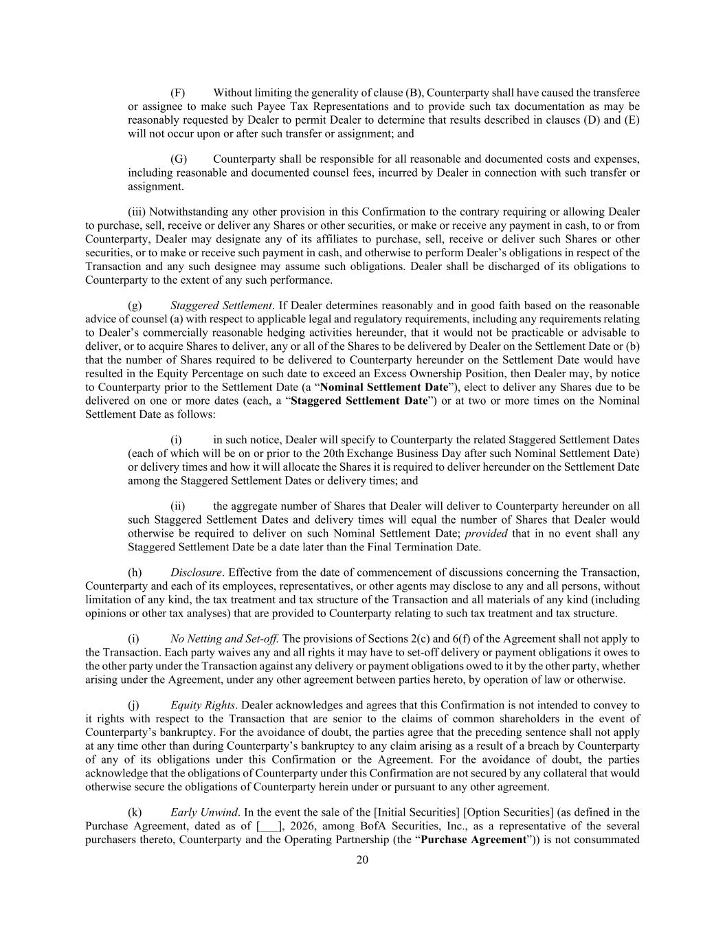 20 (F) Without limiting the generality of clause (B), Counterparty shall have caused the transferee or assignee to make such Payee Tax Representations and to provide such tax documentation as may be reasonably requested by Dealer to permit Dealer to determine that results described in clauses (D) and (E) will not occur upon or after such transfer or assignment; and (G) Counterparty shall be responsible for all reasonable and documented costs and expenses, including reasonable and documented counsel fees, incurred by Dealer in connection with such transfer or assignment. (iii) Notwithstanding any other provision in this Confirmation to the contrary requiring or allowing Dealer to purchase, sell, receive or deliver any Shares or other securities, or make or receive any payment in cash, to or from Counterparty, Dealer may designate any of its affiliates to purchase, sell, receive or deliver such Shares or other securities, or to make or receive such payment in cash, and otherwise to perform Dealer’s obligations in respect of the Transaction and any such designee may assume such obligations. Dealer shall be discharged of its obligations to Counterparty to the extent of any such performance. (g) Staggered Settlement. If Dealer determines reasonably and in good faith based on the reasonable advice of counsel (a) with respect to applicable legal and regulatory requirements, including any requirements relating to Dealer’s commercially reasonable hedging activities hereunder, that it would not be practicable or advisable to deliver, or to acquire Shares to deliver, any or all of the Shares to be delivered by Dealer on the Settlement Date or (b) that the number of Shares required to be delivered to Counterparty hereunder on the Settlement Date would have resulted in the Equity Percentage on such date to exceed an Excess Ownership Position, then Dealer may, by notice to Counterparty prior to the Settlement Date (a “Nominal Settlement Date”), elect to deliver any Shares due to be delivered on one or more dates (each, a “Staggered Settlement Date”) or at two or more times on the Nominal Settlement Date as follows: (i) in such notice, Dealer will specify to Counterparty the related Staggered Settlement Dates (each of which will be on or prior to the 20th Exchange Business Day after such Nominal Settlement Date) or delivery times and how it will allocate the Shares it is required to deliver hereunder on the Settlement Date among the Staggered Settlement Dates or delivery times; and (ii) the aggregate number of Shares that Dealer will deliver to Counterparty hereunder on all such Staggered Settlement Dates and delivery times will equal the number of Shares that Dealer would otherwise be required to deliver on such Nominal Settlement Date; provided that in no event shall any Staggered Settlement Date be a date later than the Final Termination Date. (h) Disclosure. Effective from the date of commencement of discussions concerning the Transaction, Counterparty and each of its employees, representatives, or other agents may disclose to any and all persons, without limitation of any kind, the tax treatment and tax structure of the Transaction and all materials of any kind (including opinions or other tax analyses) that are provided to Counterparty relating to such tax treatment and tax structure. (i) No Netting and Set-off. The provisions of Sections 2(c) and 6(f) of the Agreement shall not apply to the Transaction. Each party waives any and all rights it may have to set-off delivery or payment obligations it owes to the other party under the Transaction against any delivery or payment obligations owed to it by the other party, whether arising under the Agreement, under any other agreement between parties hereto, by operation of law or otherwise. (j) Equity Rights. Dealer acknowledges and agrees that this Confirmation is not intended to convey to it rights with respect to the Transaction that are senior to the claims of common shareholders in the event of Counterparty’s bankruptcy. For the avoidance of doubt, the parties agree that the preceding sentence shall not apply at any time other than during Counterparty’s bankruptcy to any claim arising as a result of a breach by Counterparty of any of its obligations under this Confirmation or the Agreement. For the avoidance of doubt, the parties acknowledge that the obligations of Counterparty under this Confirmation are not secured by any collateral that would otherwise secure the obligations of Counterparty herein under or pursuant to any other agreement. (k) Early Unwind. In the event the sale of the [Initial Securities] [Option Securities] (as defined in the Purchase Agreement, dated as of [___], 2026, among BofA Securities, Inc., as a representative of the several purchasers thereto, Counterparty and the Operating Partnership (the “Purchase Agreement”)) is not consummated