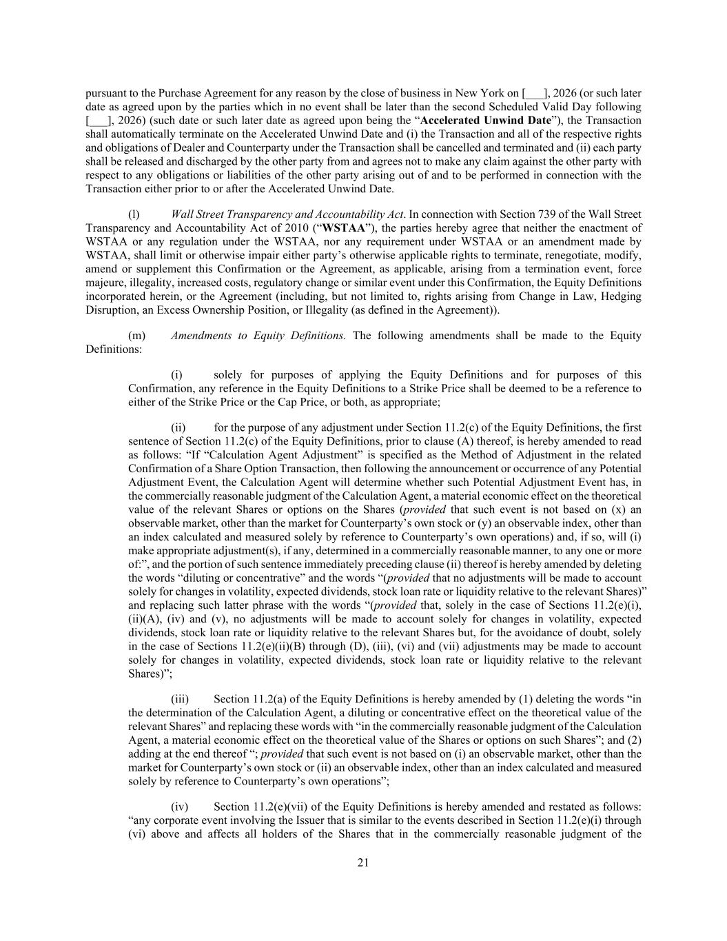 21 pursuant to the Purchase Agreement for any reason by the close of business in New York on [___], 2026 (or such later date as agreed upon by the parties which in no event shall be later than the second Scheduled Valid Day following [___], 2026) (such date or such later date as agreed upon being the “Accelerated Unwind Date”), the Transaction shall automatically terminate on the Accelerated Unwind Date and (i) the Transaction and all of the respective rights and obligations of Dealer and Counterparty under the Transaction shall be cancelled and terminated and (ii) each party shall be released and discharged by the other party from and agrees not to make any claim against the other party with respect to any obligations or liabilities of the other party arising out of and to be performed in connection with the Transaction either prior to or after the Accelerated Unwind Date. (l) Wall Street Transparency and Accountability Act. In connection with Section 739 of the Wall Street Transparency and Accountability Act of 2010 (“WSTAA”), the parties hereby agree that neither the enactment of WSTAA or any regulation under the WSTAA, nor any requirement under WSTAA or an amendment made by WSTAA, shall limit or otherwise impair either party’s otherwise applicable rights to terminate, renegotiate, modify, amend or supplement this Confirmation or the Agreement, as applicable, arising from a termination event, force majeure, illegality, increased costs, regulatory change or similar event under this Confirmation, the Equity Definitions incorporated herein, or the Agreement (including, but not limited to, rights arising from Change in Law, Hedging Disruption, an Excess Ownership Position, or Illegality (as defined in the Agreement)). (m) Amendments to Equity Definitions. The following amendments shall be made to the Equity Definitions: (i) solely for purposes of applying the Equity Definitions and for purposes of this Confirmation, any reference in the Equity Definitions to a Strike Price shall be deemed to be a reference to either of the Strike Price or the Cap Price, or both, as appropriate; (ii) for the purpose of any adjustment under Section 11.2(c) of the Equity Definitions, the first sentence of Section 11.2(c) of the Equity Definitions, prior to clause (A) thereof, is hereby amended to read as follows: “If “Calculation Agent Adjustment” is specified as the Method of Adjustment in the related Confirmation of a Share Option Transaction, then following the announcement or occurrence of any Potential Adjustment Event, the Calculation Agent will determine whether such Potential Adjustment Event has, in the commercially reasonable judgment of the Calculation Agent, a material economic effect on the theoretical value of the relevant Shares or options on the Shares (provided that such event is not based on (x) an observable market, other than the market for Counterparty’s own stock or (y) an observable index, other than an index calculated and measured solely by reference to Counterparty’s own operations) and, if so, will (i) make appropriate adjustment(s), if any, determined in a commercially reasonable manner, to any one or more of:”, and the portion of such sentence immediately preceding clause (ii) thereof is hereby amended by deleting the words “diluting or concentrative” and the words “(provided that no adjustments will be made to account solely for changes in volatility, expected dividends, stock loan rate or liquidity relative to the relevant Shares)” and replacing such latter phrase with the words “(provided that, solely in the case of Sections 11.2(e)(i), (ii)(A), (iv) and (v), no adjustments will be made to account solely for changes in volatility, expected dividends, stock loan rate or liquidity relative to the relevant Shares but, for the avoidance of doubt, solely in the case of Sections 11.2(e)(ii)(B) through (D), (iii), (vi) and (vii) adjustments may be made to account solely for changes in volatility, expected dividends, stock loan rate or liquidity relative to the relevant Shares)”; (iii) Section 11.2(a) of the Equity Definitions is hereby amended by (1) deleting the words “in the determination of the Calculation Agent, a diluting or concentrative effect on the theoretical value of the relevant Shares” and replacing these words with “in the commercially reasonable judgment of the Calculation Agent, a material economic effect on the theoretical value of the Shares or options on such Shares”; and (2) adding at the end thereof “; provided that such event is not based on (i) an observable market, other than the market for Counterparty’s own stock or (ii) an observable index, other than an index calculated and measured solely by reference to Counterparty’s own operations”; (iv) Section 11.2(e)(vii) of the Equity Definitions is hereby amended and restated as follows: “any corporate event involving the Issuer that is similar to the events described in Section 11.2(e)(i) through (vi) above and affects all holders of the Shares that in the commercially reasonable judgment of the