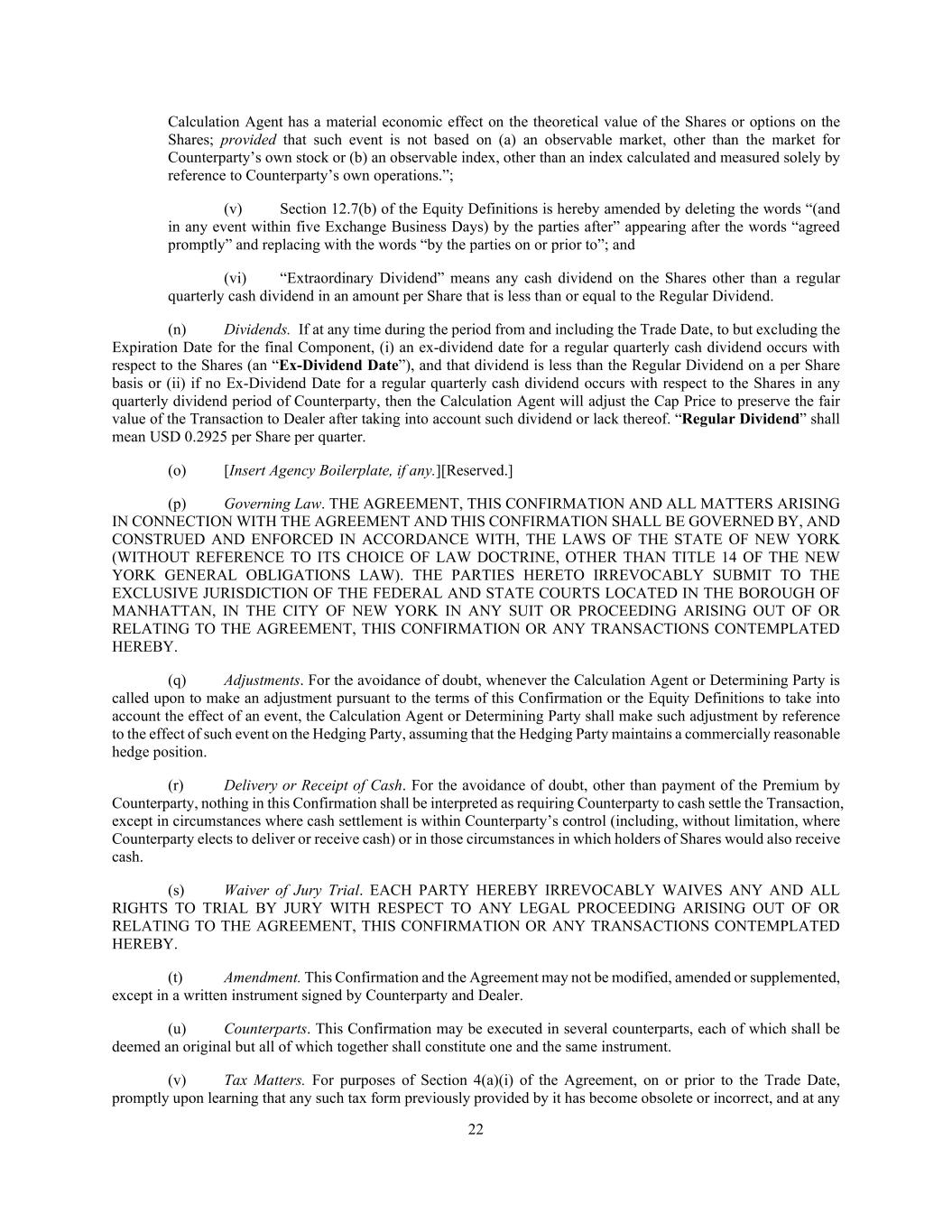 22 Calculation Agent has a material economic effect on the theoretical value of the Shares or options on the Shares; provided that such event is not based on (a) an observable market, other than the market for Counterparty’s own stock or (b) an observable index, other than an index calculated and measured solely by reference to Counterparty’s own operations.”; (v) Section 12.7(b) of the Equity Definitions is hereby amended by deleting the words “(and in any event within five Exchange Business Days) by the parties after” appearing after the words “agreed promptly” and replacing with the words “by the parties on or prior to”; and (vi) “Extraordinary Dividend” means any cash dividend on the Shares other than a regular quarterly cash dividend in an amount per Share that is less than or equal to the Regular Dividend. (n) Dividends. If at any time during the period from and including the Trade Date, to but excluding the Expiration Date for the final Component, (i) an ex-dividend date for a regular quarterly cash dividend occurs with respect to the Shares (an “Ex-Dividend Date”), and that dividend is less than the Regular Dividend on a per Share basis or (ii) if no Ex-Dividend Date for a regular quarterly cash dividend occurs with respect to the Shares in any quarterly dividend period of Counterparty, then the Calculation Agent will adjust the Cap Price to preserve the fair value of the Transaction to Dealer after taking into account such dividend or lack thereof. “Regular Dividend” shall mean USD 0.2925 per Share per quarter. (o) [Insert Agency Boilerplate, if any.][Reserved.] (p) Governing Law. THE AGREEMENT, THIS CONFIRMATION AND ALL MATTERS ARISING IN CONNECTION WITH THE AGREEMENT AND THIS CONFIRMATION SHALL BE GOVERNED BY, AND CONSTRUED AND ENFORCED IN ACCORDANCE WITH, THE LAWS OF THE STATE OF NEW YORK (WITHOUT REFERENCE TO ITS CHOICE OF LAW DOCTRINE, OTHER THAN TITLE 14 OF THE NEW YORK GENERAL OBLIGATIONS LAW). THE PARTIES HERETO IRREVOCABLY SUBMIT TO THE EXCLUSIVE JURISDICTION OF THE FEDERAL AND STATE COURTS LOCATED IN THE BOROUGH OF MANHATTAN, IN THE CITY OF NEW YORK IN ANY SUIT OR PROCEEDING ARISING OUT OF OR RELATING TO THE AGREEMENT, THIS CONFIRMATION OR ANY TRANSACTIONS CONTEMPLATED HEREBY. (q) Adjustments. For the avoidance of doubt, whenever the Calculation Agent or Determining Party is called upon to make an adjustment pursuant to the terms of this Confirmation or the Equity Definitions to take into account the effect of an event, the Calculation Agent or Determining Party shall make such adjustment by reference to the effect of such event on the Hedging Party, assuming that the Hedging Party maintains a commercially reasonable hedge position. (r) Delivery or Receipt of Cash. For the avoidance of doubt, other than payment of the Premium by Counterparty, nothing in this Confirmation shall be interpreted as requiring Counterparty to cash settle the Transaction, except in circumstances where cash settlement is within Counterparty’s control (including, without limitation, where Counterparty elects to deliver or receive cash) or in those circumstances in which holders of Shares would also receive cash. (s) Waiver of Jury Trial. EACH PARTY HEREBY IRREVOCABLY WAIVES ANY AND ALL RIGHTS TO TRIAL BY JURY WITH RESPECT TO ANY LEGAL PROCEEDING ARISING OUT OF OR RELATING TO THE AGREEMENT, THIS CONFIRMATION OR ANY TRANSACTIONS CONTEMPLATED HEREBY. (t) Amendment. This Confirmation and the Agreement may not be modified, amended or supplemented, except in a written instrument signed by Counterparty and Dealer. (u) Counterparts. This Confirmation may be executed in several counterparts, each of which shall be deemed an original but all of which together shall constitute one and the same instrument. (v) Tax Matters. For purposes of Section 4(a)(i) of the Agreement, on or prior to the Trade Date, promptly upon learning that any such tax form previously provided by it has become obsolete or incorrect, and at any