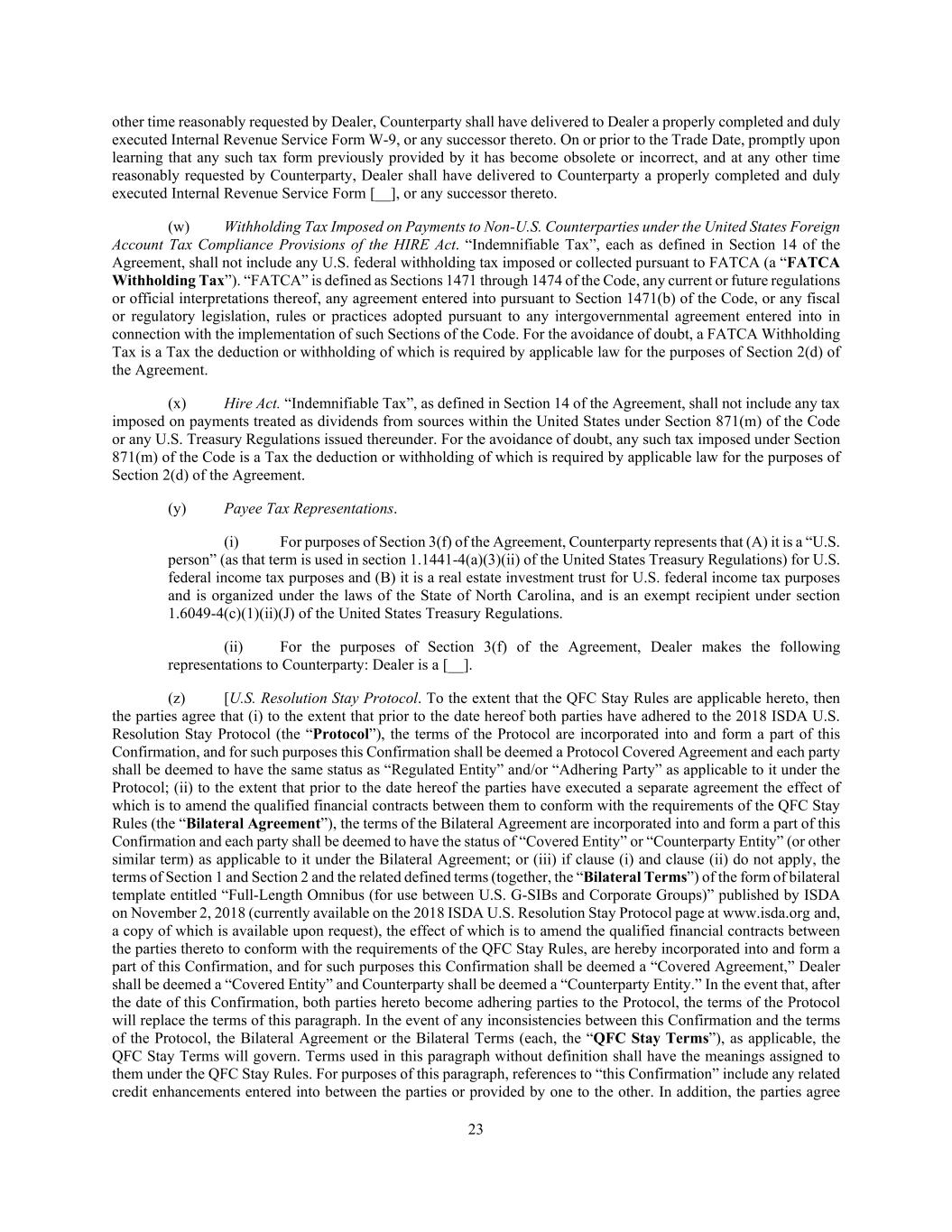 23 other time reasonably requested by Dealer, Counterparty shall have delivered to Dealer a properly completed and duly executed Internal Revenue Service Form W-9, or any successor thereto. On or prior to the Trade Date, promptly upon learning that any such tax form previously provided by it has become obsolete or incorrect, and at any other time reasonably requested by Counterparty, Dealer shall have delivered to Counterparty a properly completed and duly executed Internal Revenue Service Form [__], or any successor thereto. (w) Withholding Tax Imposed on Payments to Non-U.S. Counterparties under the United States Foreign Account Tax Compliance Provisions of the HIRE Act. “Indemnifiable Tax”, each as defined in Section 14 of the Agreement, shall not include any U.S. federal withholding tax imposed or collected pursuant to FATCA (a “FATCA Withholding Tax”). “FATCA” is defined as Sections 1471 through 1474 of the Code, any current or future regulations or official interpretations thereof, any agreement entered into pursuant to Section 1471(b) of the Code, or any fiscal or regulatory legislation, rules or practices adopted pursuant to any intergovernmental agreement entered into in connection with the implementation of such Sections of the Code. For the avoidance of doubt, a FATCA Withholding Tax is a Tax the deduction or withholding of which is required by applicable law for the purposes of Section 2(d) of the Agreement. (x) Hire Act. “Indemnifiable Tax”, as defined in Section 14 of the Agreement, shall not include any tax imposed on payments treated as dividends from sources within the United States under Section 871(m) of the Code or any U.S. Treasury Regulations issued thereunder. For the avoidance of doubt, any such tax imposed under Section 871(m) of the Code is a Tax the deduction or withholding of which is required by applicable law for the purposes of Section 2(d) of the Agreement. (y) Payee Tax Representations. (i) For purposes of Section 3(f) of the Agreement, Counterparty represents that (A) it is a “U.S. person” (as that term is used in section 1.1441-4(a)(3)(ii) of the United States Treasury Regulations) for U.S. federal income tax purposes and (B) it is a real estate investment trust for U.S. federal income tax purposes and is organized under the laws of the State of North Carolina, and is an exempt recipient under section 1.6049-4(c)(1)(ii)(J) of the United States Treasury Regulations. (ii) For the purposes of Section 3(f) of the Agreement, Dealer makes the following representations to Counterparty: Dealer is a [__]. (z) [U.S. Resolution Stay Protocol. To the extent that the QFC Stay Rules are applicable hereto, then the parties agree that (i) to the extent that prior to the date hereof both parties have adhered to the 2018 ISDA U.S. Resolution Stay Protocol (the “Protocol”), the terms of the Protocol are incorporated into and form a part of this Confirmation, and for such purposes this Confirmation shall be deemed a Protocol Covered Agreement and each party shall be deemed to have the same status as “Regulated Entity” and/or “Adhering Party” as applicable to it under the Protocol; (ii) to the extent that prior to the date hereof the parties have executed a separate agreement the effect of which is to amend the qualified financial contracts between them to conform with the requirements of the QFC Stay Rules (the “Bilateral Agreement”), the terms of the Bilateral Agreement are incorporated into and form a part of this Confirmation and each party shall be deemed to have the status of “Covered Entity” or “Counterparty Entity” (or other similar term) as applicable to it under the Bilateral Agreement; or (iii) if clause (i) and clause (ii) do not apply, the terms of Section 1 and Section 2 and the related defined terms (together, the “Bilateral Terms”) of the form of bilateral template entitled “Full-Length Omnibus (for use between U.S. G-SIBs and Corporate Groups)” published by ISDA on November 2, 2018 (currently available on the 2018 ISDA U.S. Resolution Stay Protocol page at www.isda.org and, a copy of which is available upon request), the effect of which is to amend the qualified financial contracts between the parties thereto to conform with the requirements of the QFC Stay Rules, are hereby incorporated into and form a part of this Confirmation, and for such purposes this Confirmation shall be deemed a “Covered Agreement,” Dealer shall be deemed a “Covered Entity” and Counterparty shall be deemed a “Counterparty Entity.” In the event that, after the date of this Confirmation, both parties hereto become adhering parties to the Protocol, the terms of the Protocol will replace the terms of this paragraph. In the event of any inconsistencies between this Confirmation and the terms of the Protocol, the Bilateral Agreement or the Bilateral Terms (each, the “QFC Stay Terms”), as applicable, the QFC Stay Terms will govern. Terms used in this paragraph without definition shall have the meanings assigned to them under the QFC Stay Rules. For purposes of this paragraph, references to “this Confirmation” include any related credit enhancements entered into between the parties or provided by one to the other. In addition, the parties agree