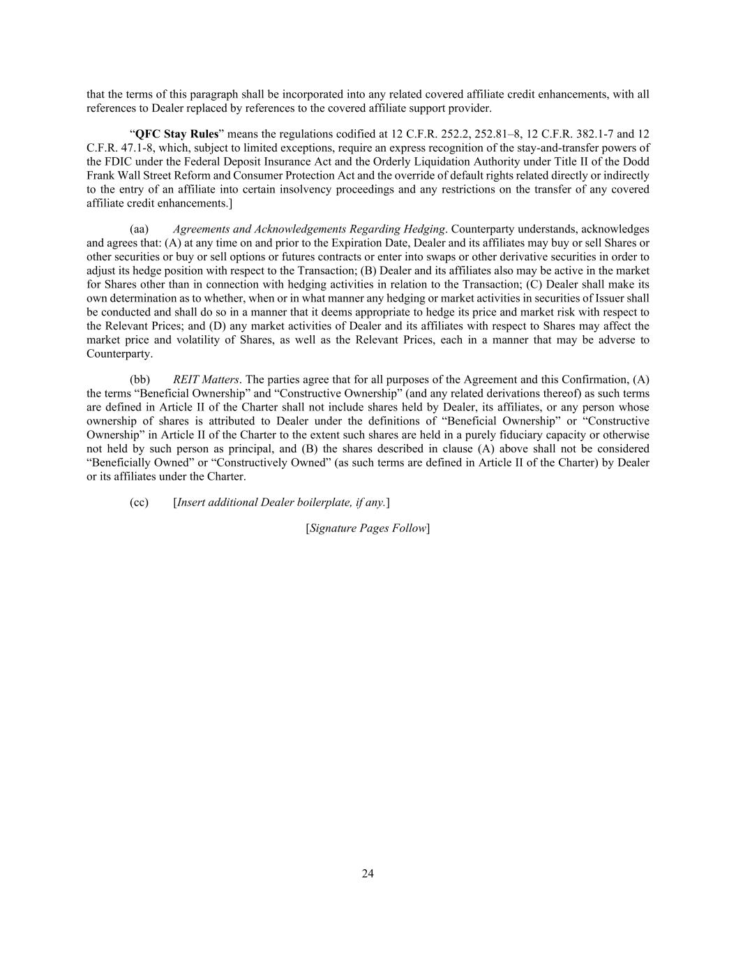24 that the terms of this paragraph shall be incorporated into any related covered affiliate credit enhancements, with all references to Dealer replaced by references to the covered affiliate support provider. “QFC Stay Rules” means the regulations codified at 12 C.F.R. 252.2, 252.81–8, 12 C.F.R. 382.1-7 and 12 C.F.R. 47.1-8, which, subject to limited exceptions, require an express recognition of the stay-and-transfer powers of the FDIC under the Federal Deposit Insurance Act and the Orderly Liquidation Authority under Title II of the Dodd Frank Wall Street Reform and Consumer Protection Act and the override of default rights related directly or indirectly to the entry of an affiliate into certain insolvency proceedings and any restrictions on the transfer of any covered affiliate credit enhancements.] (aa) Agreements and Acknowledgements Regarding Hedging. Counterparty understands, acknowledges and agrees that: (A) at any time on and prior to the Expiration Date, Dealer and its affiliates may buy or sell Shares or other securities or buy or sell options or futures contracts or enter into swaps or other derivative securities in order to adjust its hedge position with respect to the Transaction; (B) Dealer and its affiliates also may be active in the market for Shares other than in connection with hedging activities in relation to the Transaction; (C) Dealer shall make its own determination as to whether, when or in what manner any hedging or market activities in securities of Issuer shall be conducted and shall do so in a manner that it deems appropriate to hedge its price and market risk with respect to the Relevant Prices; and (D) any market activities of Dealer and its affiliates with respect to Shares may affect the market price and volatility of Shares, as well as the Relevant Prices, each in a manner that may be adverse to Counterparty. (bb) REIT Matters. The parties agree that for all purposes of the Agreement and this Confirmation, (A) the terms “Beneficial Ownership” and “Constructive Ownership” (and any related derivations thereof) as such terms are defined in Article II of the Charter shall not include shares held by Dealer, its affiliates, or any person whose ownership of shares is attributed to Dealer under the definitions of “Beneficial Ownership” or “Constructive Ownership” in Article II of the Charter to the extent such shares are held in a purely fiduciary capacity or otherwise not held by such person as principal, and (B) the shares described in clause (A) above shall not be considered “Beneficially Owned” or “Constructively Owned” (as such terms are defined in Article II of the Charter) by Dealer or its affiliates under the Charter. (cc) [Insert additional Dealer boilerplate, if any.] [Signature Pages Follow]