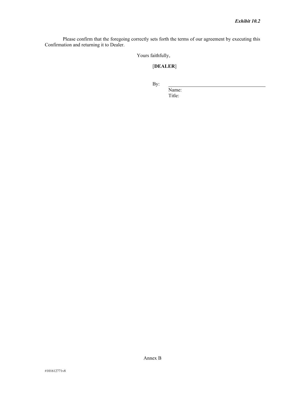 Exhibit 10.2 Annex B #101612771v8 Please confirm that the foregoing correctly sets forth the terms of our agreement by executing this Confirmation and returning it to Dealer. Yours faithfully, [DEALER] By: Name: Title: