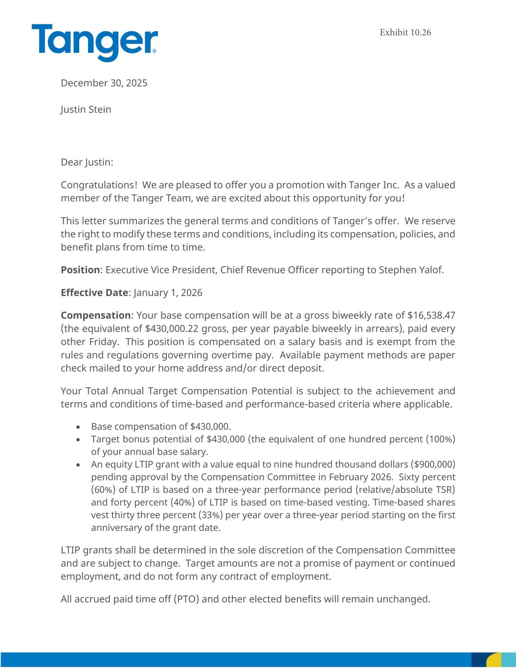 December 30, 2025 Justin Stein Dear Justin: Congratulations! We are pleased to offer you a promotion with Tanger Inc. As a valued member of the Tanger Team, we are excited about this opportunity for you! This letter summarizes the general terms and conditions of Tanger’s offer. We reserve the right to modify these terms and conditions, including its compensation, policies, and benefit plans from time to time. Position: Executive Vice President, Chief Revenue Officer reporting to Stephen Yalof. Effective Date: January 1, 2026 Compensation: Your base compensation will be at a gross biweekly rate of $16,538.47 (the equivalent of $430,000.22 gross, per year payable biweekly in arrears), paid every other Friday. This position is compensated on a salary basis and is exempt from the rules and regulations governing overtime pay. Available payment methods are paper check mailed to your home address and/or direct deposit. Your Total Annual Target Compensation Potential is subject to the achievement and terms and conditions of time-based and performance-based criteria where applicable. • Base compensation of $430,000. • Target bonus potential of $430,000 (the equivalent of one hundred percent (100%) of your annual base salary. • An equity LTIP grant with a value equal to nine hundred thousand dollars ($900,000) pending approval by the Compensation Committee in February 2026. Sixty percent (60%) of LTIP is based on a three-year performance period (relative/absolute TSR) and forty percent (40%) of LTIP is based on time-based vesting. Time-based shares vest thirty three percent (33%) per year over a three-year period starting on the first anniversary of the grant date. LTIP grants shall be determined in the sole discretion of the Compensation Committee and are subject to change. Target amounts are not a promise of payment or continued employment, and do not form any contract of employment. All accrued paid time off (PTO) and other elected benefits will remain unchanged. Exhibit 10.26
