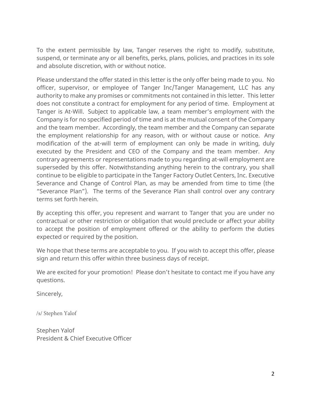 2 To the extent permissible by law, Tanger reserves the right to modify, substitute, suspend, or terminate any or all benefits, perks, plans, policies, and practices in its sole and absolute discretion, with or without notice. Please understand the offer stated in this letter is the only offer being made to you. No officer, supervisor, or employee of Tanger Inc/Tanger Management, LLC has any authority to make any promises or commitments not contained in this letter. This letter does not constitute a contract for employment for any period of time. Employment at Tanger is At-Will. Subject to applicable law, a team member’s employment with the Company is for no specified period of time and is at the mutual consent of the Company and the team member. Accordingly, the team member and the Company can separate the employment relationship for any reason, with or without cause or notice. Any modification of the at-will term of employment can only be made in writing, duly executed by the President and CEO of the Company and the team member. Any contrary agreements or representations made to you regarding at-will employment are superseded by this offer. Notwithstanding anything herein to the contrary, you shall continue to be eligible to participate in the Tanger Factory Outlet Centers, Inc. Executive Severance and Change of Control Plan, as may be amended from time to time (the “Severance Plan”). The terms of the Severance Plan shall control over any contrary terms set forth herein. By accepting this offer, you represent and warrant to Tanger that you are under no contractual or other restriction or obligation that would preclude or affect your ability to accept the position of employment offered or the ability to perform the duties expected or required by the position. We hope that these terms are acceptable to you. If you wish to accept this offer, please sign and return this offer within three business days of receipt. We are excited for your promotion! Please don’t hesitate to contact me if you have any questions. Sincerely, Stephen Yalof President & Chief Executive Officer /s/ Stephen Yalof