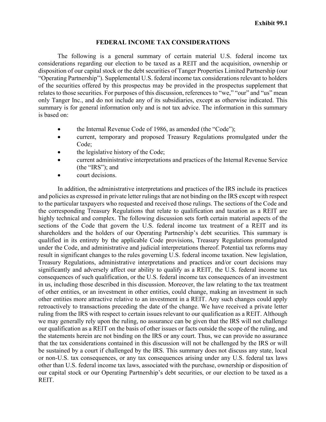 Exhibit 99.1 FEDERAL INCOME TAX CONSIDERATIONS The following is a general summary of certain material U.S. federal income tax considerations regarding our election to be taxed as a REIT and the acquisition, ownership or disposition of our capital stock or the debt securities of Tanger Properties Limited Partnership (our “Operating Partnership”). Supplemental U.S. federal income tax considerations relevant to holders of the securities offered by this prospectus may be provided in the prospectus supplement that relates to those securities. For purposes of this discussion, references to “we,” “our” and “us” mean only Tanger Inc., and do not include any of its subsidiaries, except as otherwise indicated. This summary is for general information only and is not tax advice. The information in this summary is based on: the Internal Revenue Code of 1986, as amended (the “Code”); current, temporary and proposed Treasury Regulations promulgated under the Code; the legislative history of the Code; current administrative interpretations and practices of the Internal Revenue Service (the “IRS”); and court decisions. In addition, the administrative interpretations and practices of the IRS include its practices and policies as expressed in private letter rulings that are not binding on the IRS except with respect to the particular taxpayers who requested and received those rulings. The sections of the Code and the corresponding Treasury Regulations that relate to qualification and taxation as a REIT are highly technical and complex. The following discussion sets forth certain material aspects of the sections of the Code that govern the U.S. federal income tax treatment of a REIT and its shareholders and the holders of our Operating Partnership’s debt securities. This summary is qualified in its entirety by the applicable Code provisions, Treasury Regulations promulgated under the Code, and administrative and judicial interpretations thereof. Potential tax reforms may result in significant changes to the rules governing U.S. federal income taxation. New legislation, Treasury Regulations, administrative interpretations and practices and/or court decisions may significantly and adversely affect our ability to qualify as a REIT, the U.S. federal income tax consequences of such qualification, or the U.S. federal income tax consequences of an investment in us, including those described in this discussion. Moreover, the law relating to the tax treatment of other entities, or an investment in other entities, could change, making an investment in such other entities more attractive relative to an investment in a REIT. Any such changes could apply retroactively to transactions preceding the date of the change. We have received a private letter ruling from the IRS with respect to certain issues relevant to our qualification as a REIT. Although we may generally rely upon the ruling, no assurance can be given that the IRS will not challenge our qualification as a REIT on the basis of other issues or facts outside the scope of the ruling, and the statements herein are not binding on the IRS or any court. Thus, we can provide no assurance that the tax considerations contained in this discussion will not be challenged by the IRS or will be sustained by a court if challenged by the IRS. This summary does not discuss any state, local or non-U.S. tax consequences, or any tax consequences arising under any U.S. federal tax laws other than U.S. federal income tax laws, associated with the purchase, ownership or disposition of our capital stock or our Operating Partnership’s debt securities, or our election to be taxed as a REIT.