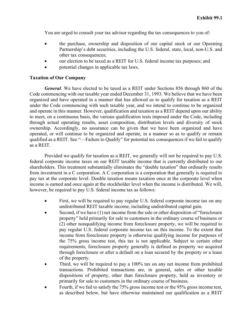 Exhibit 99.1 You are urged to consult your tax advisor regarding the tax consequences to you of: the purchase, ownership and disposition of our capital stock or our Operating Partnership’s debt securities, including the U.S. federal, state, local, non-U.S. and other tax consequences; our election to be taxed as a REIT for U.S. federal income tax purposes; and potential changes in applicable tax laws. Taxation of Our Company General. We have elected to be taxed as a REIT under Sections 856 through 860 of the Code commencing with our taxable year ended December 31, 1993. We believe that we have been organized and have operated in a manner that has allowed us to qualify for taxation as a REIT under the Code commencing with such taxable year, and we intend to continue to be organized and operate in this manner. However, qualification and taxation as a REIT depend upon our ability to meet, on a continuous basis, the various qualification tests imposed under the Code, including through actual operating results, asset composition, distribution levels and diversity of stock ownership. Accordingly, no assurance can be given that we have been organized and have operated, or will continue to be organized and operate, in a manner so as to qualify or remain qualified as a REIT. See “—Failure to Qualify” for potential tax consequences if we fail to qualify as a REIT. Provided we qualify for taxation as a REIT, we generally will not be required to pay U.S. federal corporate income taxes on our REIT taxable income that is currently distributed to our shareholders. This treatment substantially eliminates the “double taxation” that ordinarily results from investment in a C corporation. A C corporation is a corporation that generally is required to pay tax at the corporate level. Double taxation means taxation once at the corporate level when income is earned and once again at the stockholder level when the income is distributed. We will, however, be required to pay U.S. federal income tax as follows: First, we will be required to pay regular U.S. federal corporate income tax on any undistributed REIT taxable income, including undistributed capital gain. Second, if we have (1) net income from the sale or other disposition of “foreclosure property” held primarily for sale to customers in the ordinary course of business or (2) other nonqualifying income from foreclosure property, we will be required to pay regular U.S. federal corporate income tax on this income. To the extent that income from foreclosure property is otherwise qualifying income for purposes of the 75% gross income test, this tax is not applicable. Subject to certain other requirements, foreclosure property generally is defined as property we acquired through foreclosure or after a default on a loan secured by the property or a lease of the property. Third, we will be required to pay a 100% tax on any net income from prohibited transactions. Prohibited transactions are, in general, sales or other taxable dispositions of property, other than foreclosure property, held as inventory or primarily for sale to customers in the ordinary course of business. Fourth, if we fail to satisfy the 75% gross income test or the 95% gross income test, as described below, but have otherwise maintained our qualification as a REIT